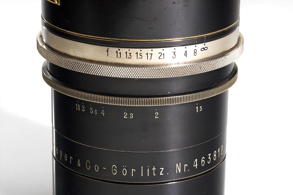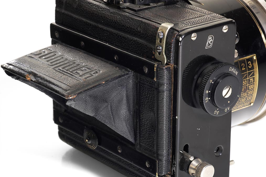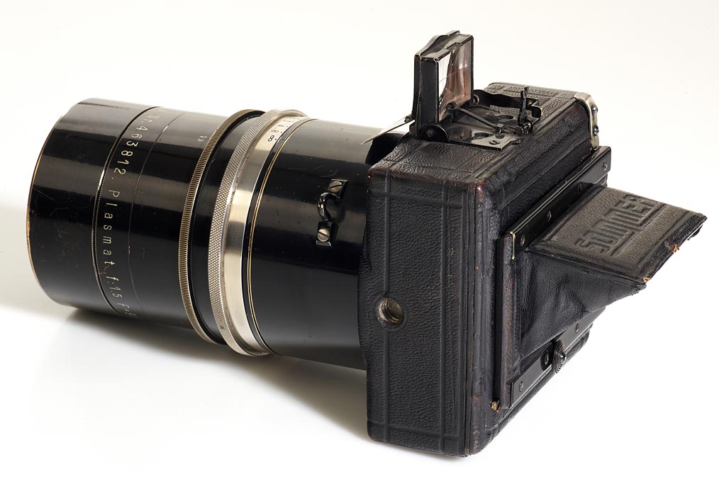 4.5x6cm, almost unknown, very interesting camera for available light photography, focal plane shutter, folding Galilean finder, original ground glass adapter, very fast Meyer Plasmat 1.5/9cm no.463812 (an uncommon six-element symmetrical double Gauss design) in helicoid focusing mount, clean lenses, cap. The camera is very similar to the Ermanox, but with a lens twice as fast. The camera was produced by Bernhard Sommer, Dresden and to our knowledge never offered in auction before.