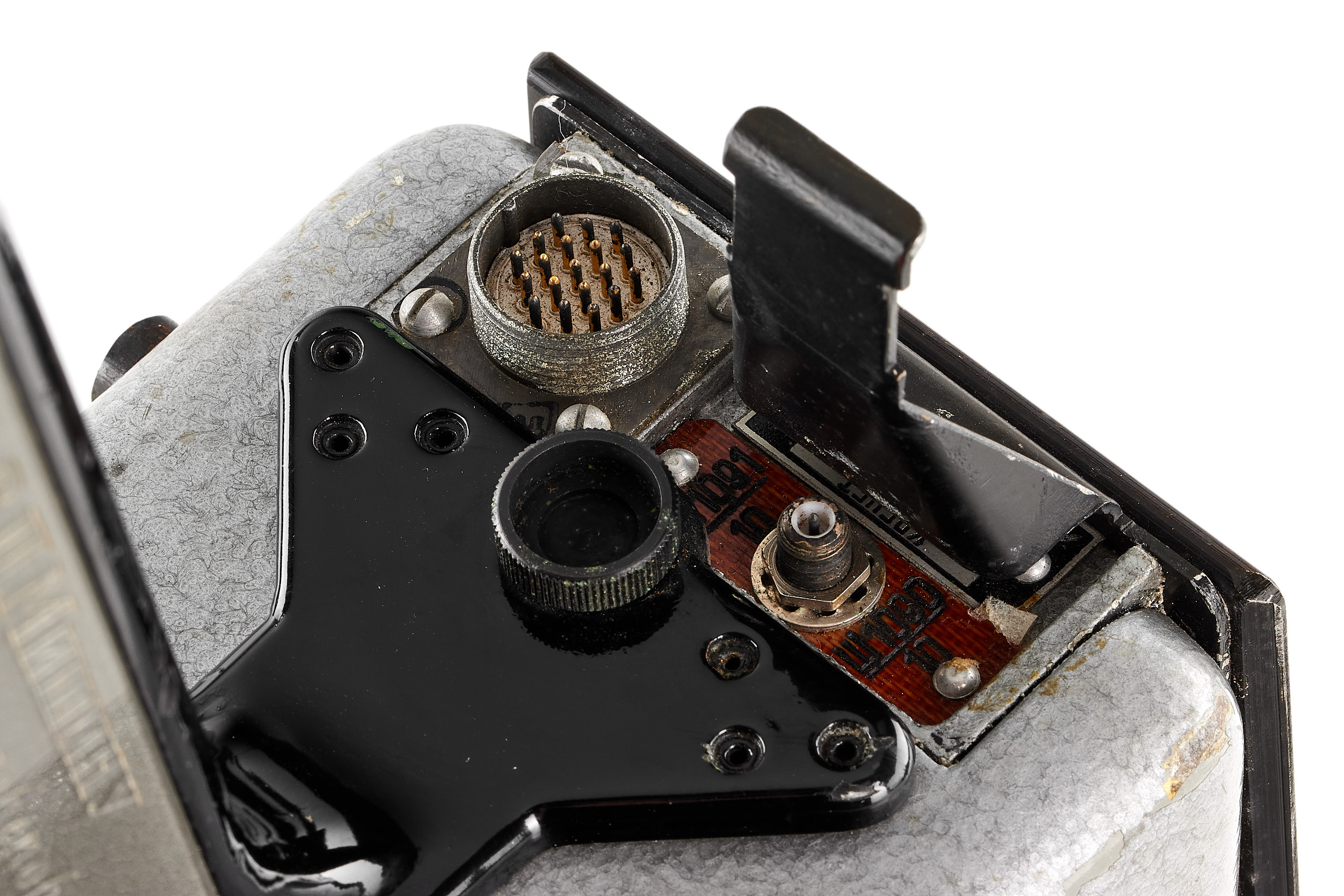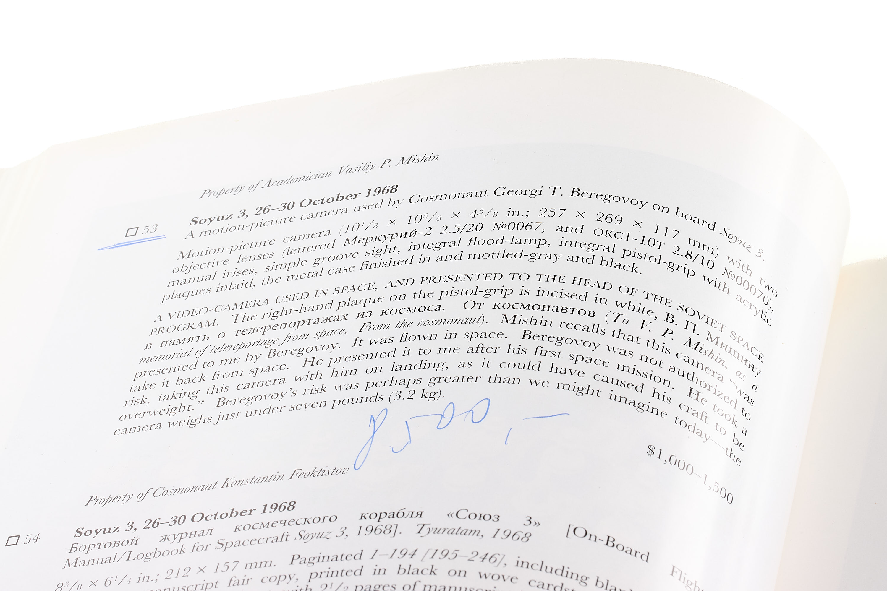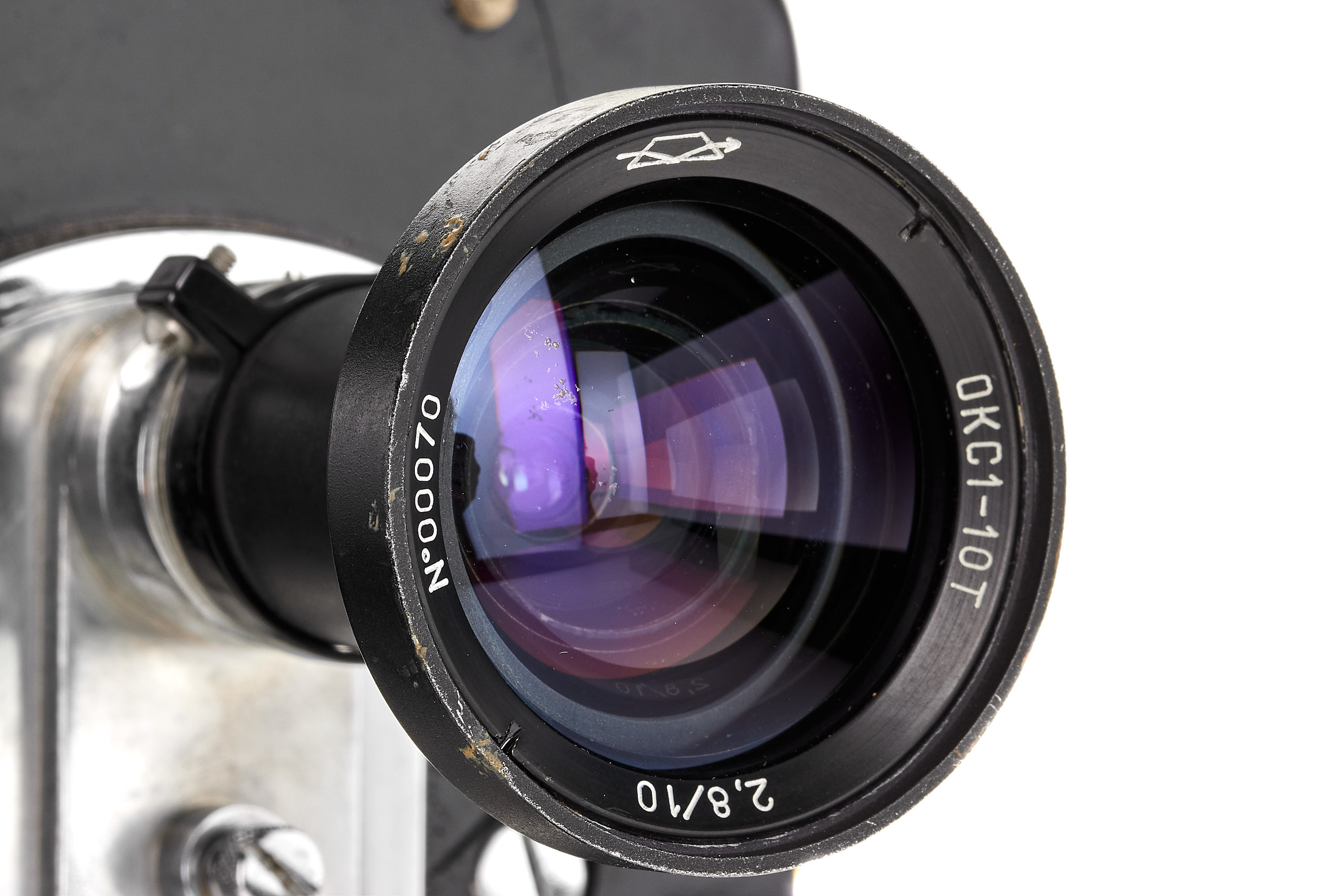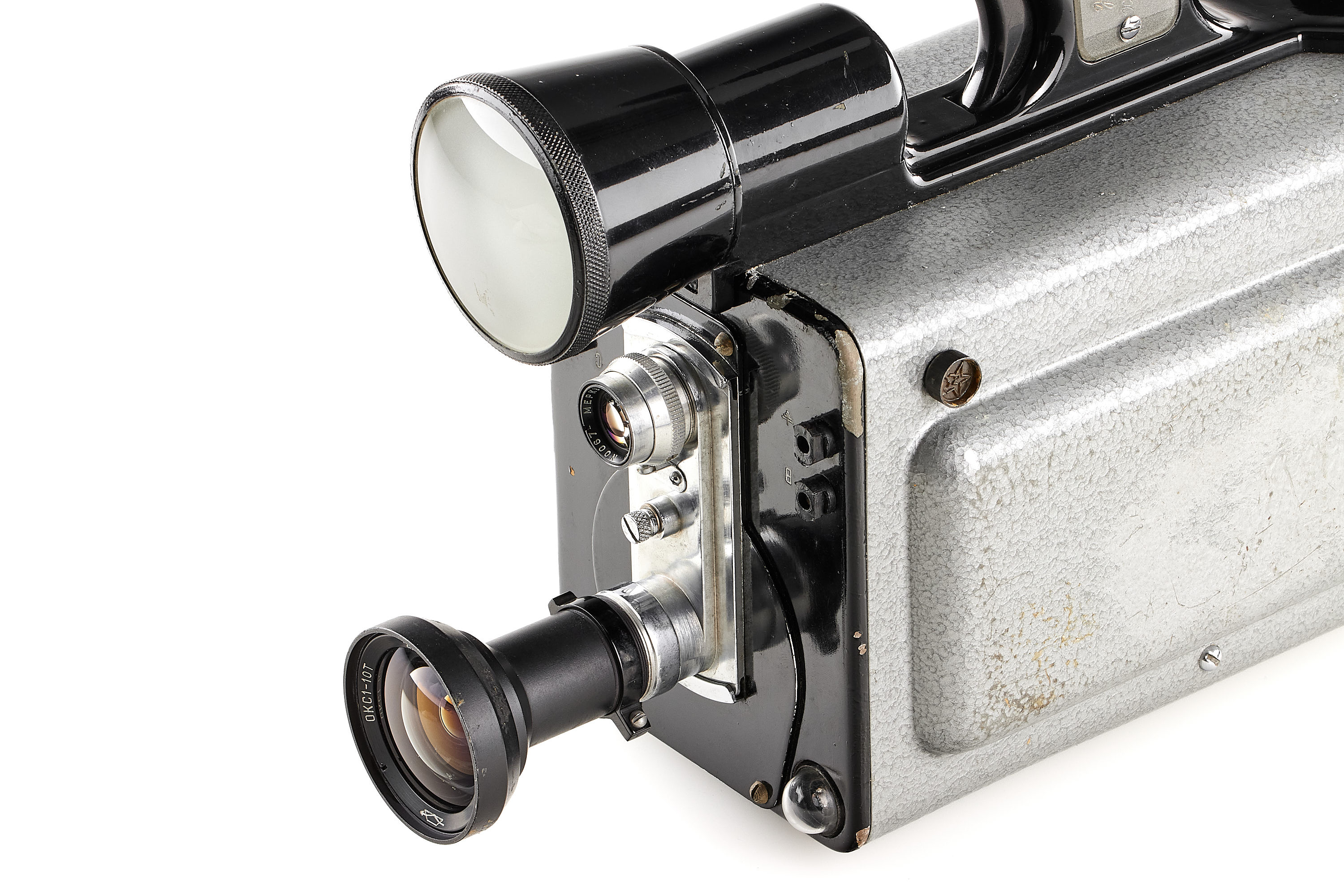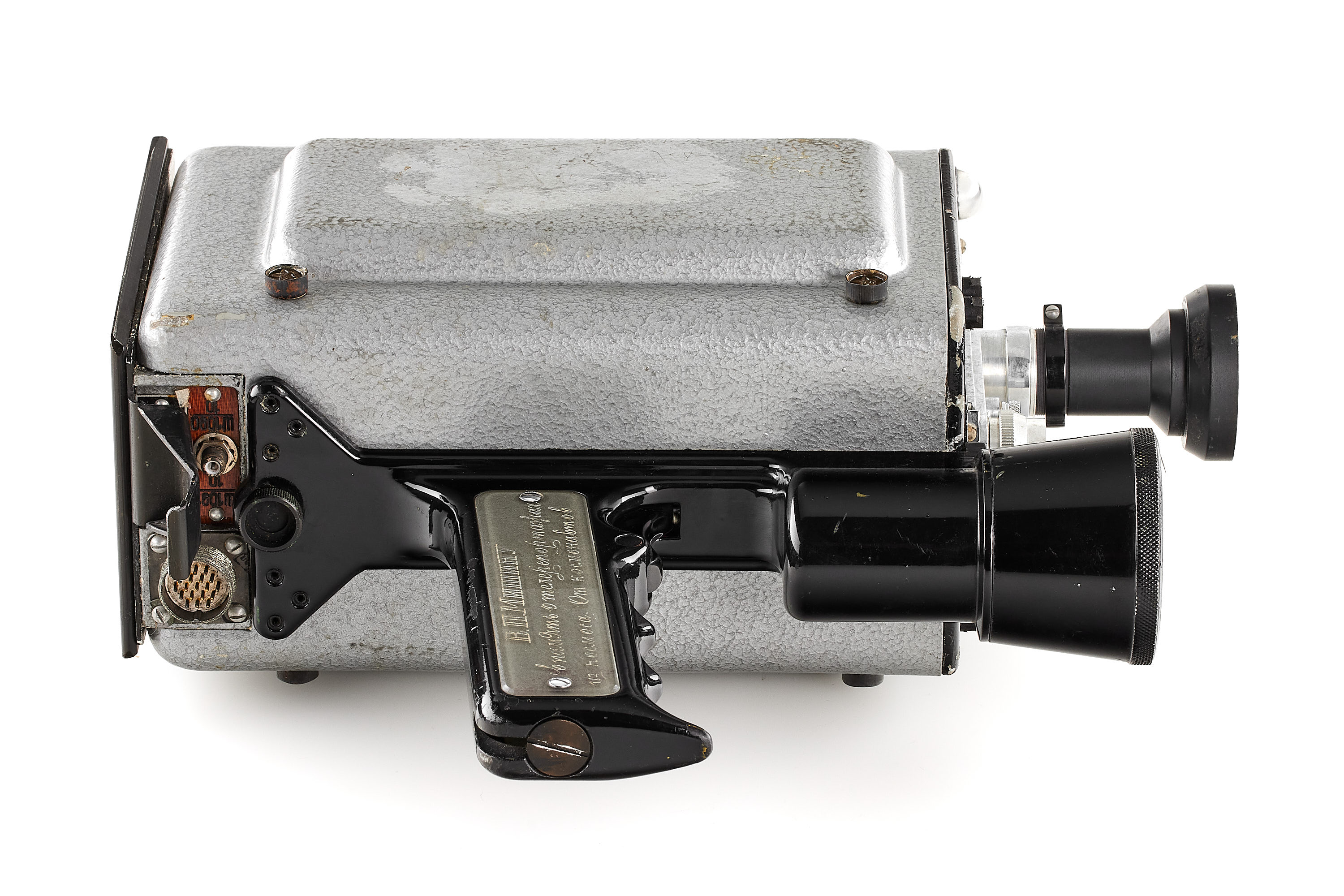 A motion-picture camera used by Cosmonaut Georgi T. Beregovoy on board Soyuz 3. Proposed in 1993 at the famous 'Russian Space History' auction in New York, together with other major historical artefacts from the early soviet space odyssey. The camera is mounted with a Mercury-2 2.5/50mm no.0067 and an Oks1-10T 2.8/10mm no.00070 integrated flood-lamp and shooting indicator light. The right-hand plaque on the grip is incised in white (in Russian) 'To V.P. Mishin, as a memorial of telereportage from space. From the cosmonaut'. Mishin recalls that Beregovoy was not authorized to take it back from space, he took a risk, taking it with him on landing, as it could have caused his craft to be overweight, the camera weighs around 3kg! In good condition, operation not tested, and comes with the auction catalogue and newspaper articles from the period of the auction.