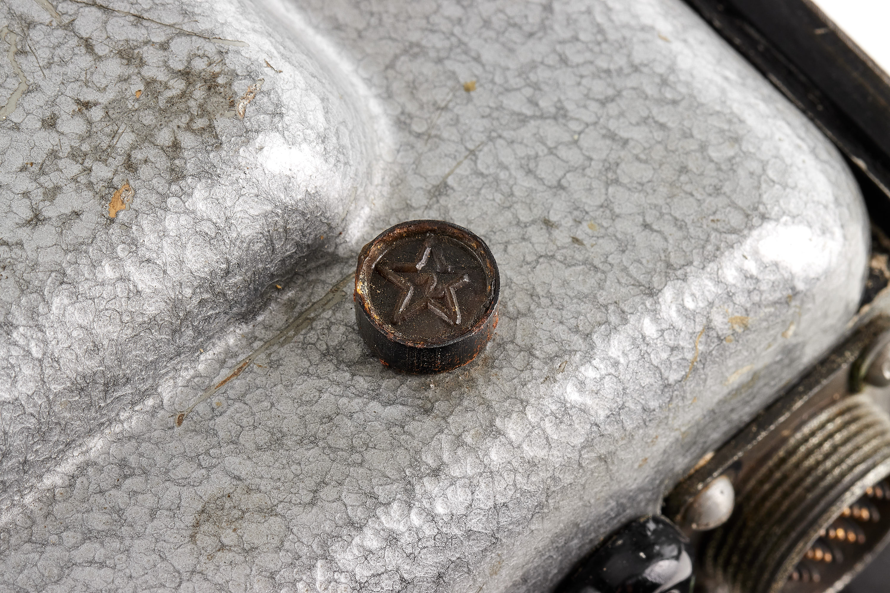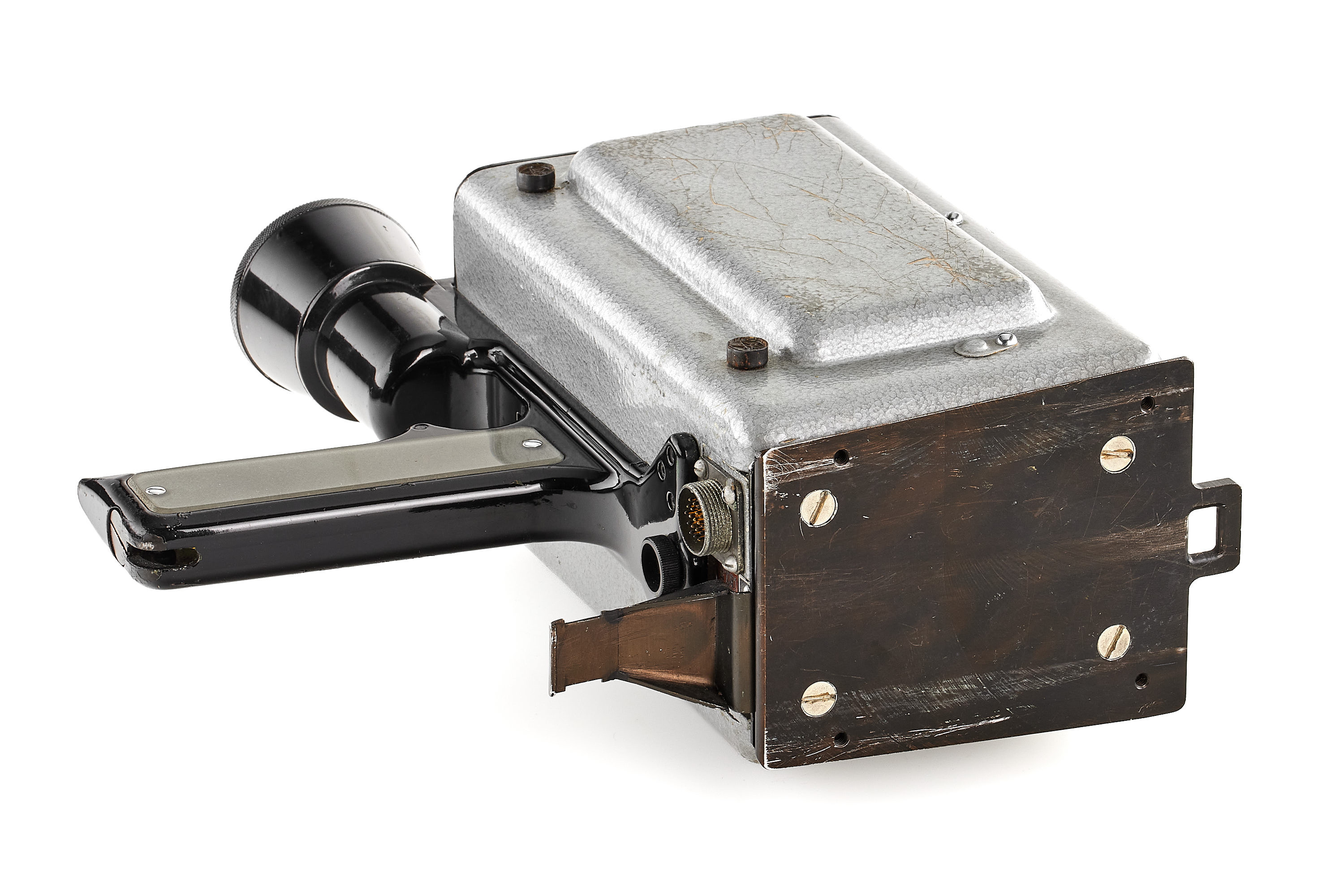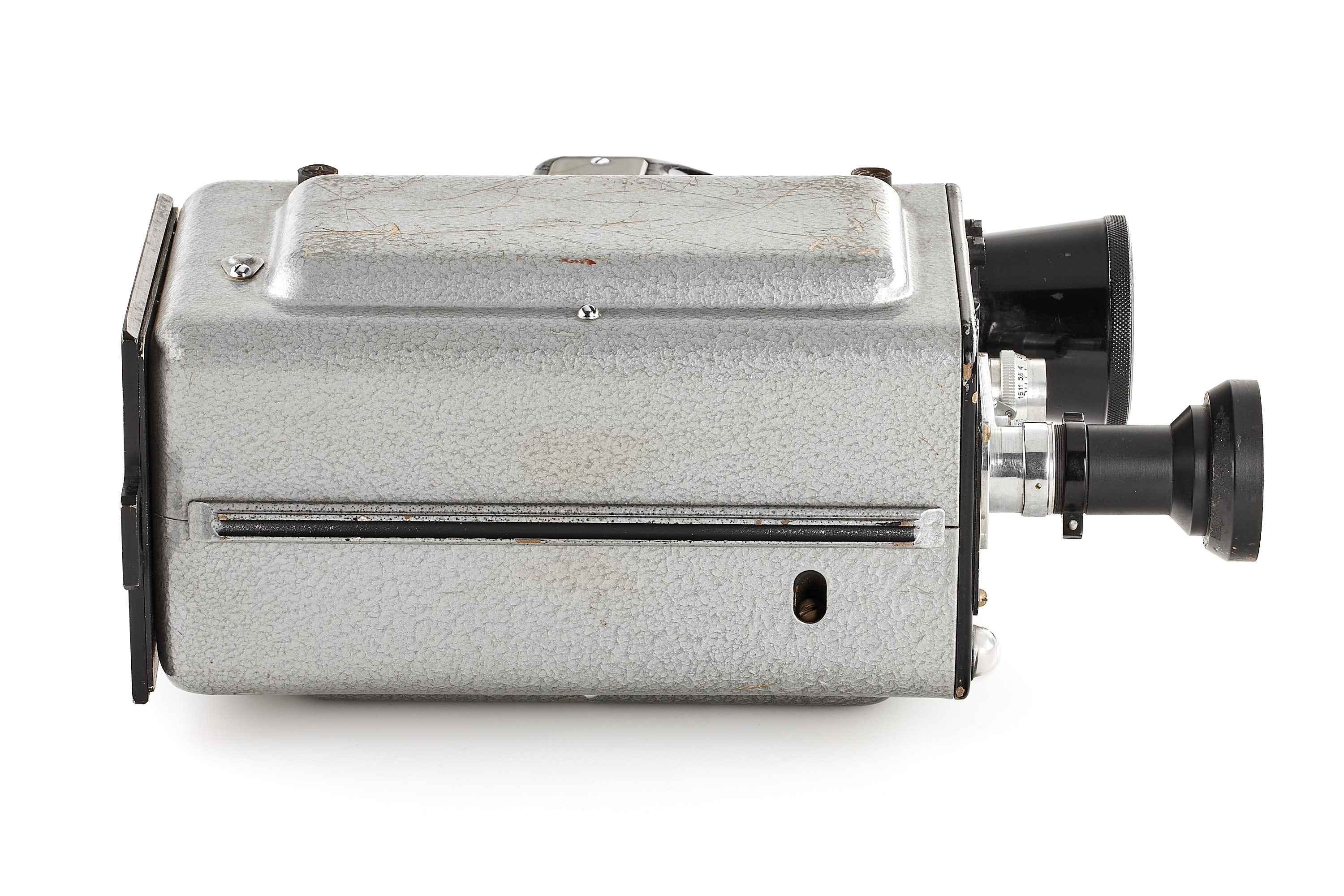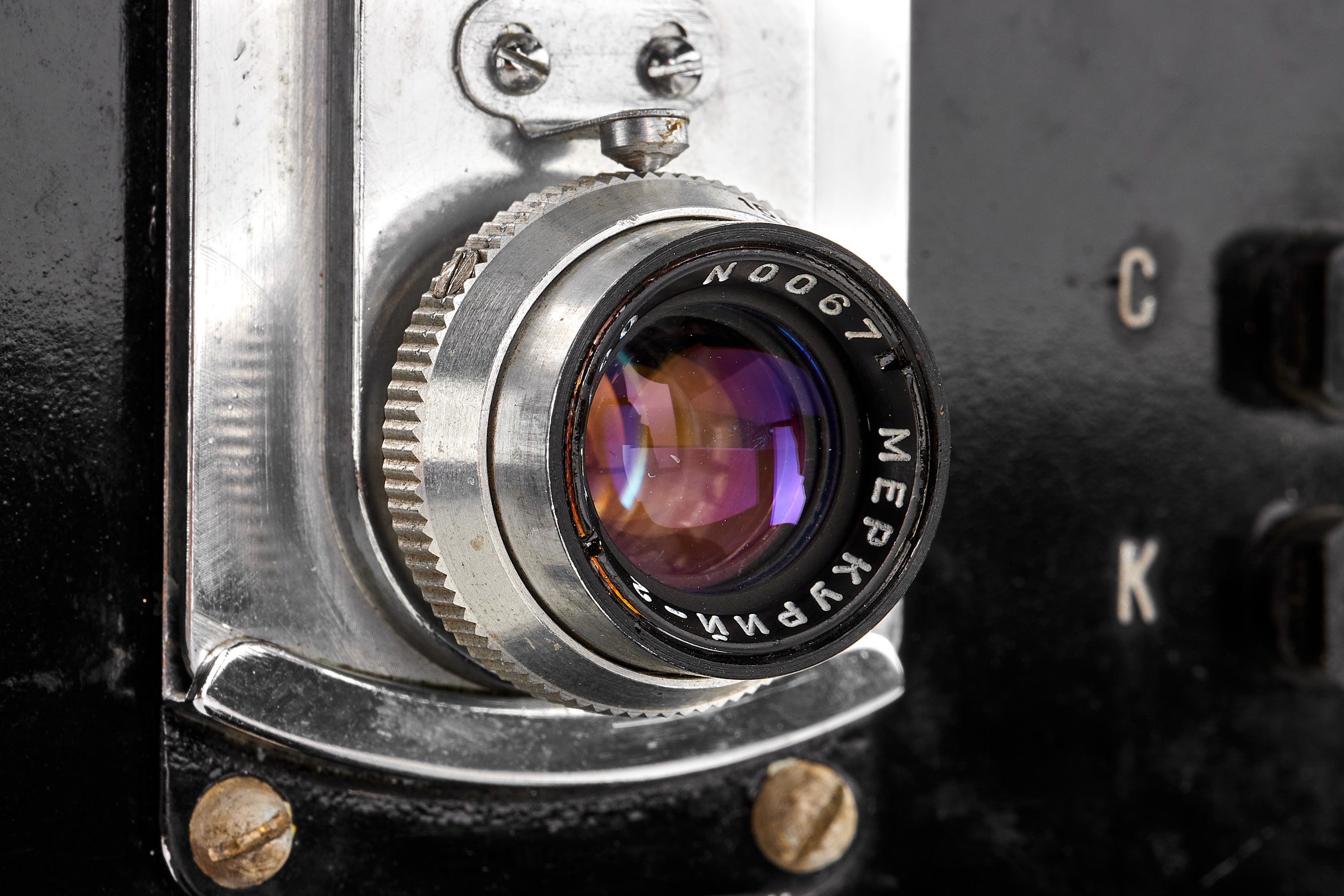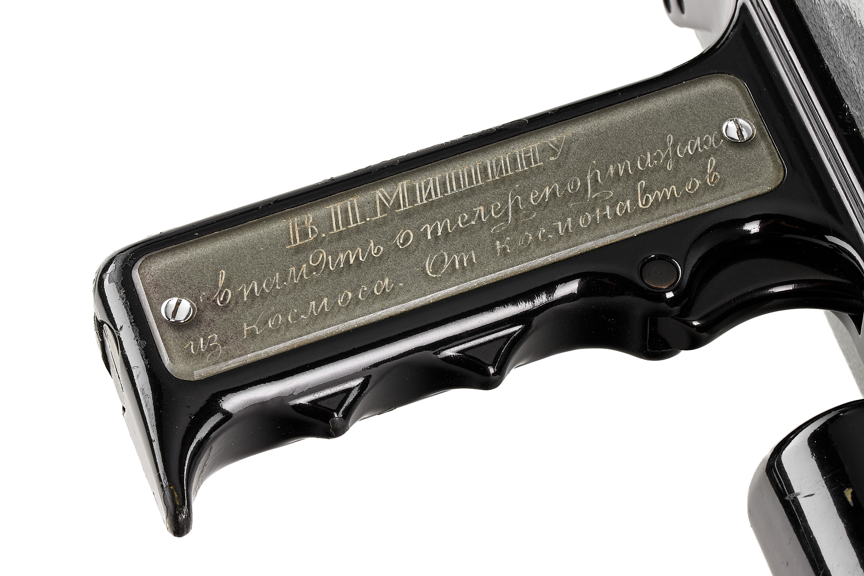 A motion-picture camera used by Cosmonaut Georgi T. Beregovoy on board Soyuz 3. Proposed in 1993 at the famous 'Russian Space History' auction in New York, together with other major historical artefacts from the early soviet space odyssey. The camera is mounted with a Mercury-2 2.5/50mm no.0067 and an Oks1-10T 2.8/10mm no.00070 integrated flood-lamp and shooting indicator light. The right-hand plaque on the grip is incised in white (in Russian) 'To V.P. Mishin, as a memorial of telereportage from space. From the cosmonaut'. Mishin recalls that Beregovoy was not authorized to take it back from space, he took a risk, taking it with him on landing, as it could have caused his craft to be overweight, the camera weighs around 3kg! In good condition, operation not tested, and comes with the auction catalogue and newspaper articles from the period of the auction.