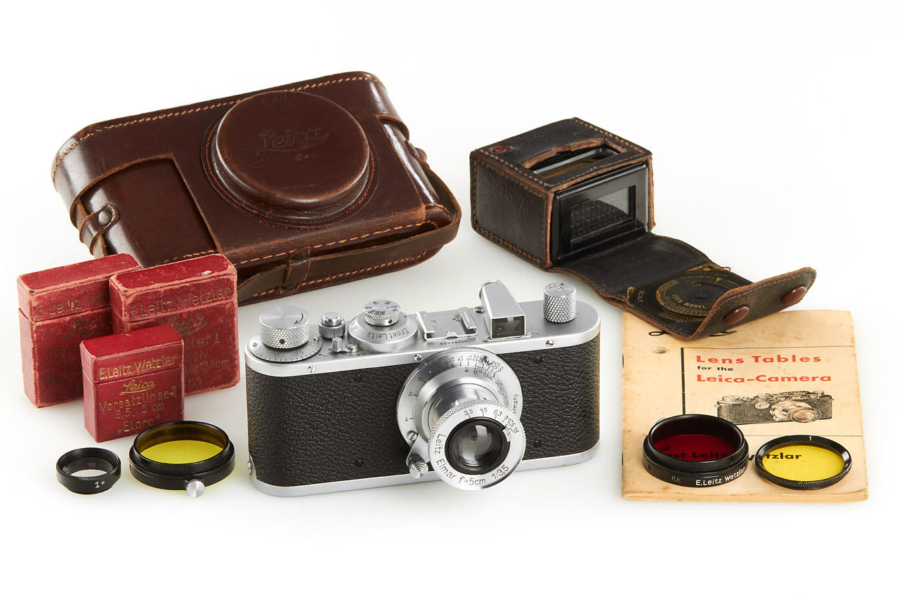 in very good working condition, with matching 1938 chrome Elmar 3.5/5cm no.461479, original close-up, red and yellow filters (all three in red maker's boxes), Lens Tables in English, everready case and very rare Metrovick light meter with calculating dial marked 'Leica Model'