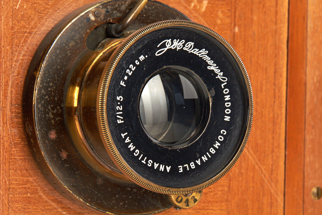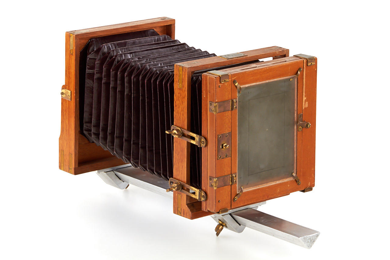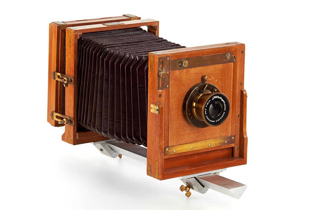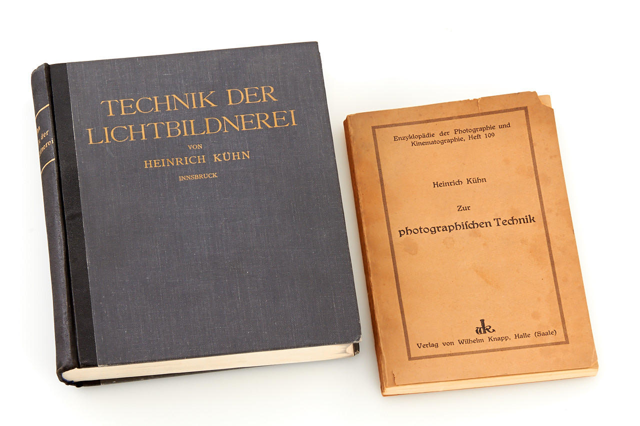 9x12cm monorail camera designed by the famous Austrian photographer Heinrich Kühn who also designed the Imagon lens, in excellent original condition, red leather bellows, Dallmeyer London Combinable Anastigmat 12.5/22cm no.150558, one double film holder, with two books by Heinrich Kühn: 'Zur photographishen Technik' (1926), 'Technik der Lichtbildnerei' (1921)