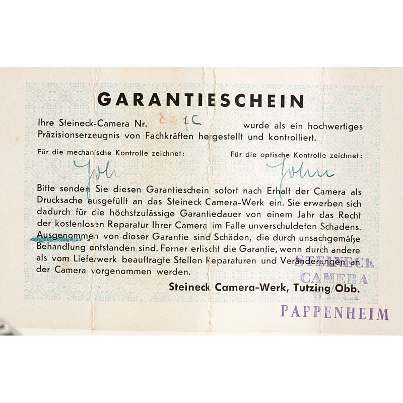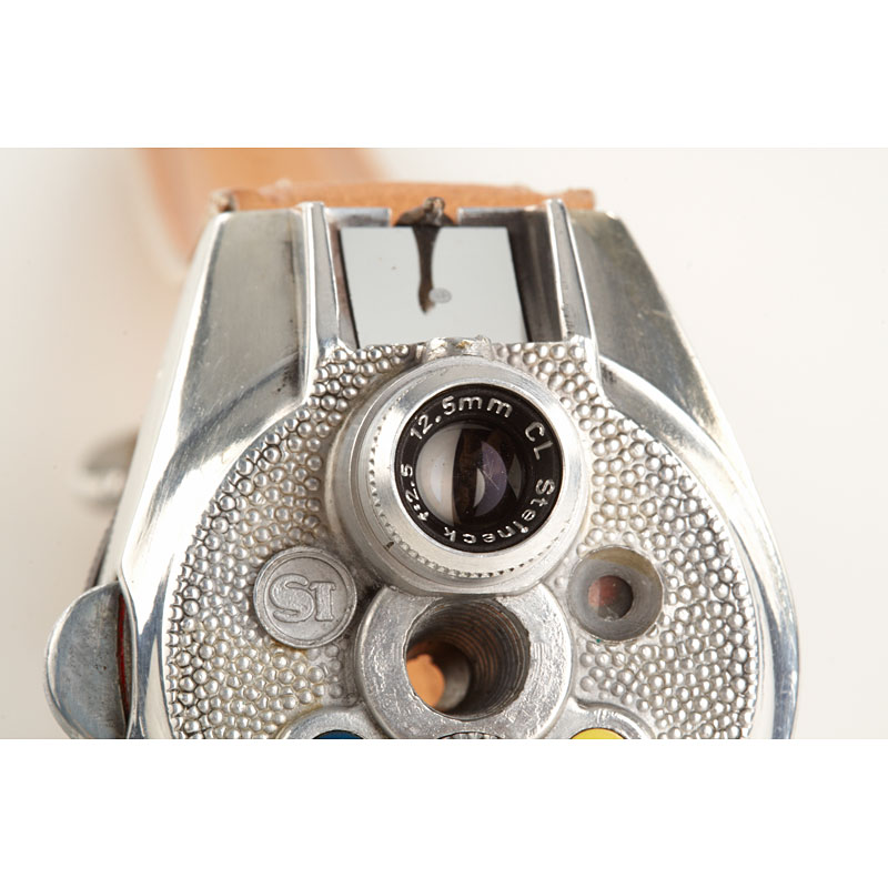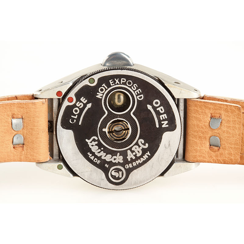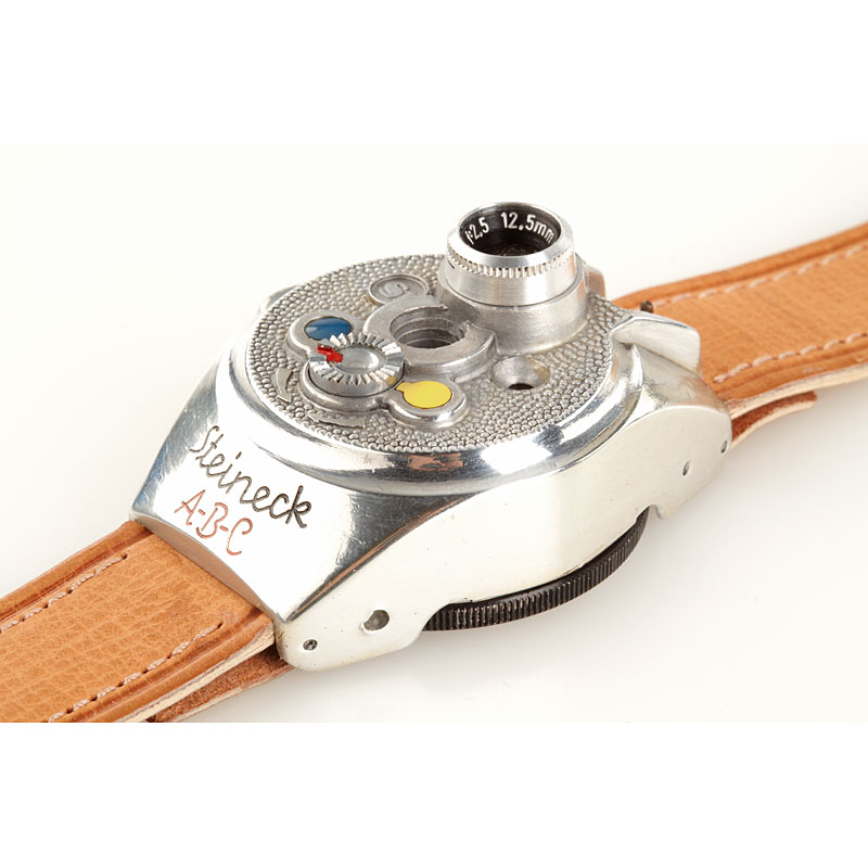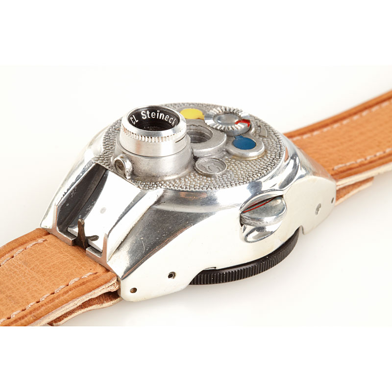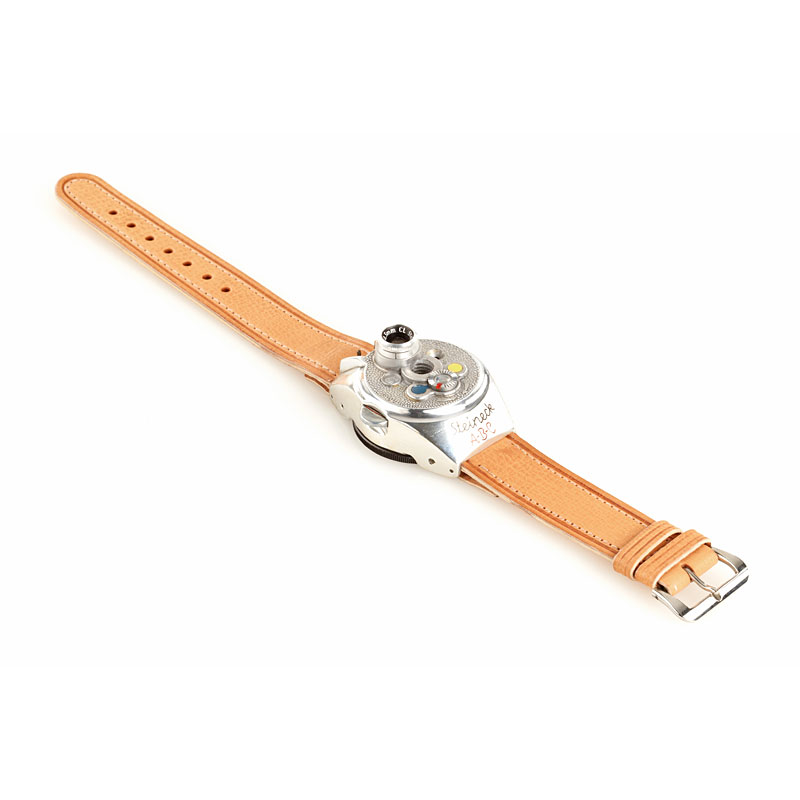 near mint wrist watch camera with brown strap, warranty card and instructions