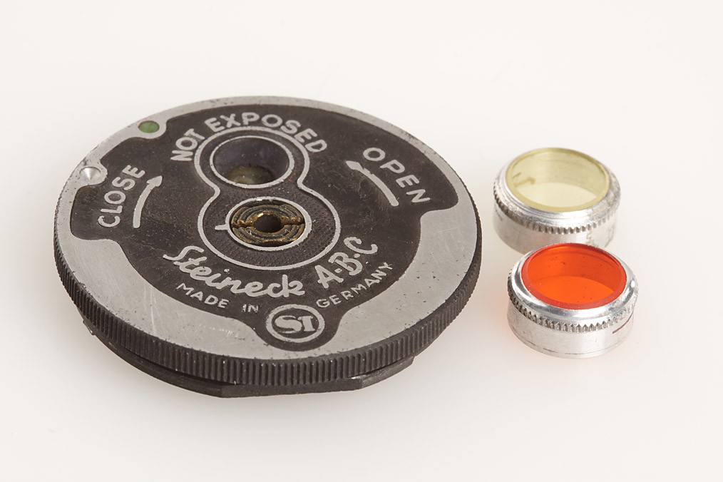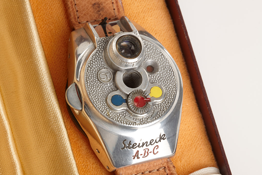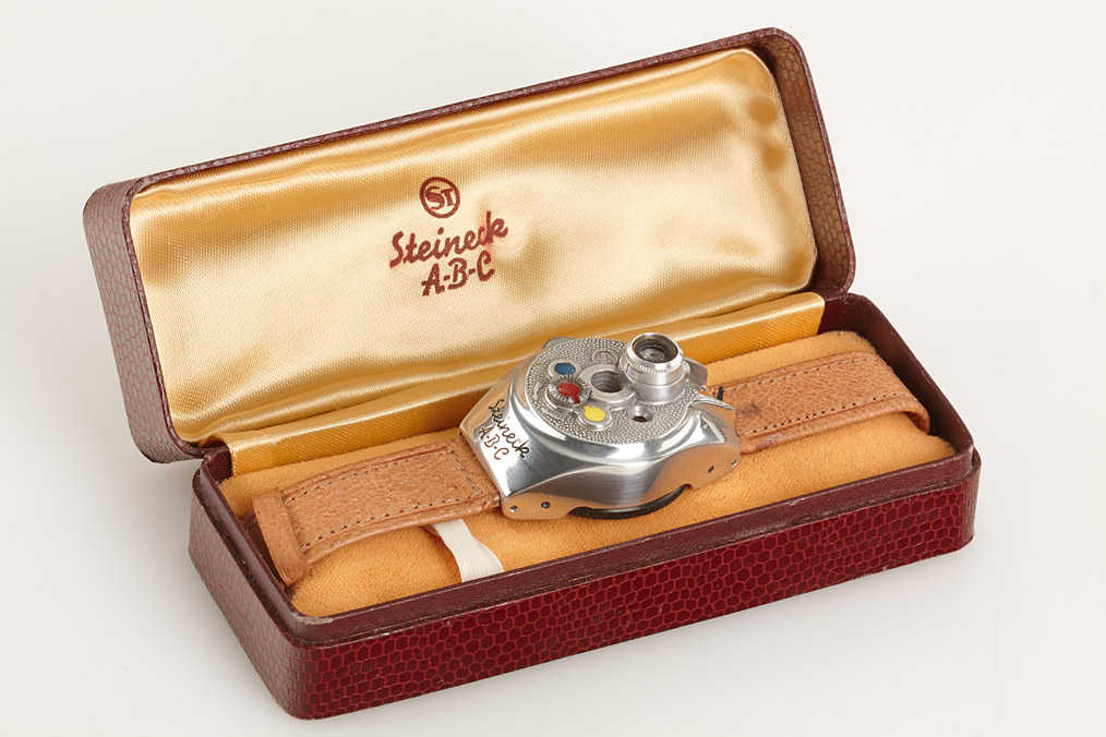 near mint wrist watch camera with brown strap, instructions, presentation box, spare magazine and very rare yellow and orange filter