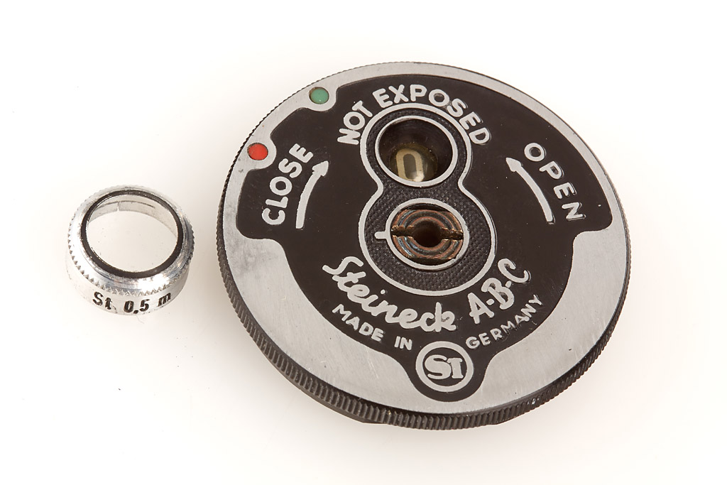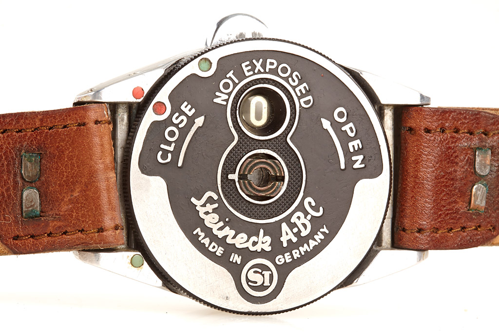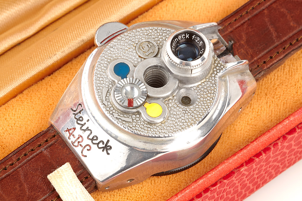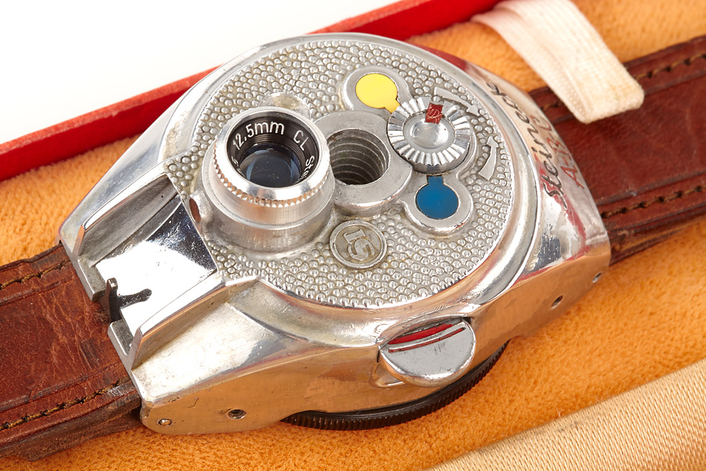 near mint wrist watch camera with brown strap and spare magazine in presentation box