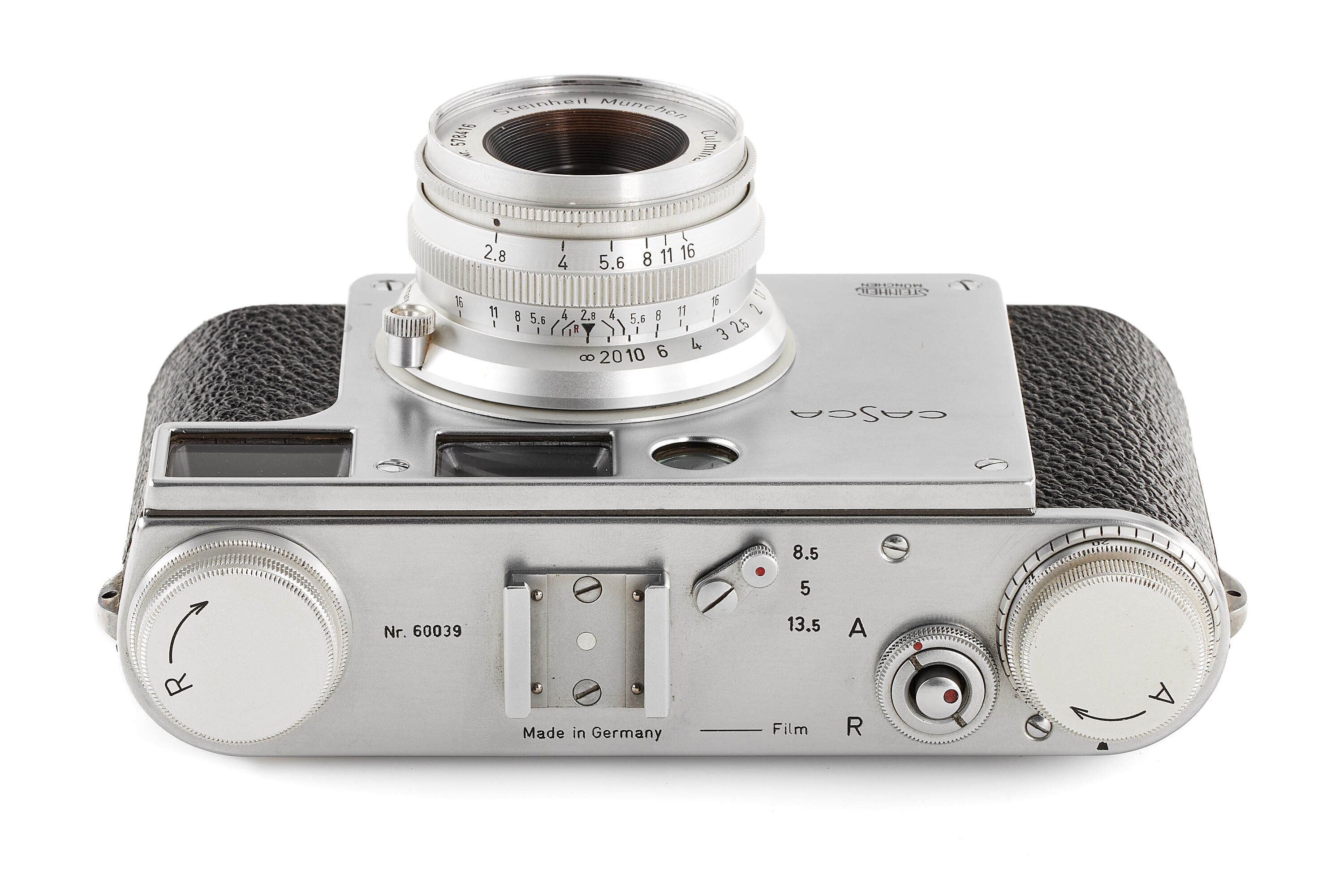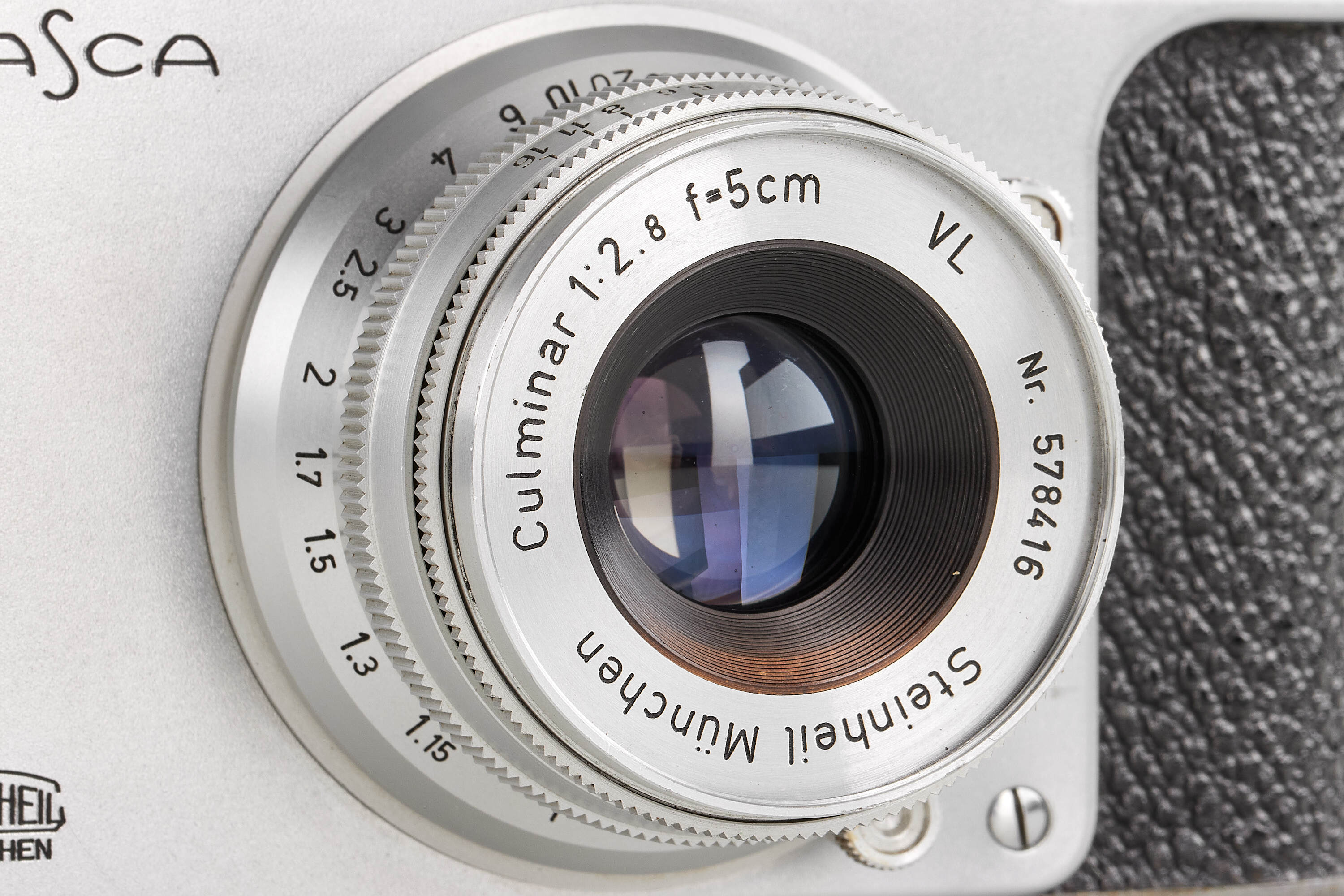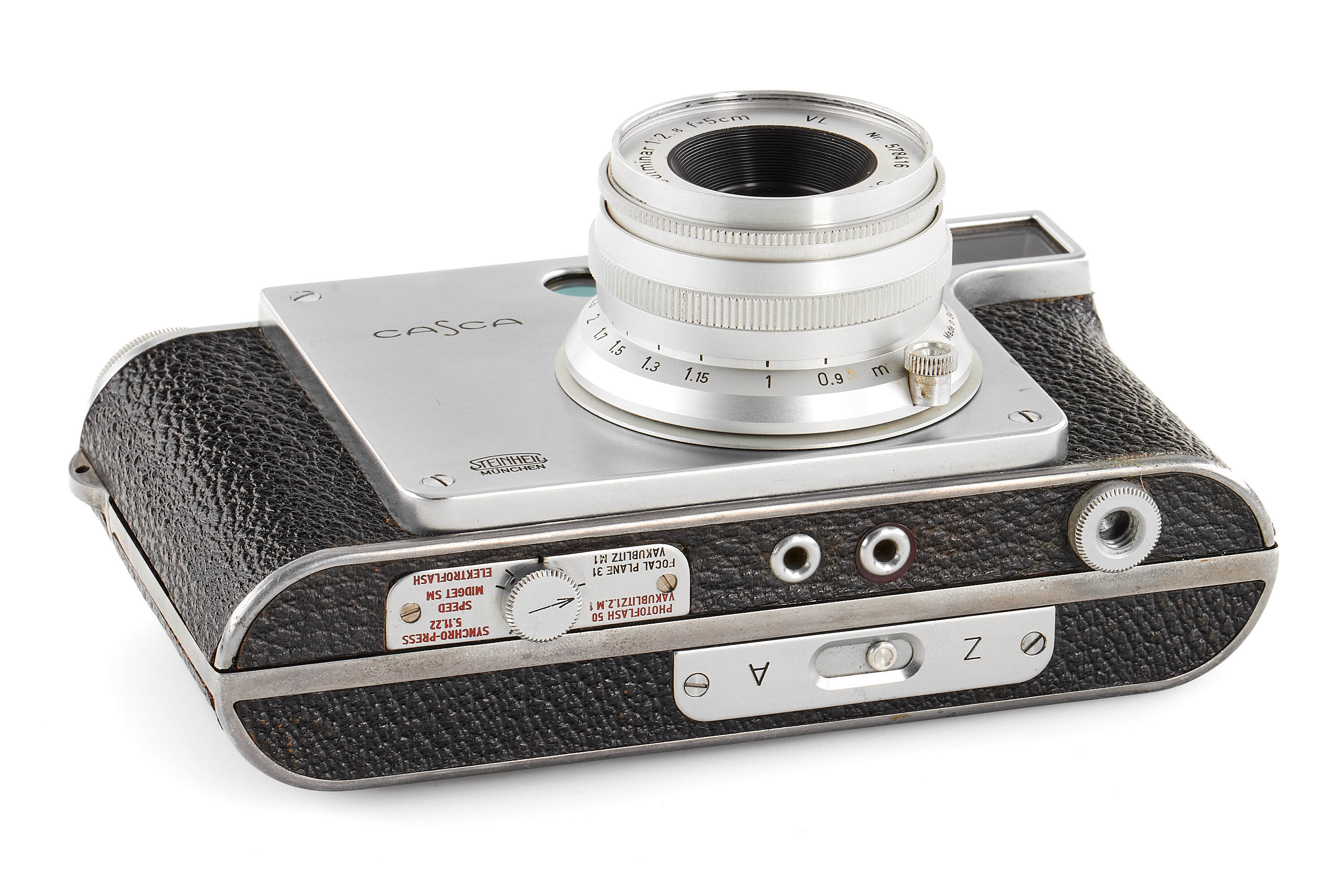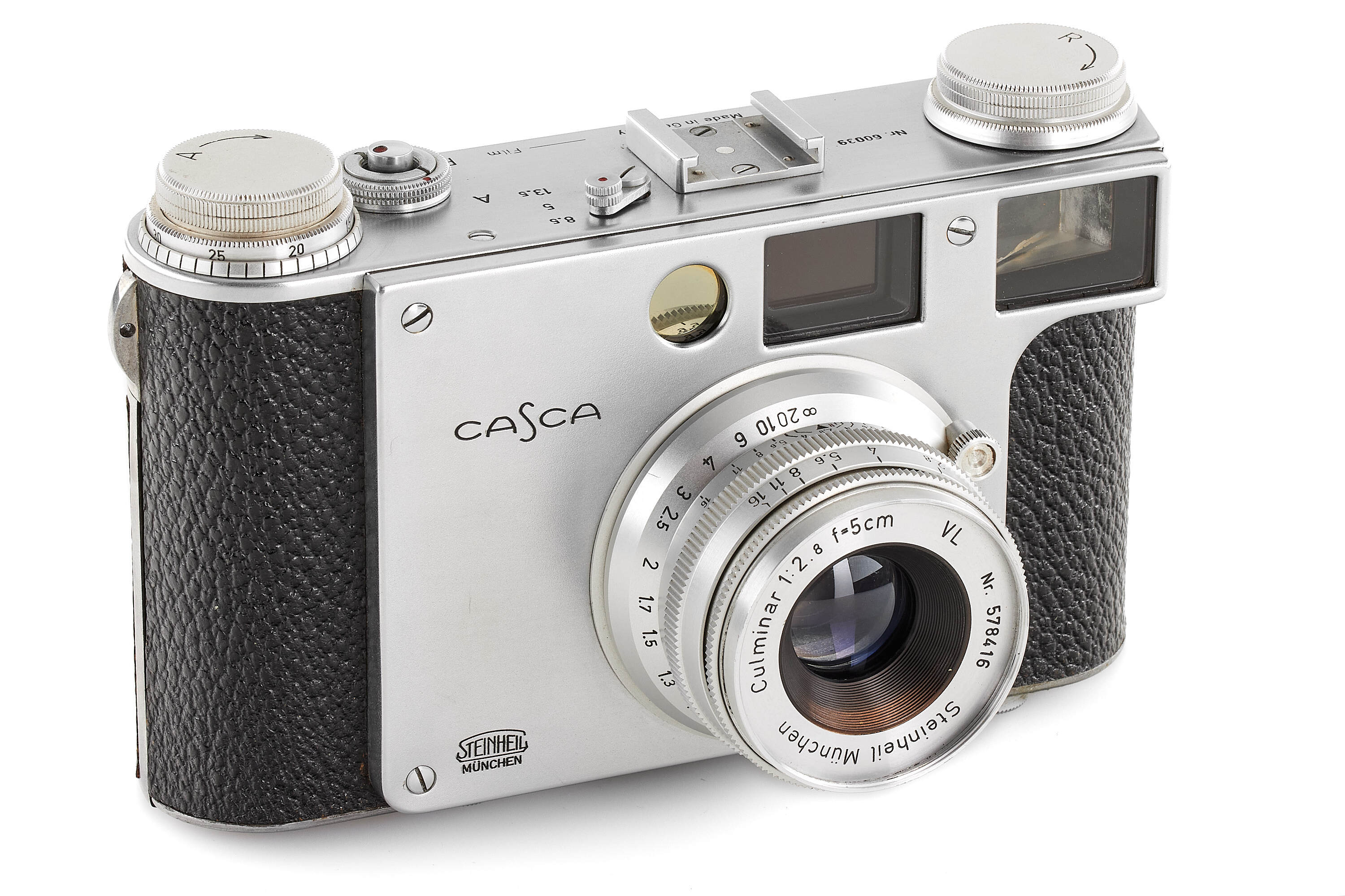 German 35 mm rangefinder from C. A. Steinheil, Munich. Updated from the Casca I with a coupled rangefinder, combined viewfinder with multiple framelines, interchangeable lenses via the unique Casca II bayonet (spring-loaded detents), a cloth focal-plane shutter to 1/1000 s, and adjustable M/X flash sync. Short-lived, relatively costly, and produced in modest numbers—an uncommon and desirable post-war design. The offered example is in beautiful, mint condition and includes a Culminar VL 2.8/5cm no. 578416 and a Culminar 4.5/13.5cm (cond. A/B). The best example we have encountered.