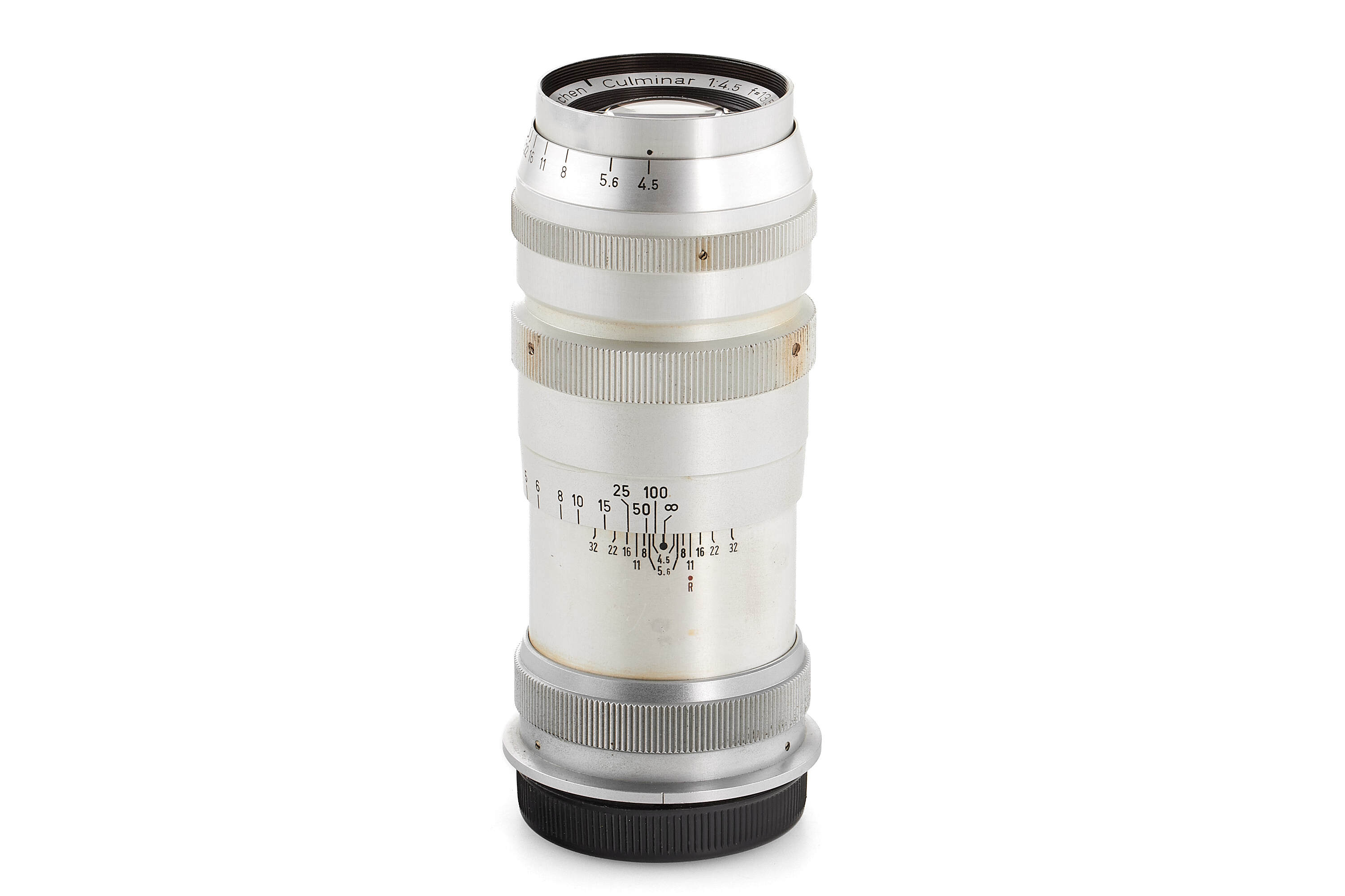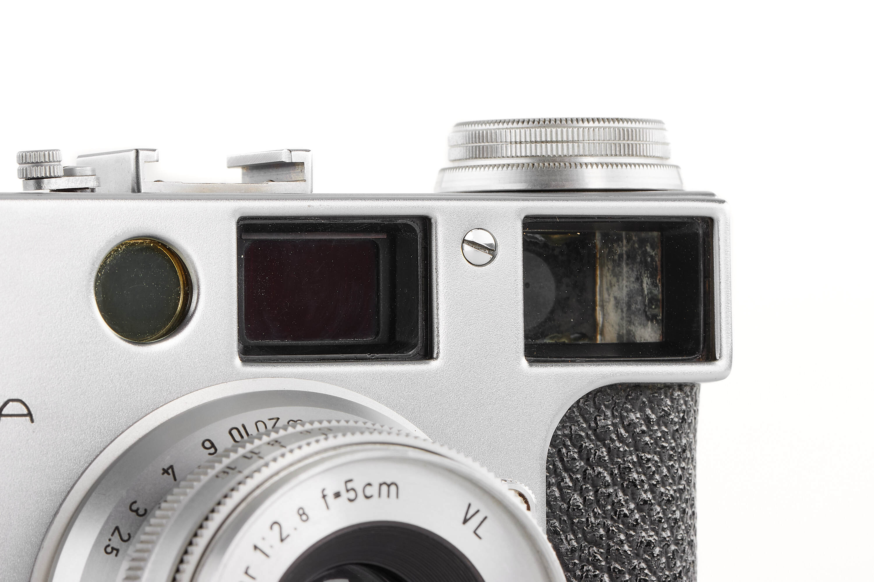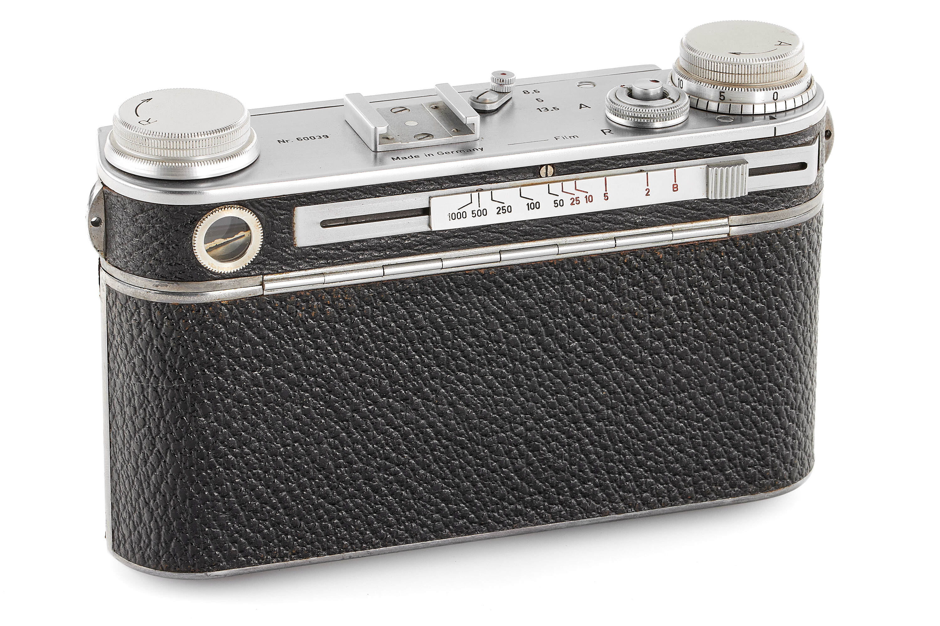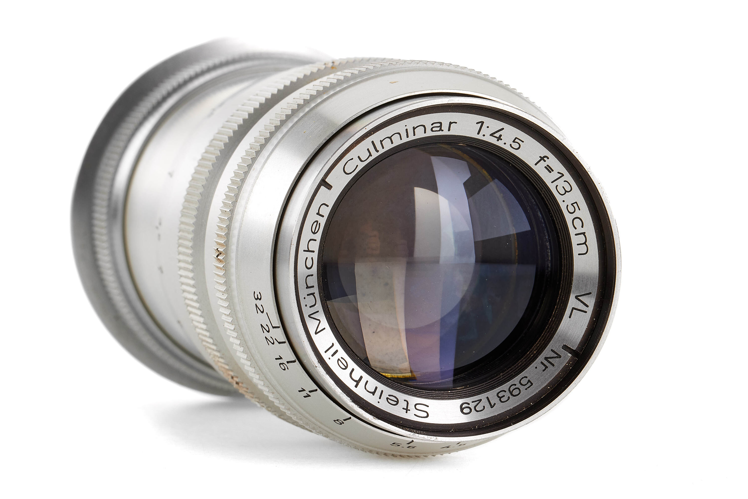 German 35 mm rangefinder from C. A. Steinheil, Munich. Updated from the Casca I with a coupled rangefinder, combined viewfinder with multiple framelines, interchangeable lenses via the unique Casca II bayonet (spring-loaded detents), a cloth focal-plane shutter to 1/1000 s, and adjustable M/X flash sync. Short-lived, relatively costly, and produced in modest numbers—an uncommon and desirable post-war design. The offered example is in beautiful, mint condition and includes a Culminar VL 2.8/5cm no. 578416 and a Culminar 4.5/13.5cm (cond. A/B). The best example we have encountered.
