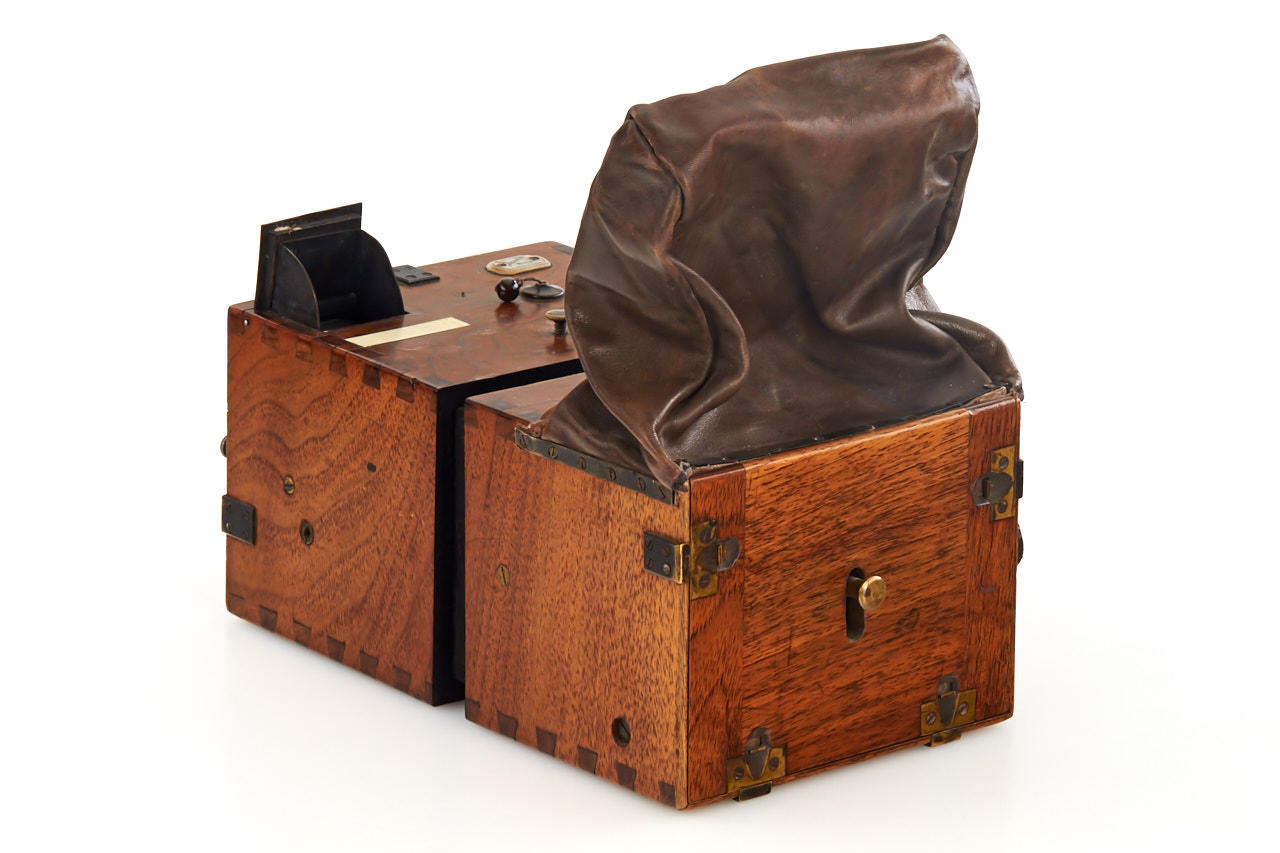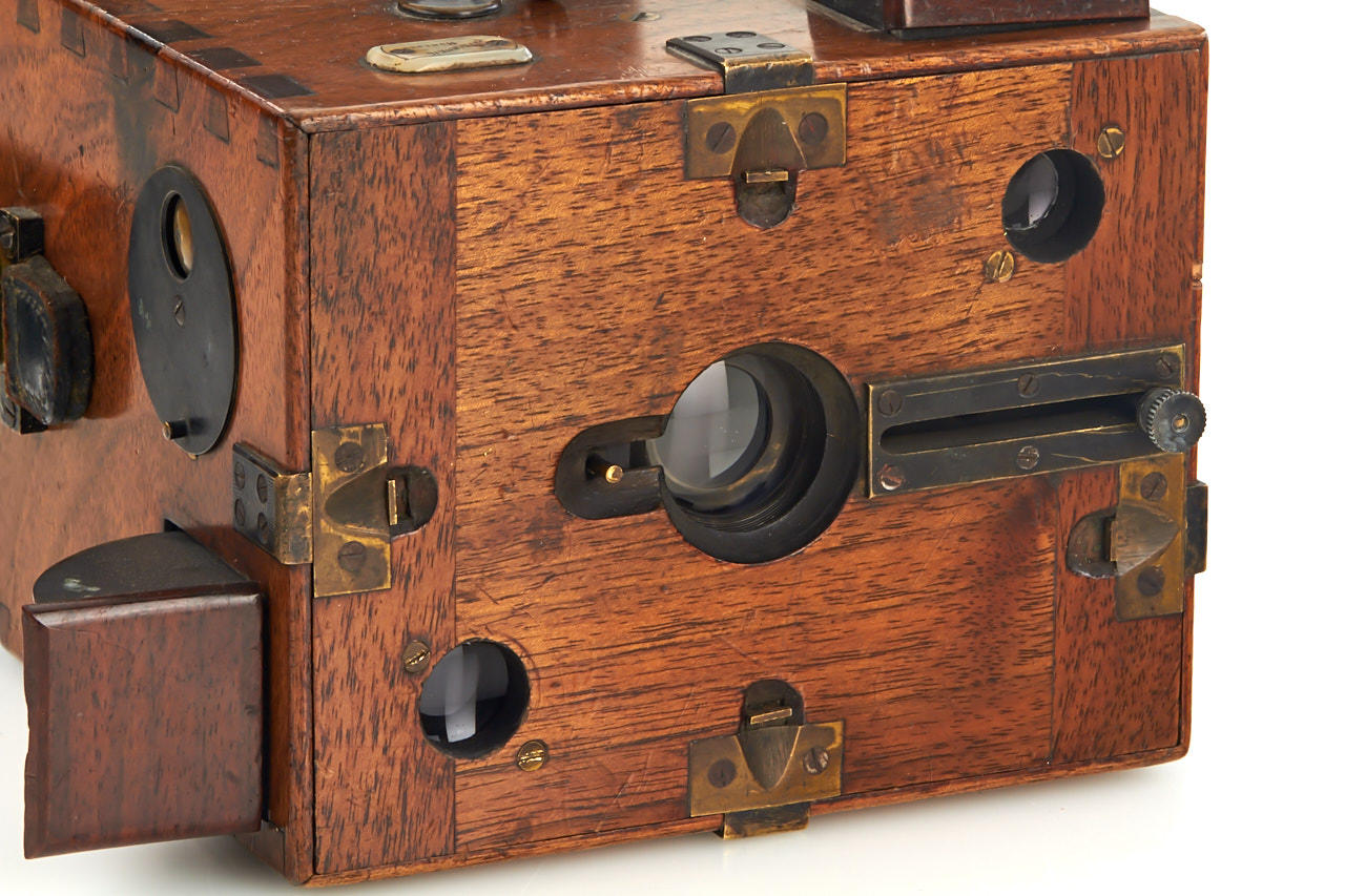 9x12 magazine detective camera, early version with leather changing bag, with mother of pearl maker's plaque, in good original condition
