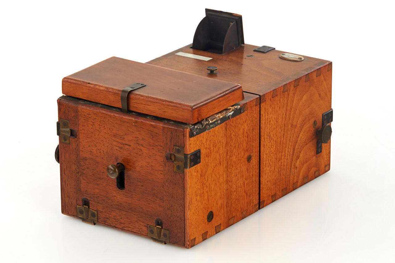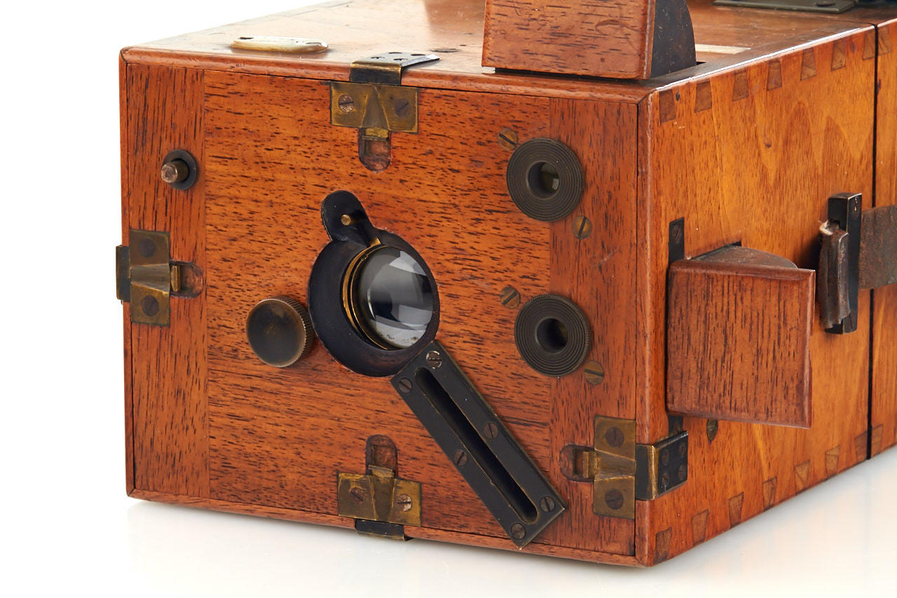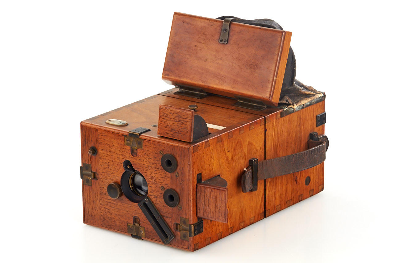 attractive wooden 9x12cm detective camera, early version with changing bag and wooden cover over it, mother of pearl maker's plaque, unmarked lens