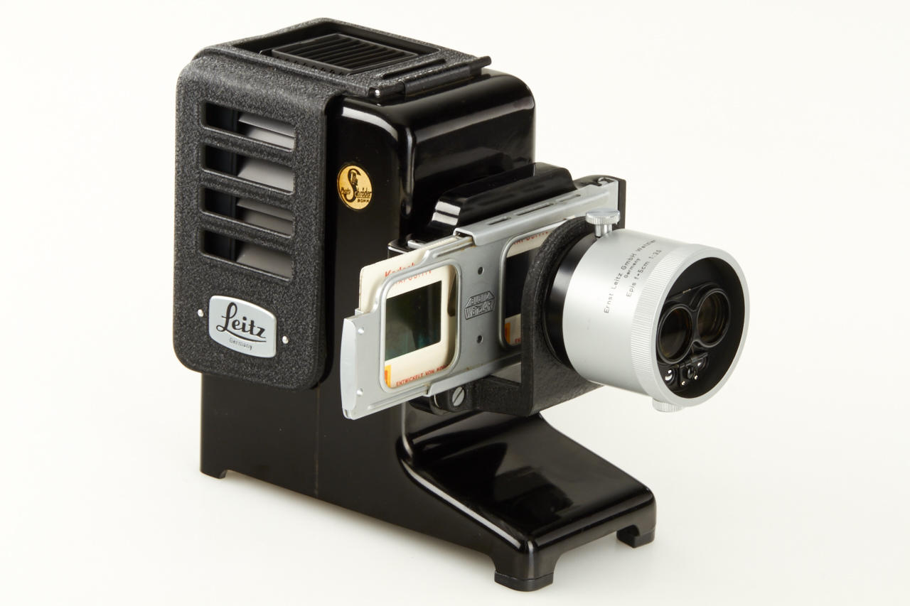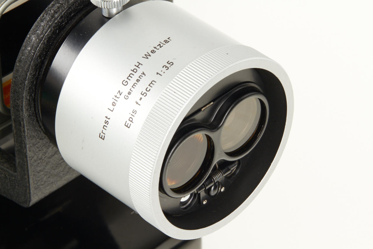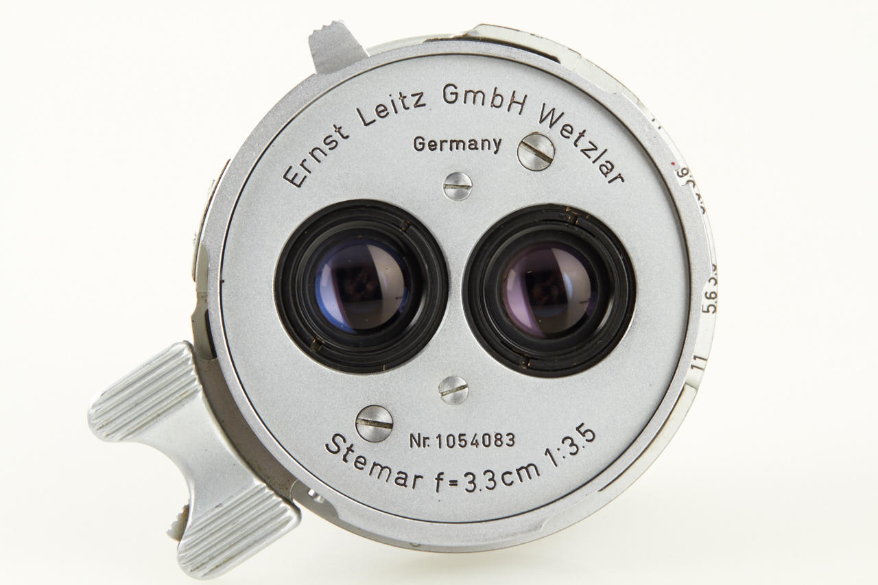 Famous and extremely rare Wetzlar Stereo outfit ex Dr. Bawendi collection including Wetzlar Stemar OISBO 3.5/3.3cm no.1054083 (with caps OIWKO and OIXMO), Wetzlar OIMPO beam splitter no.529, OIGEO hood engraved ' Ernst Leitz GmbH Wetzlar, OIDYO BL finder engraved 'Stereo 3.3cm E.LEITZ WETZLAR Germany' - all like new with perfect lenses in fitted leather case OIKLO-S. Included in this lot are also 2 extremely rare (prototype) close-up attachments with bayonet mount (to be used with screw mount or M cameras) for 0.50 - 1m (engraved 'Ernst Leitz GmbH Wetzlar Germany Stemar-Vorsatz 0.50 - 1m', with original wooden box) and for 60cm (engraved 'Ernst Leitz GmbH Wetzlar Germany 60cm', with Leitz leather case) and mint Leitz Prado 150 projector with stereo projection lens IMPUU engraved 'Ernst Leitz GmbH Wetzlar Germany Epis f=5cm 1:3.5'. According to Dr. Bawendi the projection lens Epis is the only known sample. The outfit is illustrated and described in 'Vidom Nr.22 pages 28-36