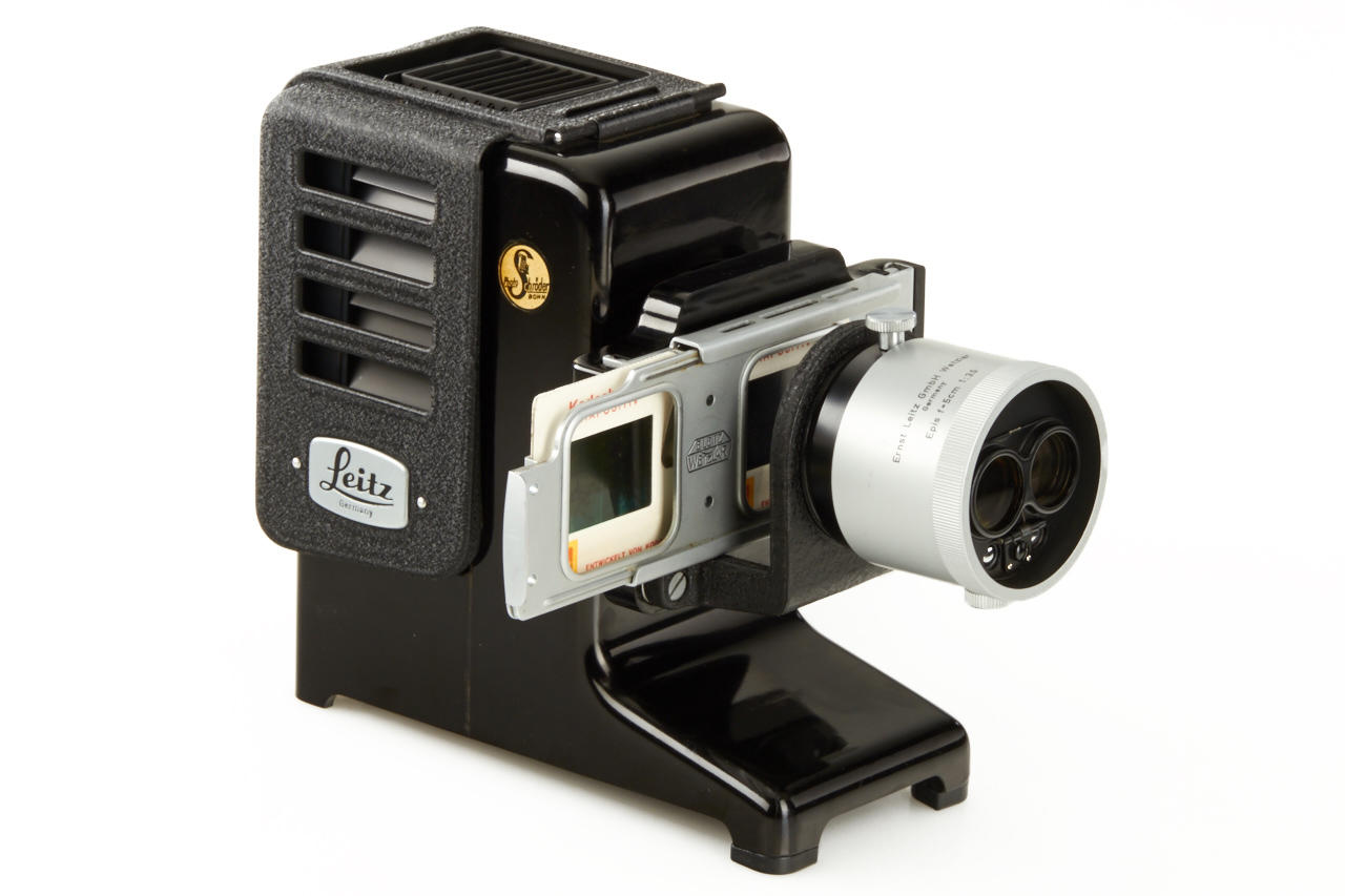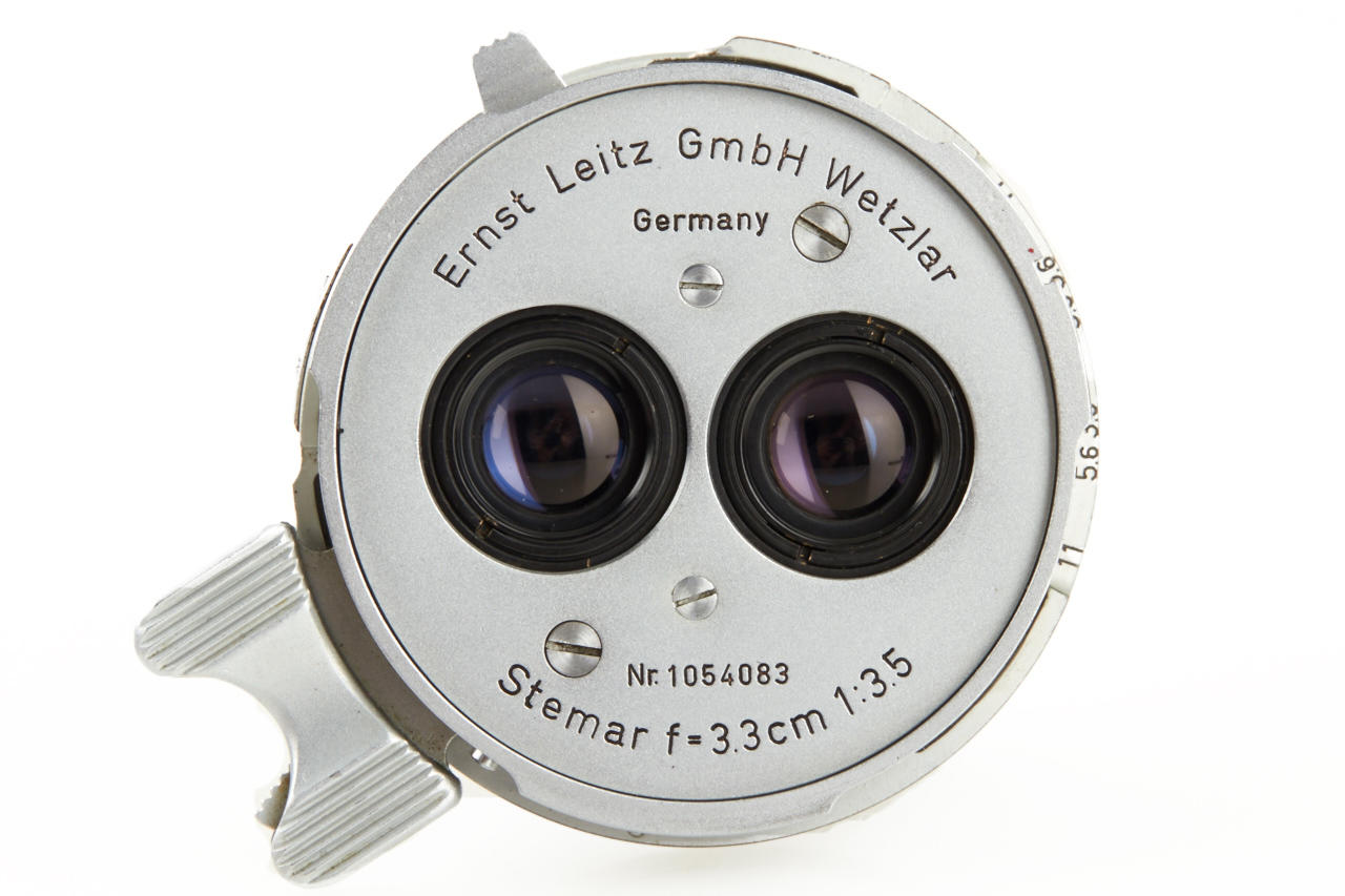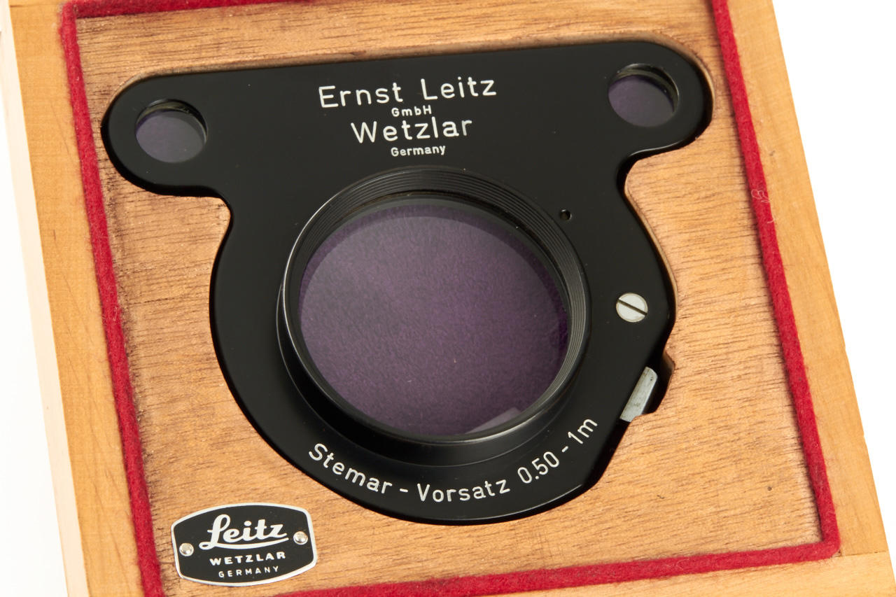 Famous and extremely rare Wetzlar Stereo outfit ex Dr. Bawendi collection including Wetzlar Stemar OISBO 3.5/3.3cm no.1054083 (with caps OIWKO and OIXMO), Wetzlar OIMPO beam splitter no.529, OIGEO hood engraved ' Ernst Leitz GmbH Wetzlar, OIDYO BL finder engraved 'Stereo 3.3cm E.LEITZ WETZLAR Germany' - all like new with perfect lenses in fitted leather case OIKLO-S. Included in this lot are also 2 extremely rare (prototype) close-up attachments with bayonet mount (to be used with screw mount or M cameras) for 0.50 - 1m (engraved 'Ernst Leitz GmbH Wetzlar Germany Stemar-Vorsatz 0.50 - 1m', with original wooden box) and for 60cm (engraved 'Ernst Leitz GmbH Wetzlar Germany 60cm', with Leitz leather case) and mint Leitz Prado 150 projector with stereo projection lens IMPUU engraved 'Ernst Leitz GmbH Wetzlar Germany Epis f=5cm 1:3.5'. According to Dr. Bawendi the projection lens Epis is the only known sample. The outfit is illustrated and described in 'Vidom Nr.22 pages 28-36