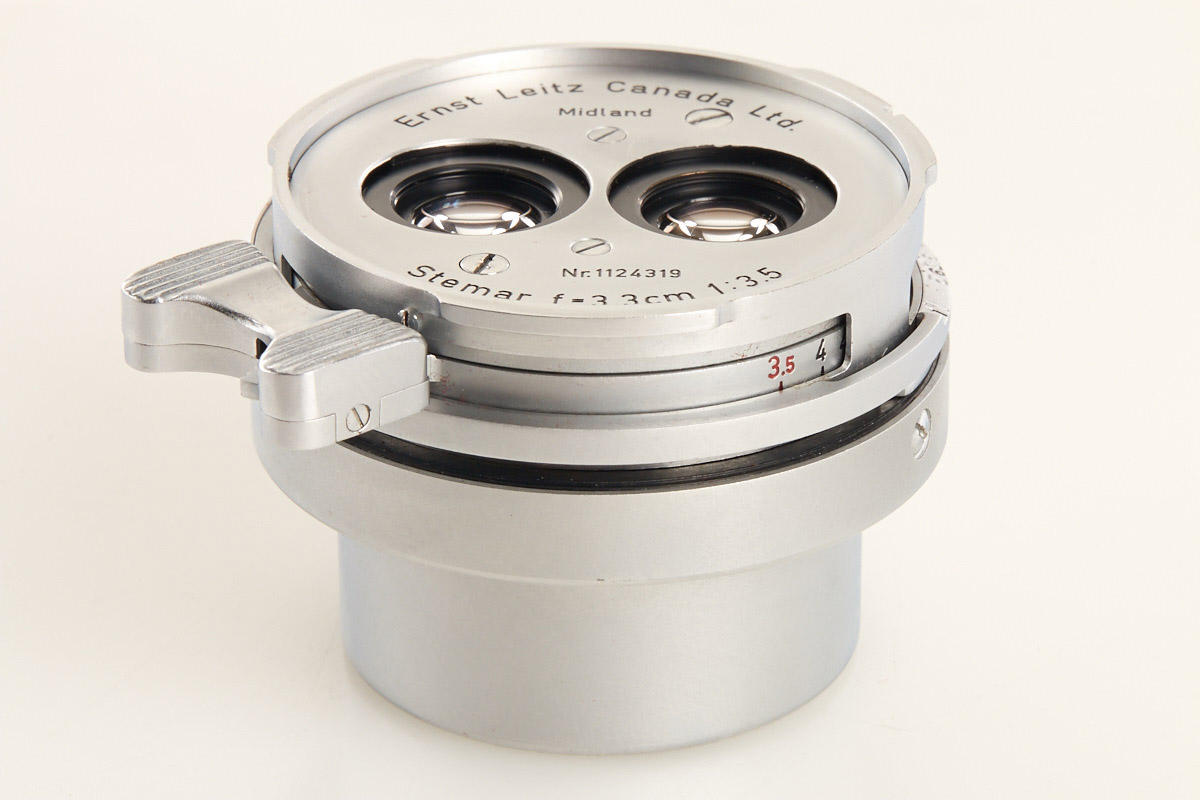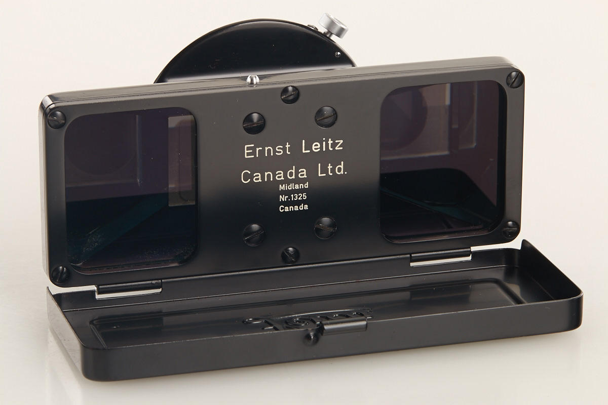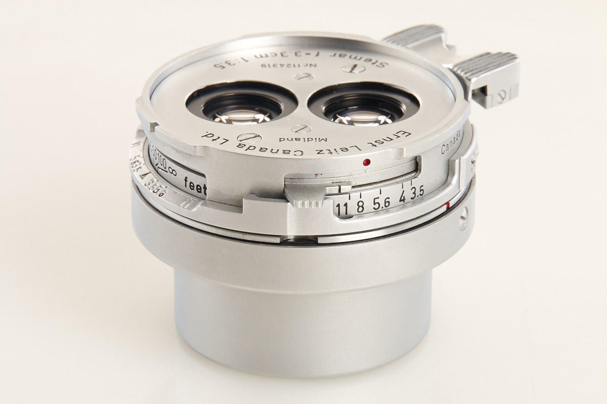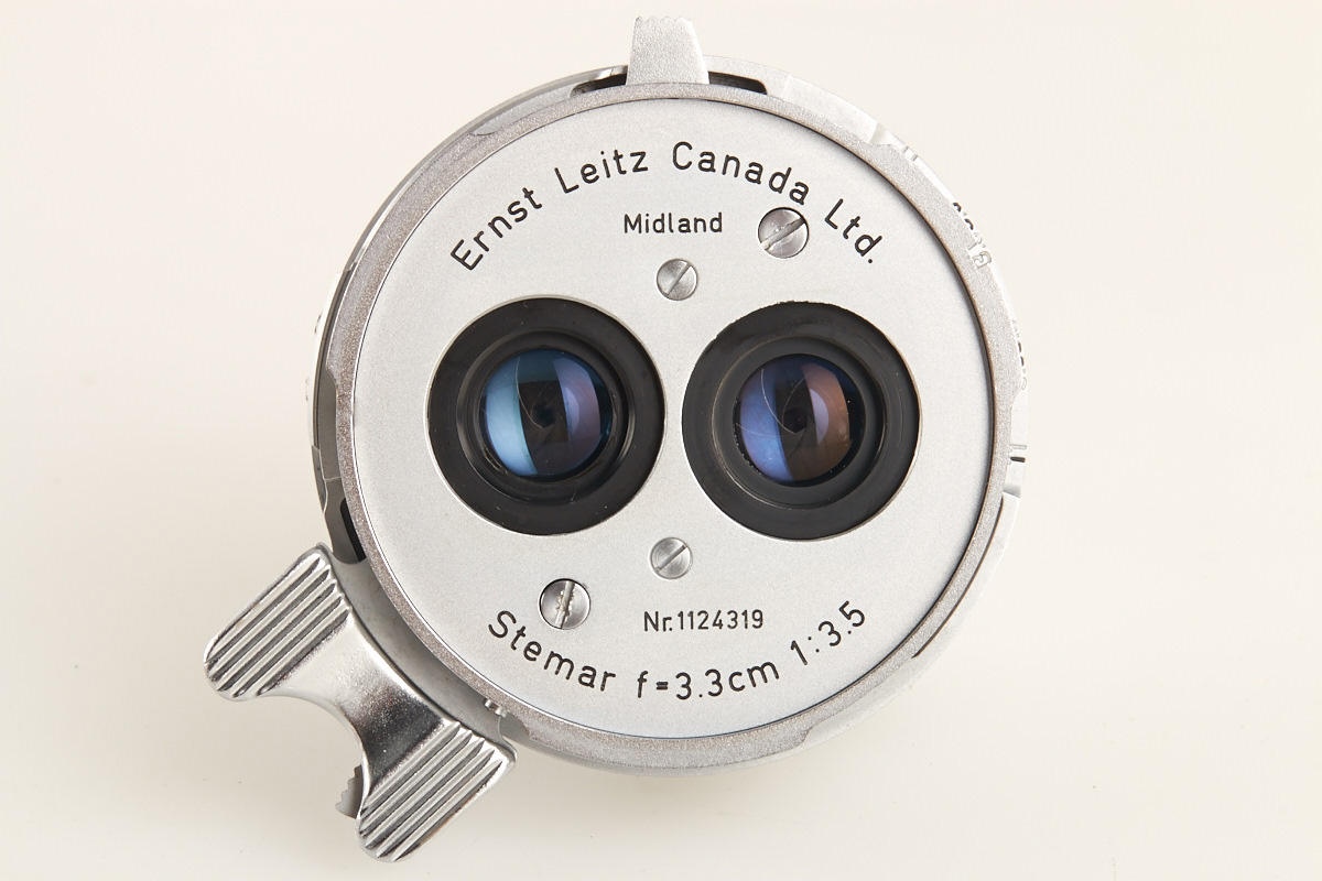 rare stereo equipment: OIRZO, OIASO screw mount Stemar (rear cap) with fixed M-adapter, OIMPO beam splitter no.1325 (flip cap), OIDYO stereo finder, OISBO hood, with import certificate in original maker's box