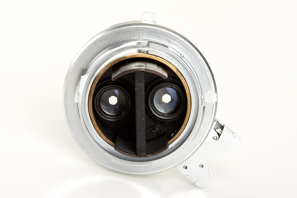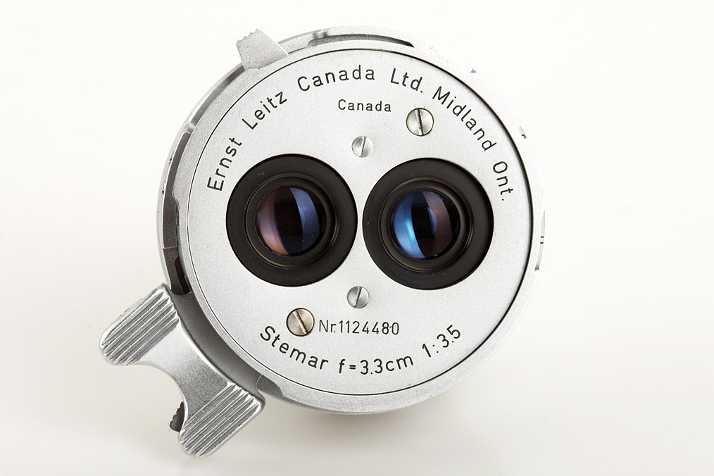 Stemar outfit with original M-mount (OIRZO, very few produced), mint and complete with both caps, 3.3cm finder, hood, prism no.1631 with caps, in red maker's box, OIPVO stereo viewer with 10 stereo slides, very rare IMPUU stereo projection lens with both caps in maker's box, engraved: Ernst Leitz Midland Canada Ltd. Midland Ont.Canada Elmar f=5cm 1:3.5, with Prado 150 in case