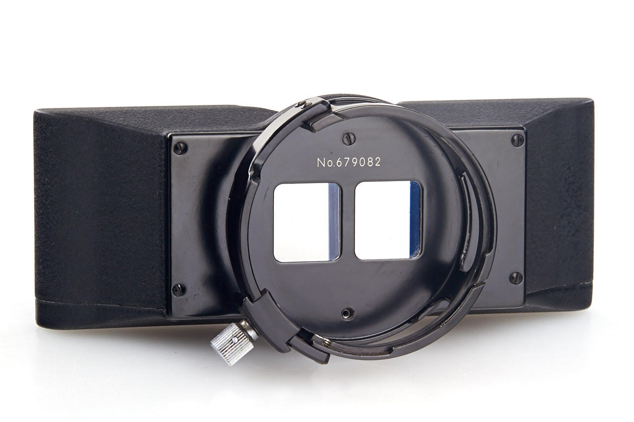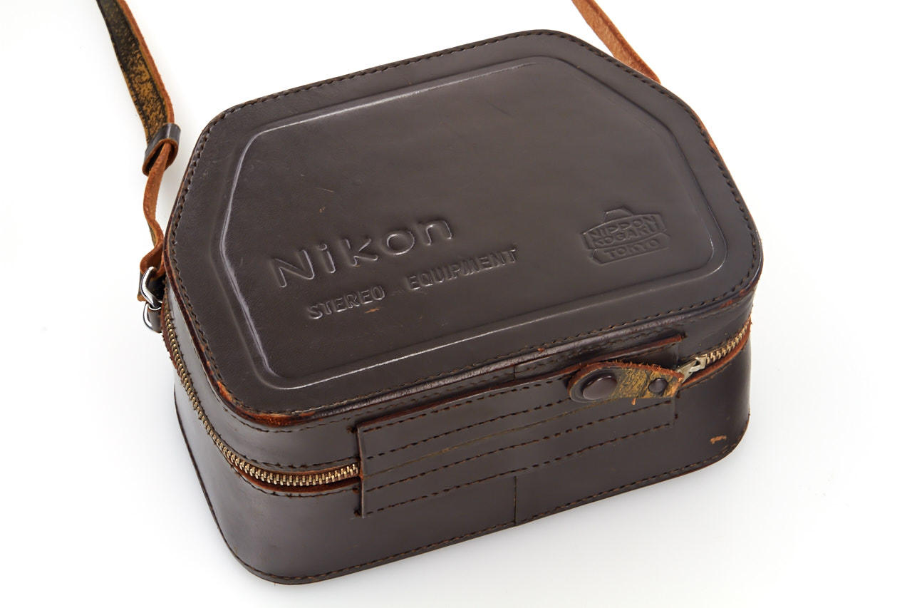 extremely rare complete outfit with Stereo-Nikkor 3.5/3.5cm no.242057, cap, prism no.679082 (small glass chip in right edge), special hood, original Stereo L38 filter, Nippon Kogaku Tokyo Stereo finder no.235267, special Nikon metal film spool, fitted leather case stamped 'NIKON STEREO EQUIPMENT NIKON KOGAKU TOKYO' - in excellent condition - the highlight of every Nikon collection
