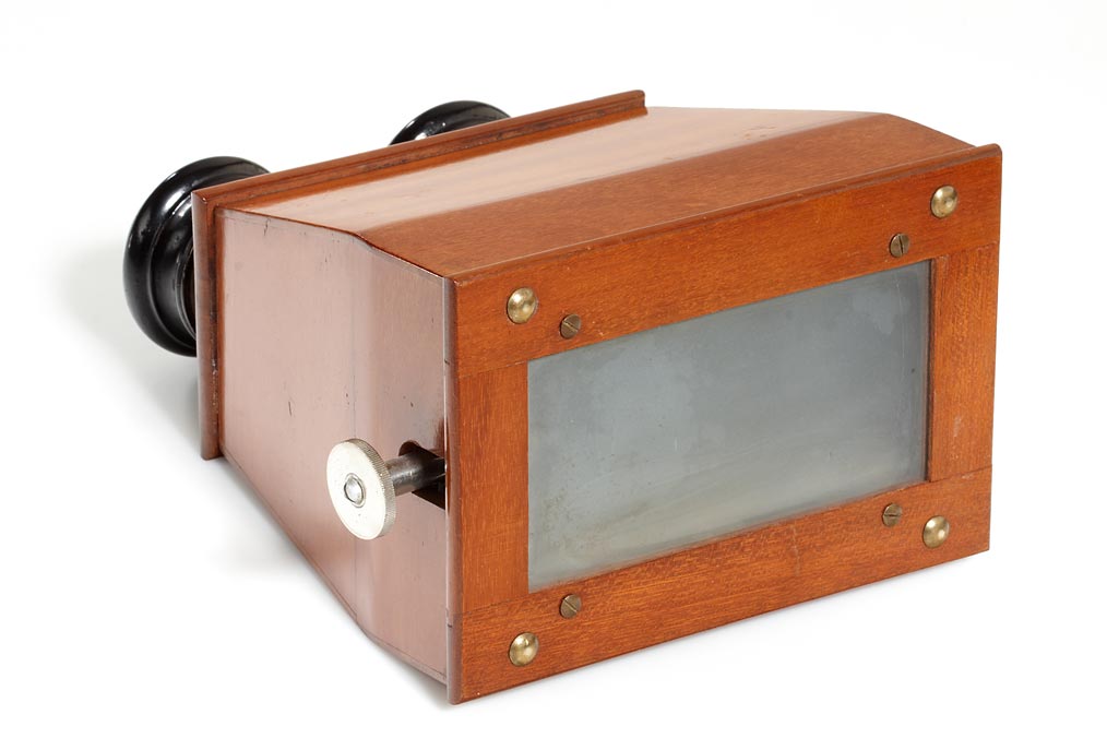 very rare French 'Stereo Roulleau' viewer for uncut roll film, body made of wood, central focus, the transport mechanism is operated by a knob. An exceptional viewer In perfect condition.