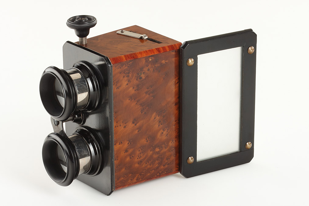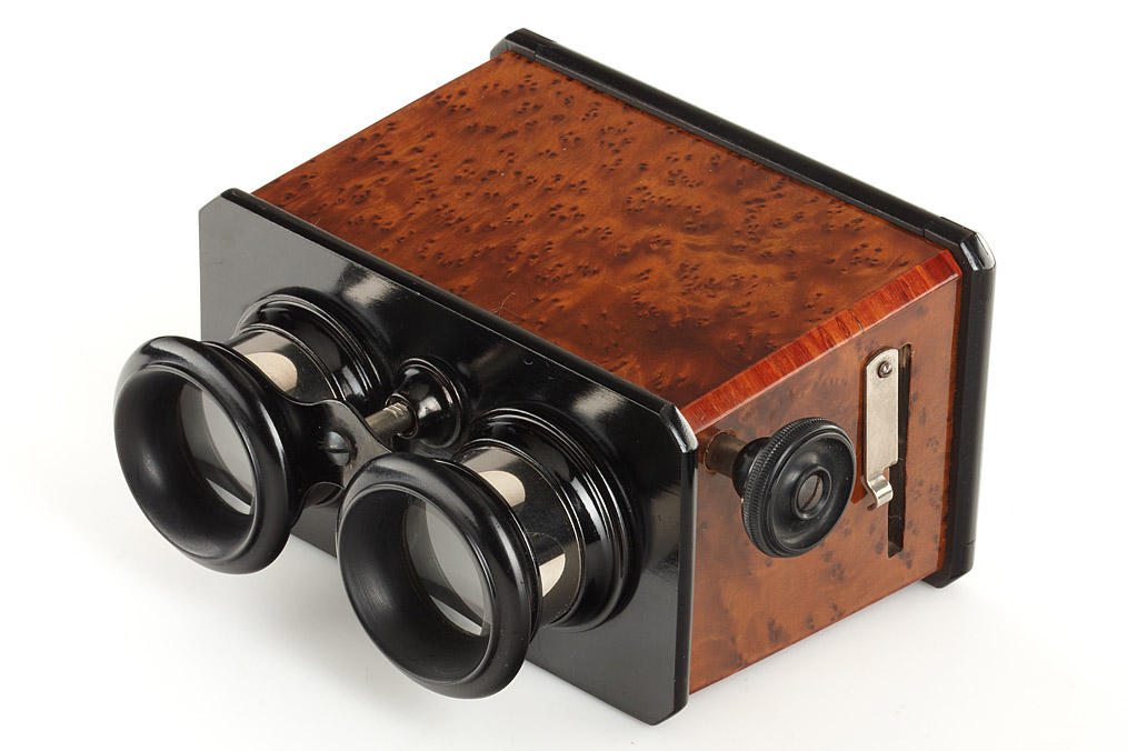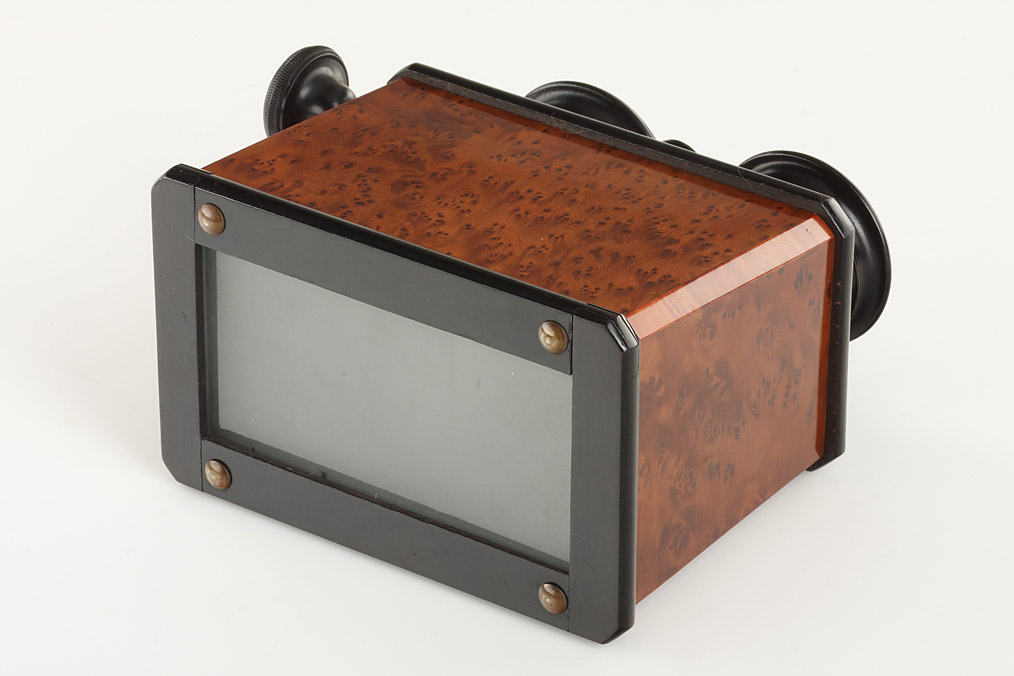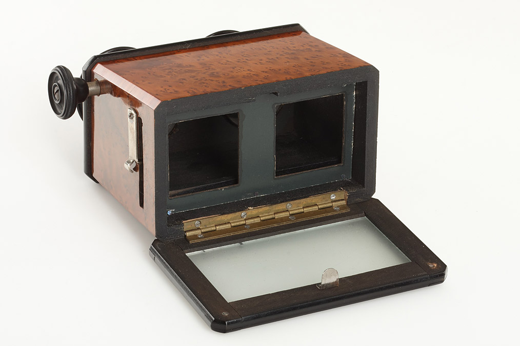 Two 45x107 hand stereo viewers with rack and pinion focusing in great condition (1) De Luxe version of the Vera Scope with chrome lens holders, (2) unmarked French viewer with cherry wood veneer (2)