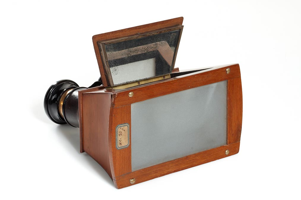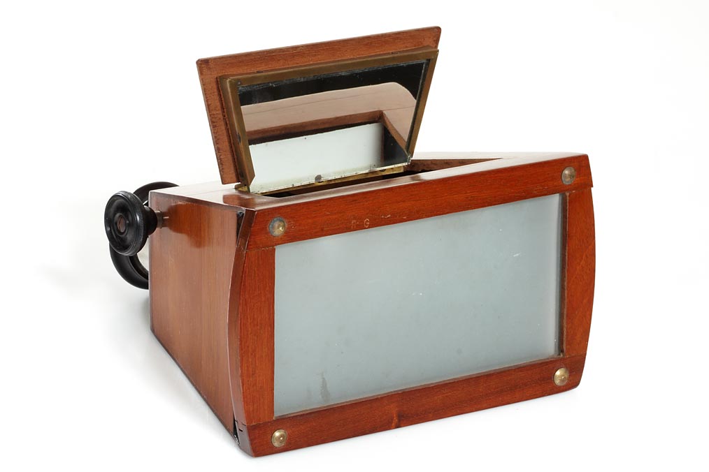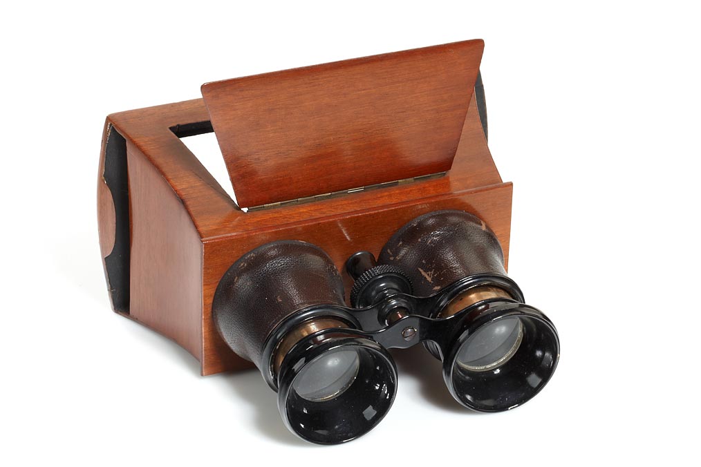 set of two wooden stereo viewers for 10x13 slides and cards, both with adjustable focus, (1) viewer with rack and pinion focus, hinged mirror, in perfect condition, (2) centre focus stereoscope with leather covered oculars, hinged mirror, in good condition. (2)