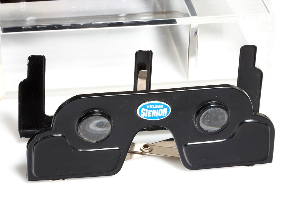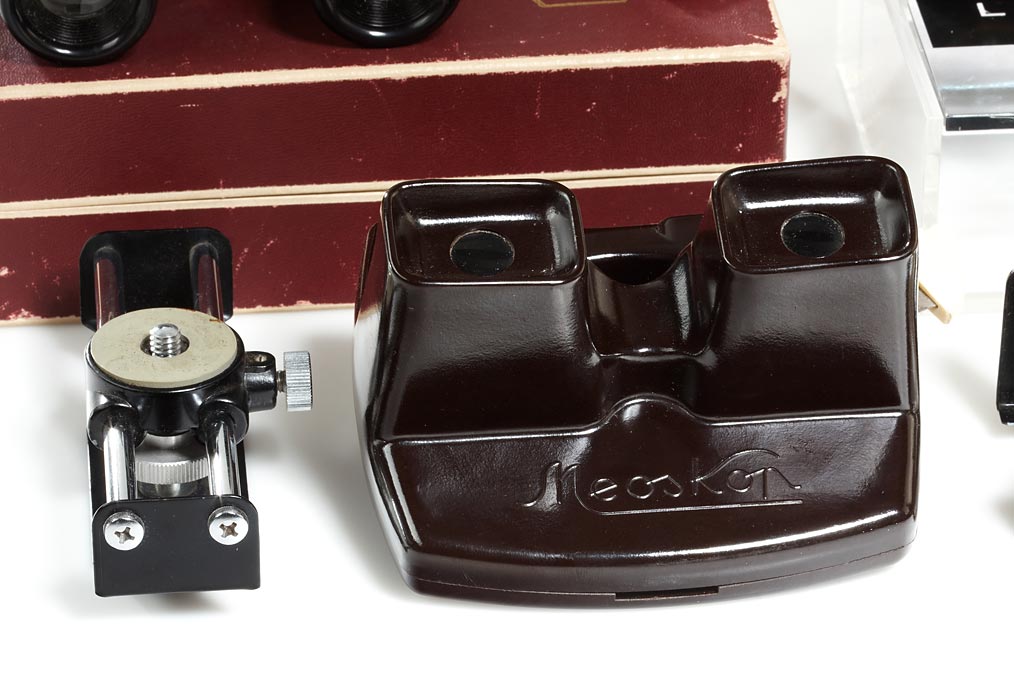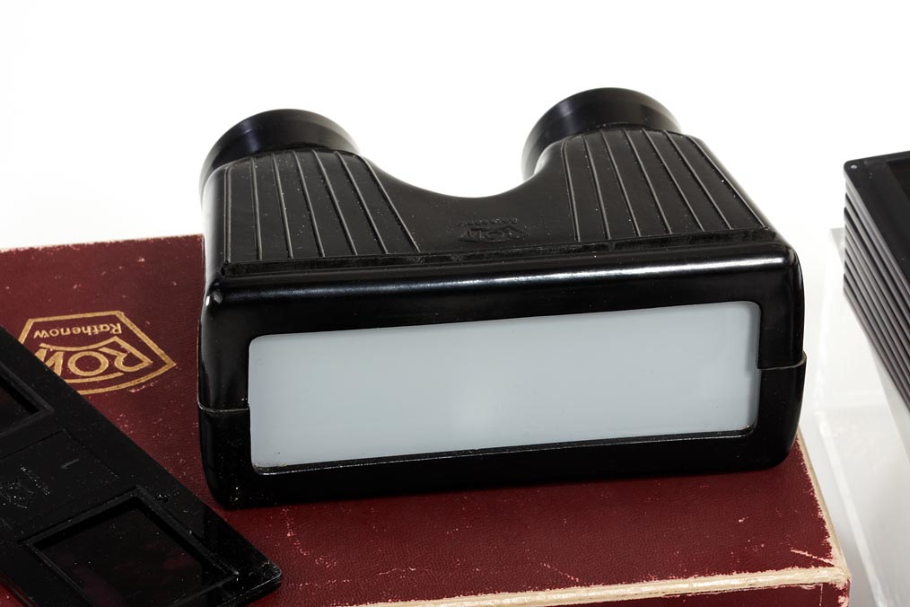 group of four viewers in very good condition (1) ROW Rathenow Bakelite slide-viewer, (2) ‘Velbon Sterion’ folding pocket stereoscope with the matching sledge for making stereo pictures with a regular camera, (3) first model Meoskop made of brown Bakelite, (4) modern French metal slide viewer 'Zacoscope' in acrylic glass box and with 10 slides with views of Paris. (4)