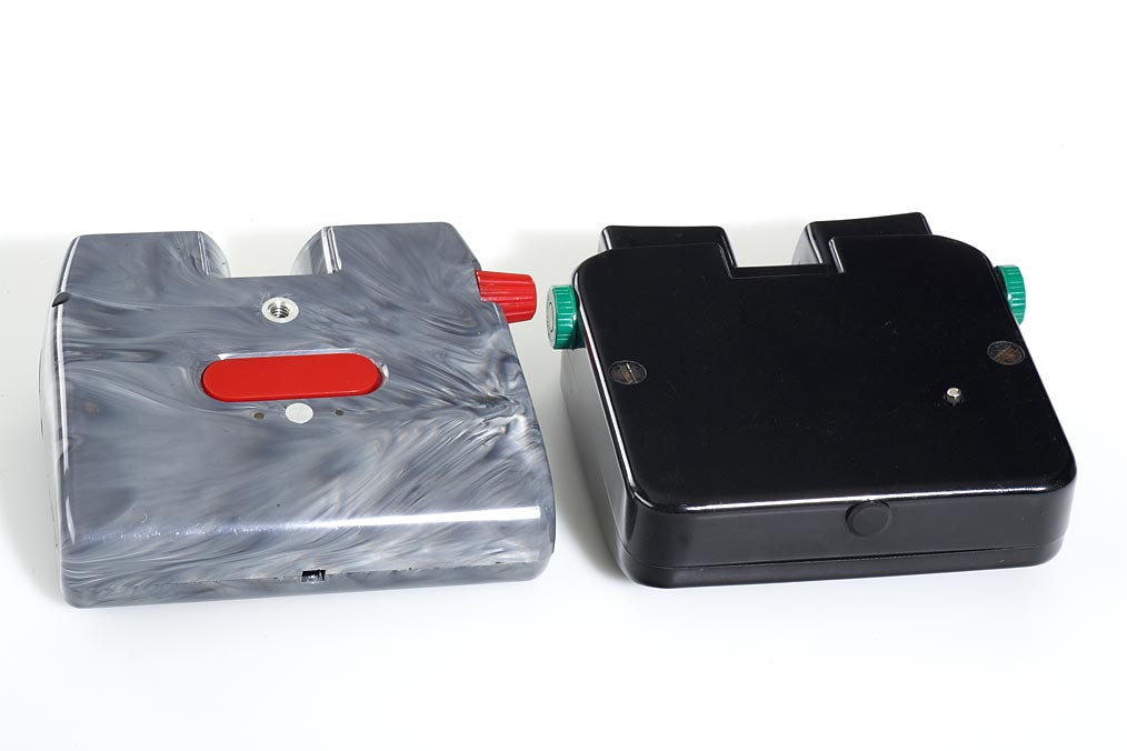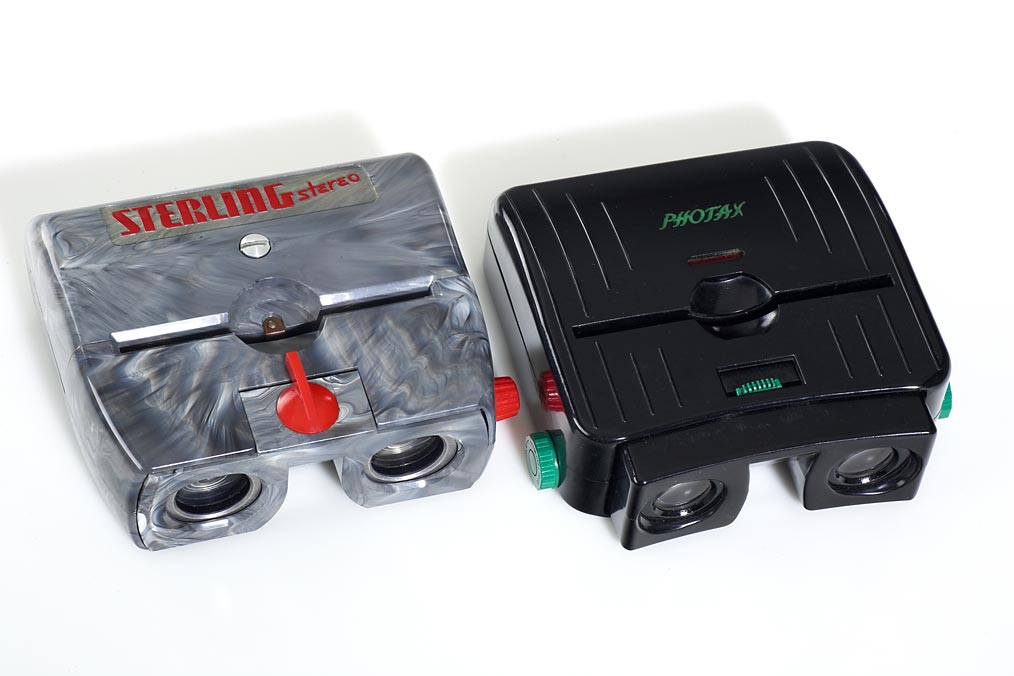 two vintage stereo slide viewers in fitted boxes, with low voltage electric illumination and adjustable focus in perfect condition, (1) 'Photax' stereoscope made of black Bakelite with green focussing wheels, original instructions, in plastic covered wooden box, (2) 'Sterling Stereo' plastic viewer with mother of pearl finish, in faux leather box. (2)
