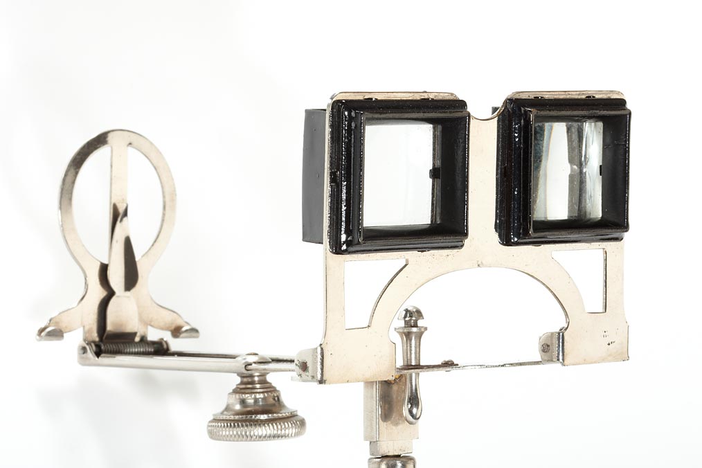 very elegant French folding stereoscope made of chrome plated brass, geared shift focus, the metal eyepieces and the detachable wooden handle have a black lacquer finish, comes with its original box covered with faux leather and labelled ‘Stereoscope Damoy Omnium’, the viewer is in absolute mint condition and shows no signs of use.