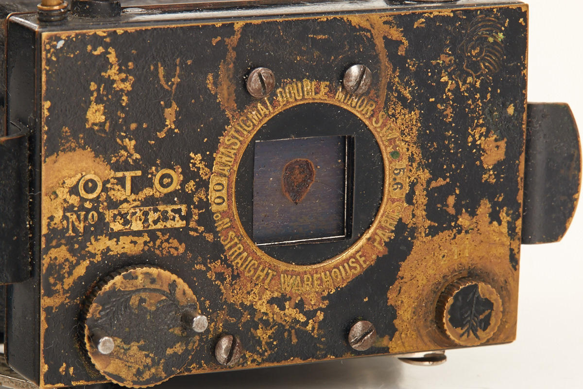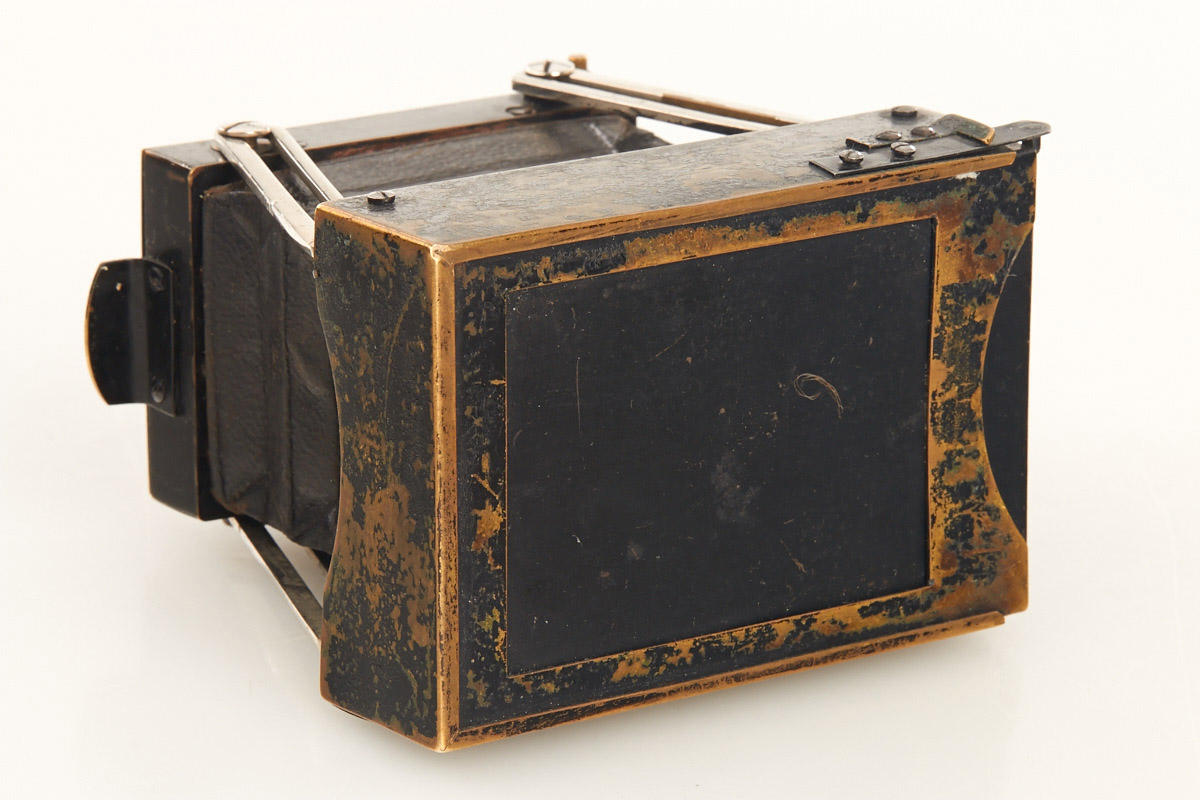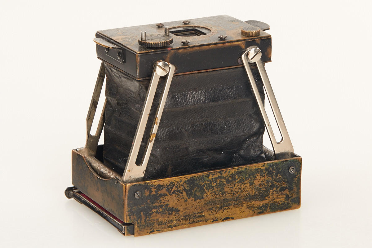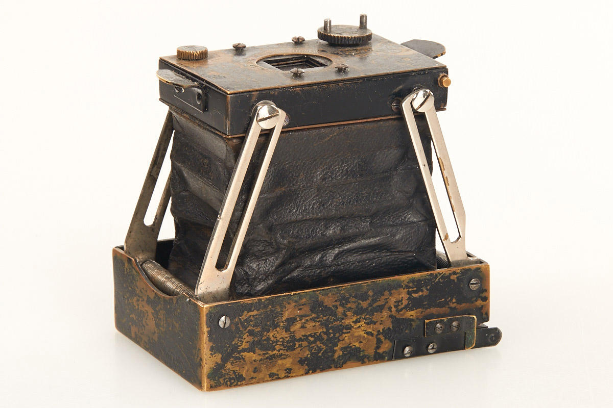 rare, French metal strut-folding camera for 4x5.5cm exposures on plates, leather bellows, Anastigmat Double Minor S.W.F. 5.6 in working metal focal plane shutter