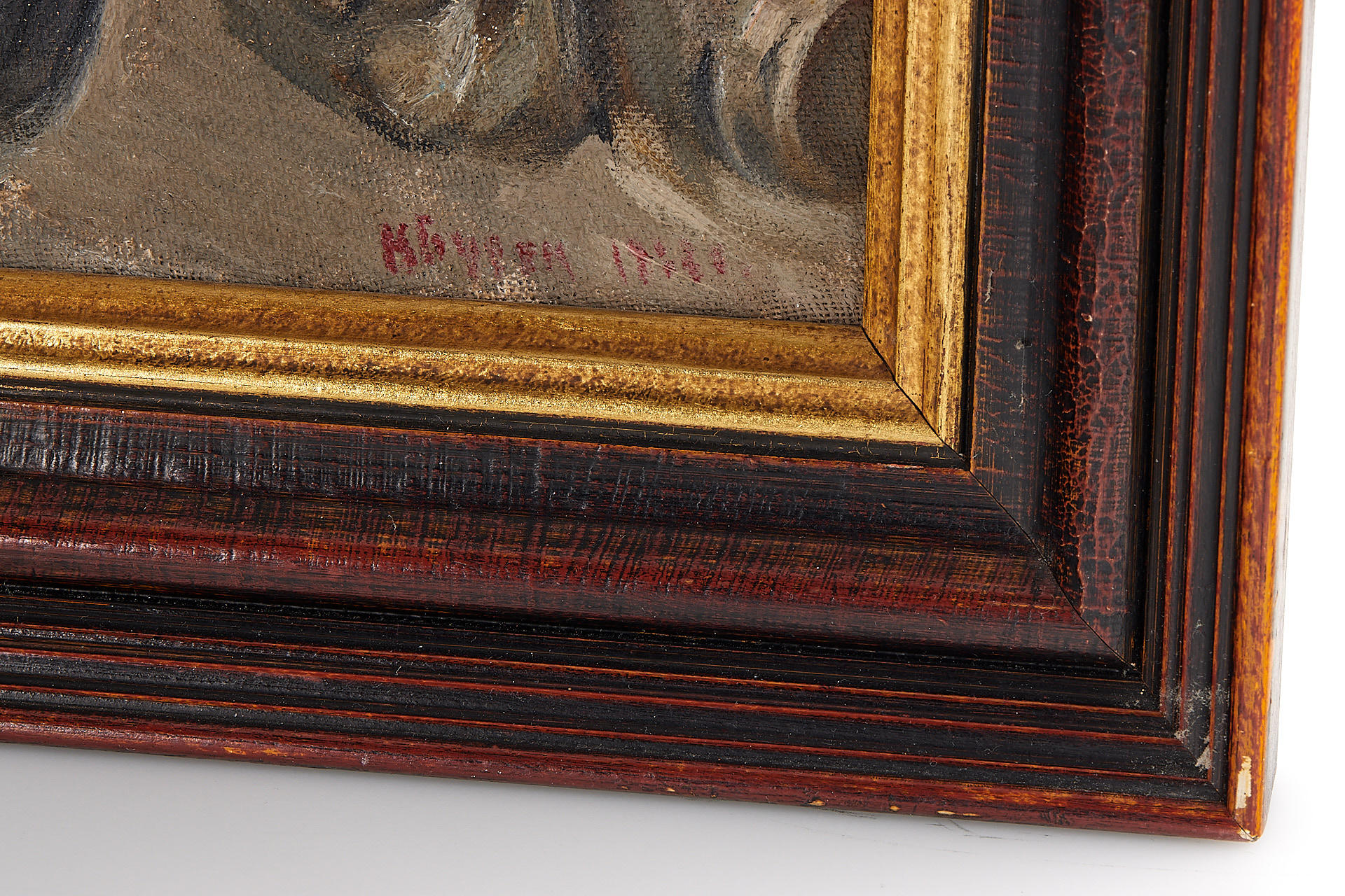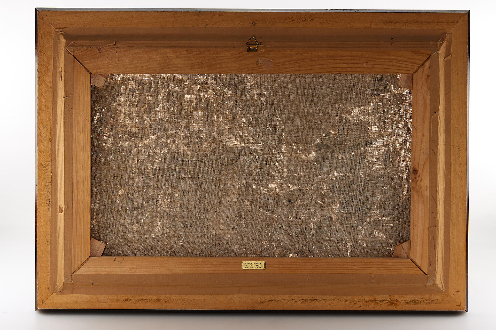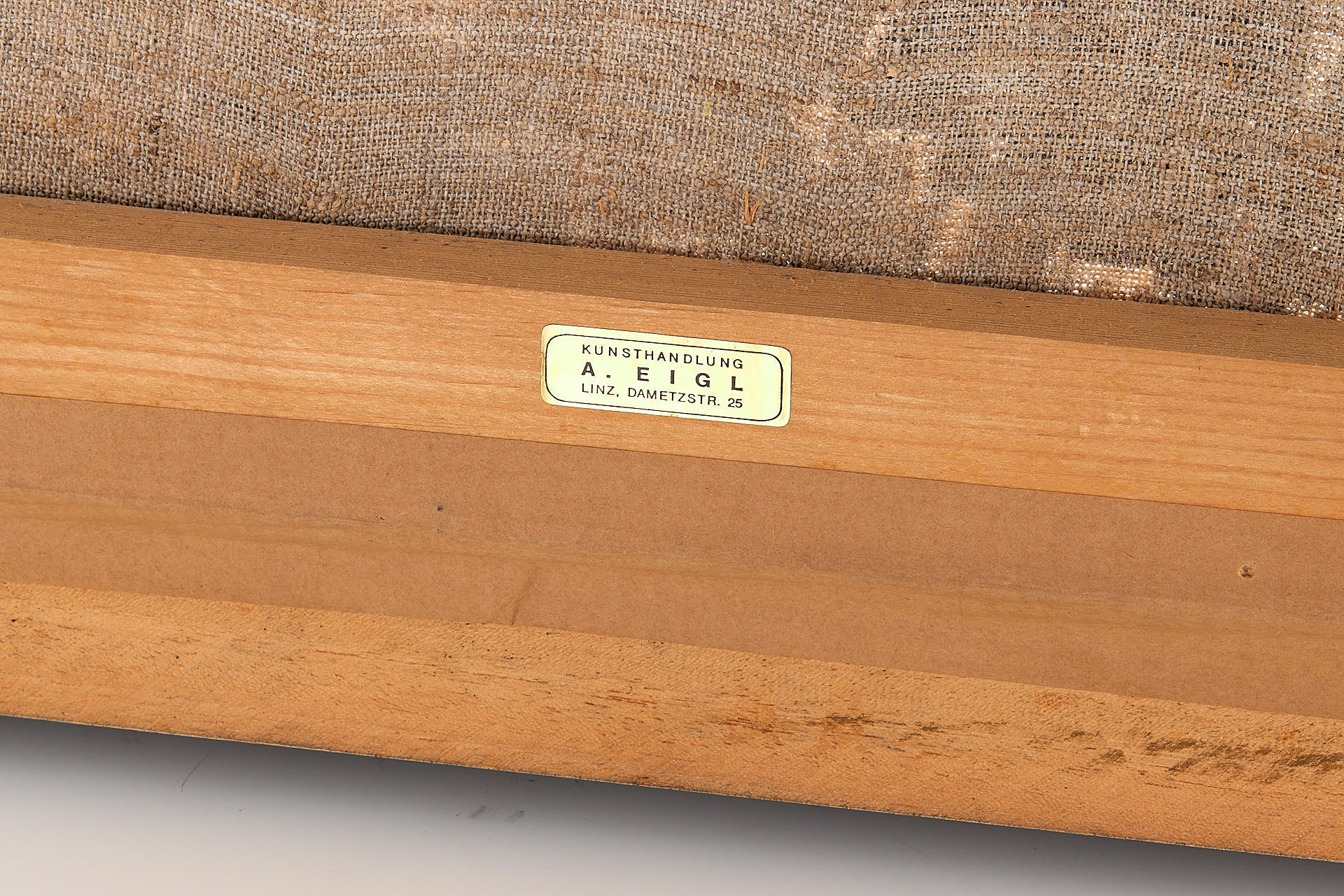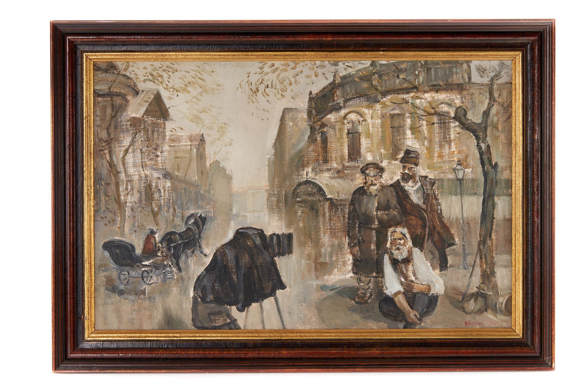 Russian painting picturing a street portrait photographer, oil on canvas mounted in 50 x 70cm wooden frame, signed in the right lower corner, in near mint condition, art shop sticker A. Eigl Linz on the back