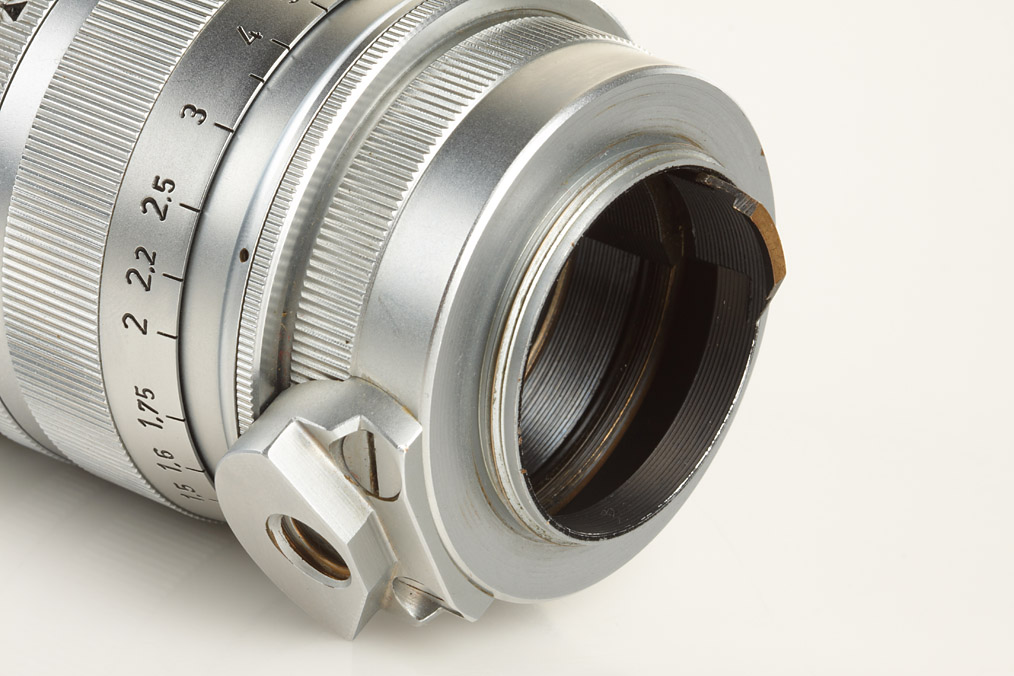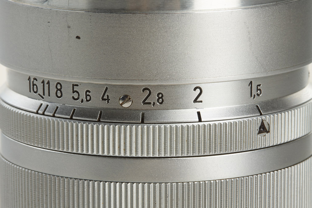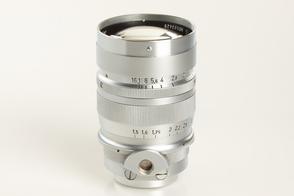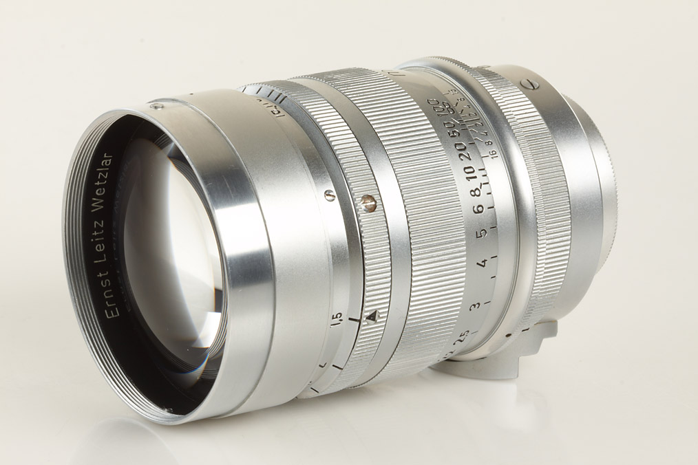 very rare chrome Summarex from first batch (with war-time serial number, delivered approx.1949) in perfect condition with matching early hood engraved 'Ernst Leitz Wetzlar Germany', both caps and original leather keeper