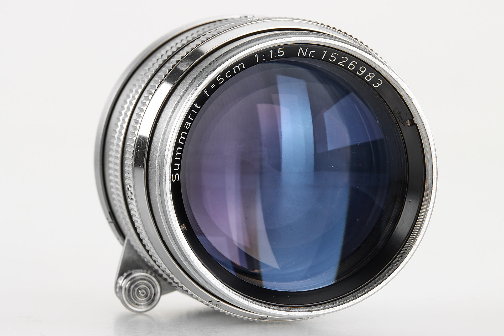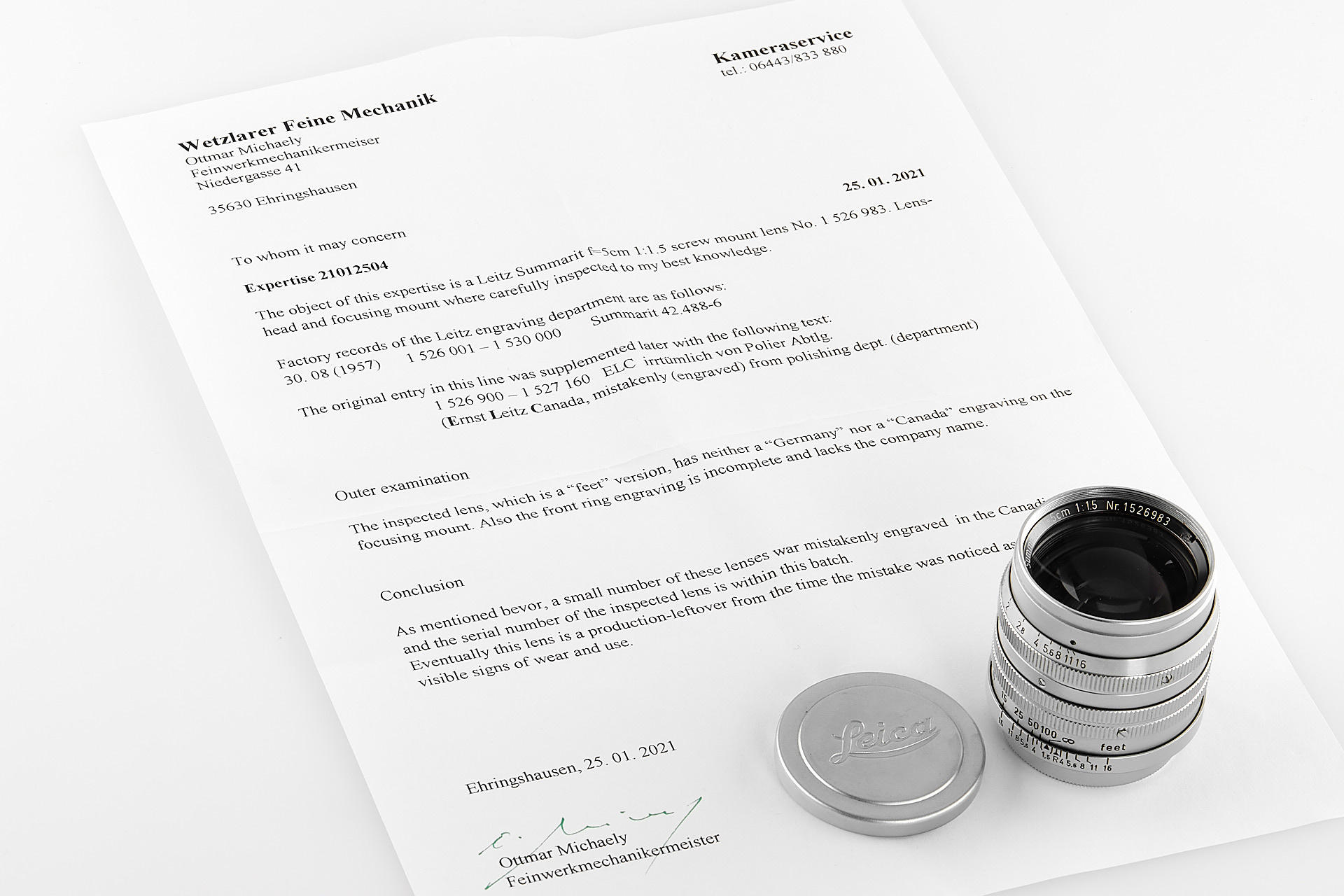 an interesting Summarit with no Canada or Wetzlar engraving, the factory records of the Leitz engraving department revealed interesting supplementary information about the lenses from a small batch 1526900-1527160: 'ELC irrtümlich von Polier Abtg.' (Ernst Leitz Canada, mistakenly engraved from the polishing department), the lens is in beautiful, mint condition and there are no delivery entries for this serial number, included in this lot is a written expertise from Mr. Ottmar Michaely, a very interesting piece of the history of Leica