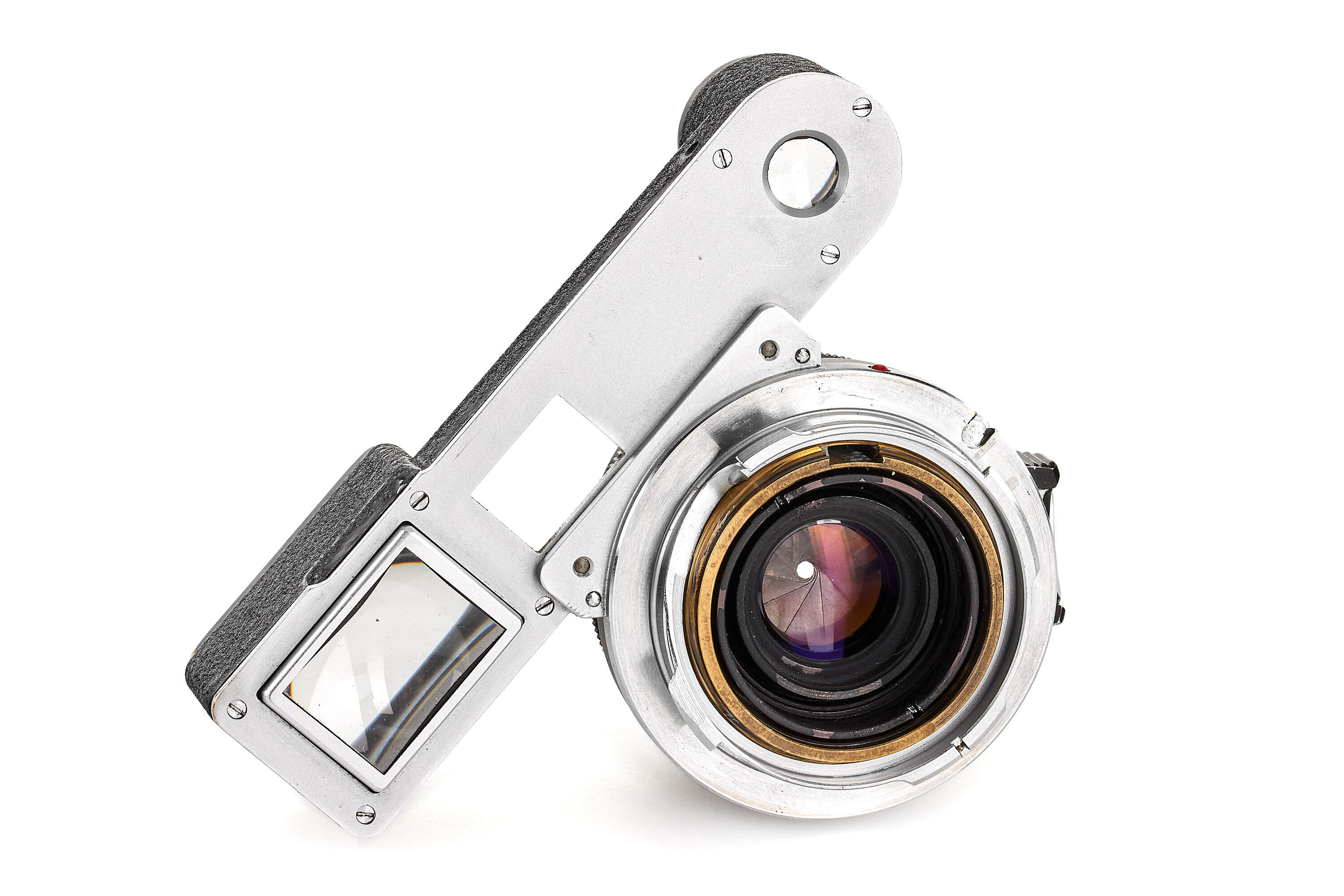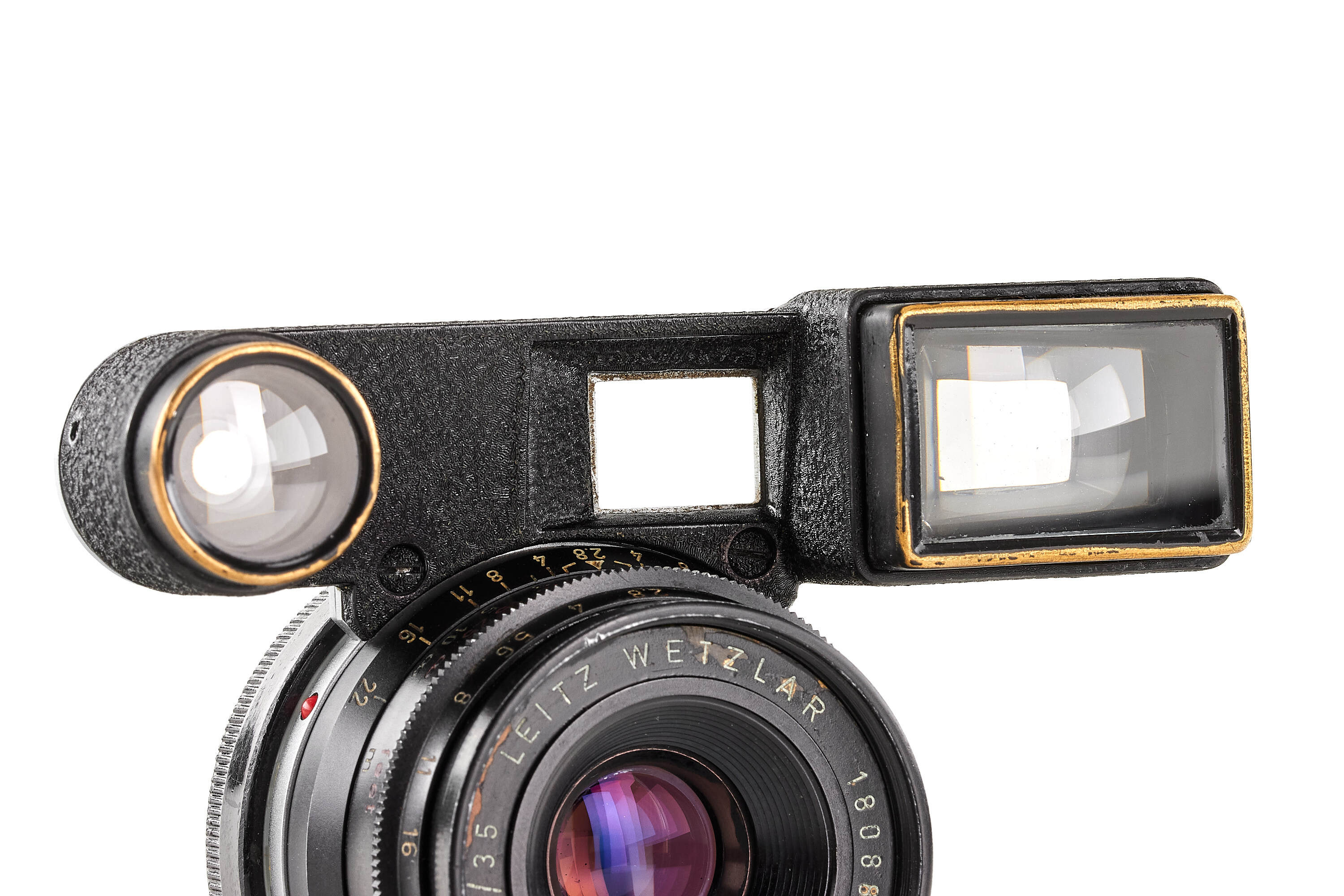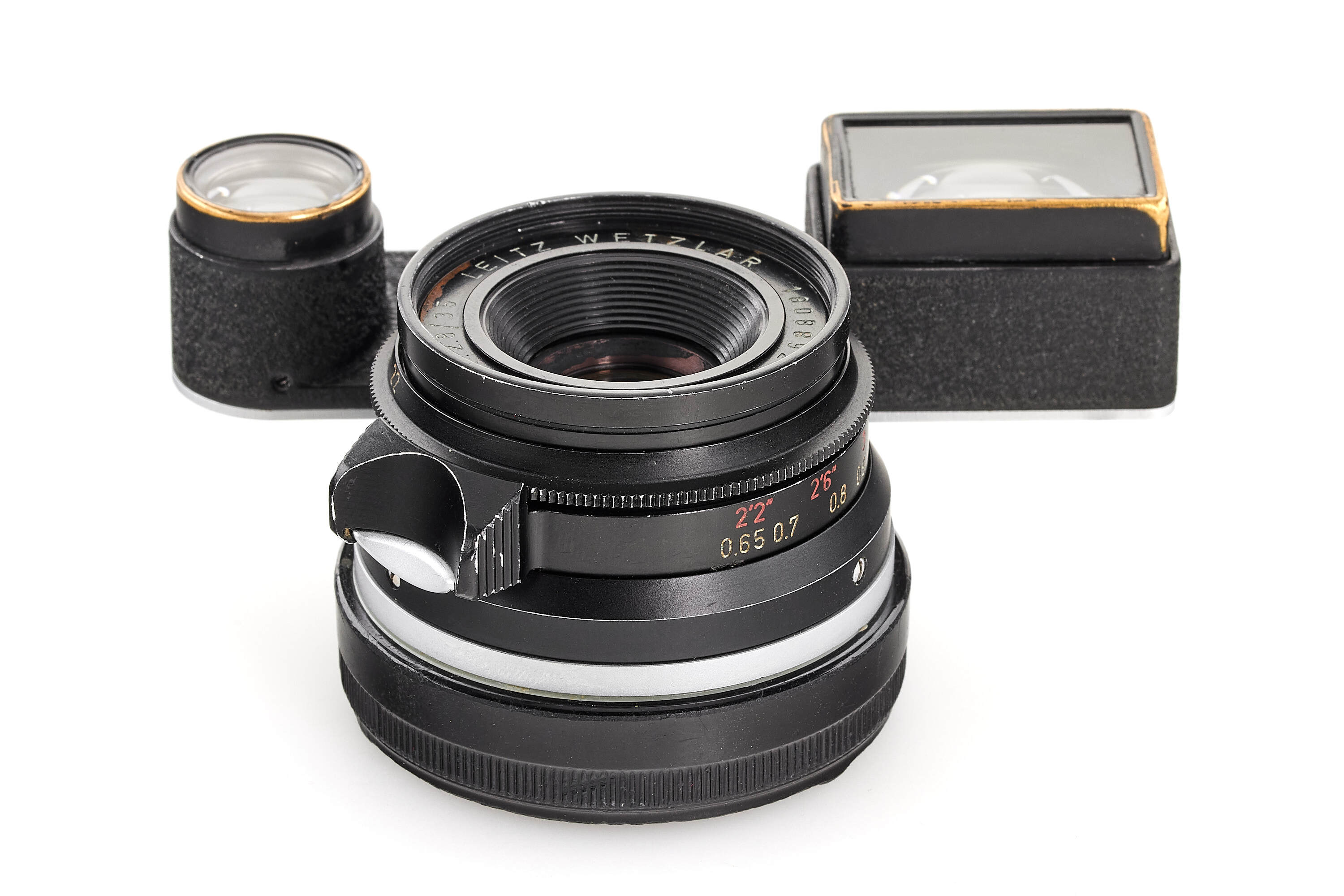 A very rare Summaron 11106 in black finish, with matching black paint goggles for use on a Leica M3. In very fine condition, with good optics. The lens was produced around 1961, but the delivery records show a blank entry for this serial number, suggesting it may have been made as an internal sample.