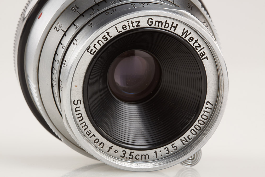 M3 Summaron with prototype serial number '0000117', in near mint condition, engraving is different to later lenses, black painted goggles with condenser logo (caps), this particular lens is illustrated in Paul-Henry van Hasbroeck 'A History Illustrating every Model and Accessory' on p.157, lenses nos.0000118 & 0000119 are illustrated in Paul-Henry van Hasbroeck 'Leica in Colour' p.66&127 - ex Paul-Henry van Hasbroeck collection