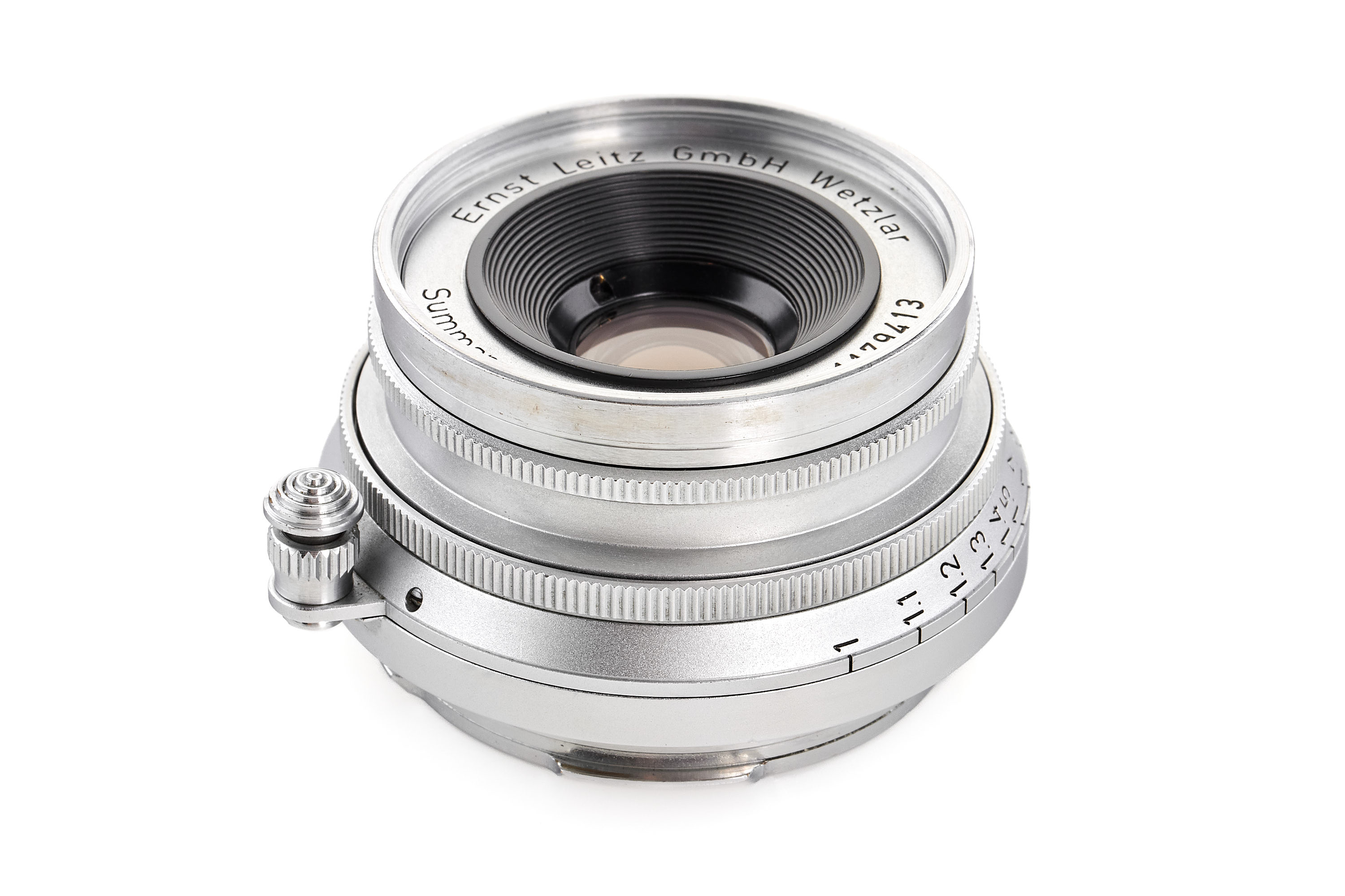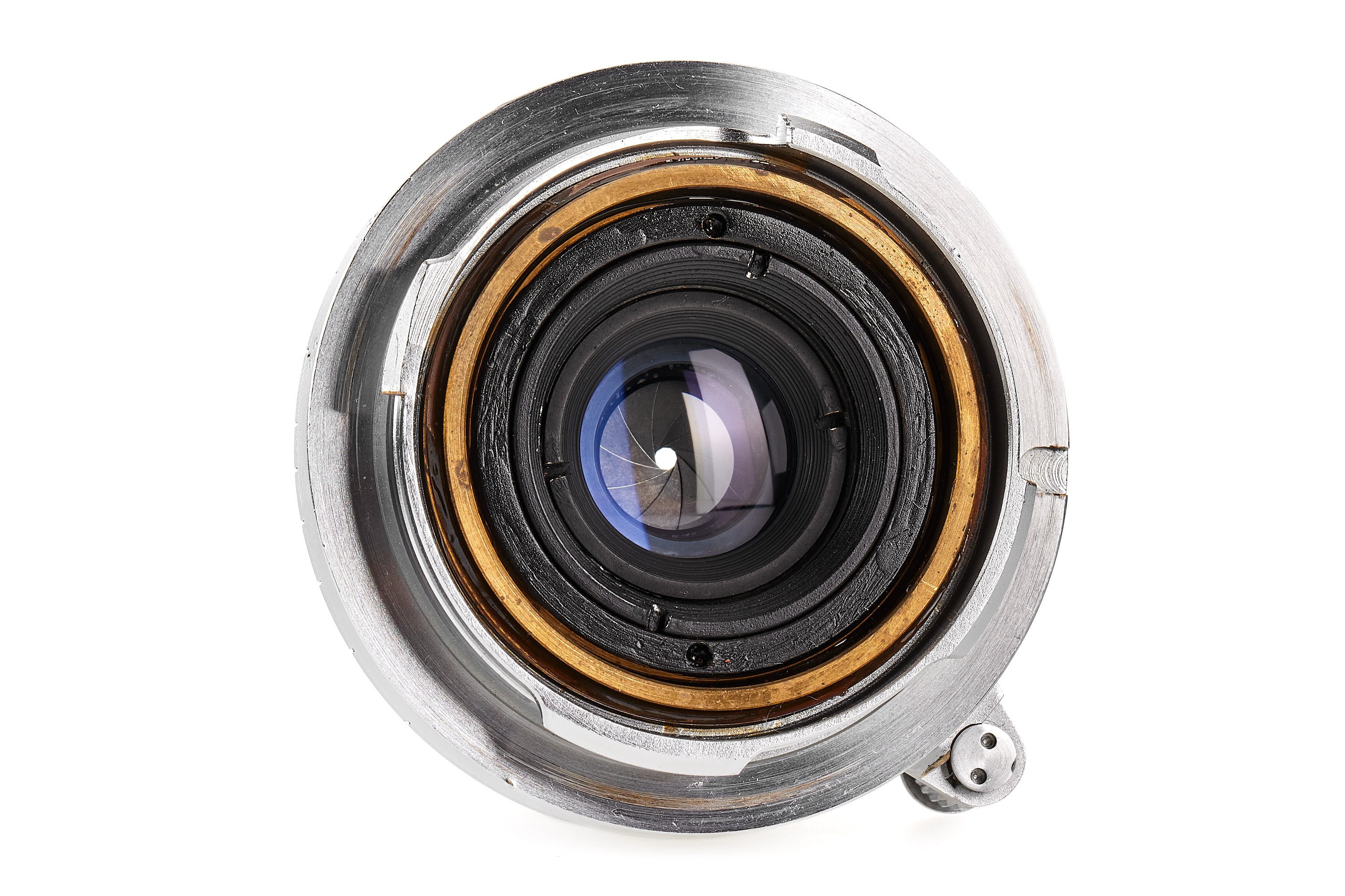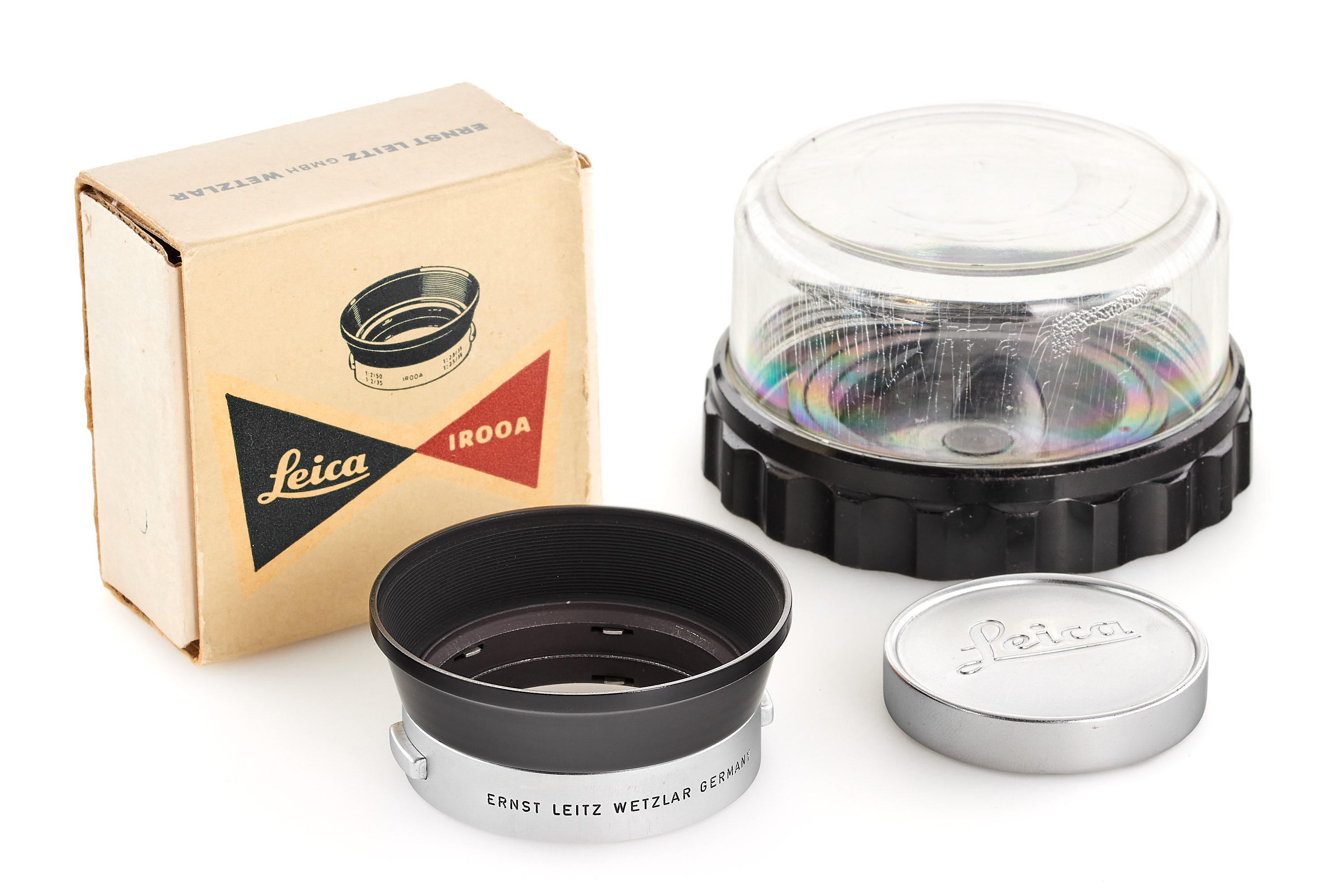 Beautiful early lens in almost mint condition, meter scale, optics only showing a light haze and discrete cleaning marks, with front lens cap, IROOA hood (maker's box) and plastic keeper, delivered to Hamburg on 28.03.1956.