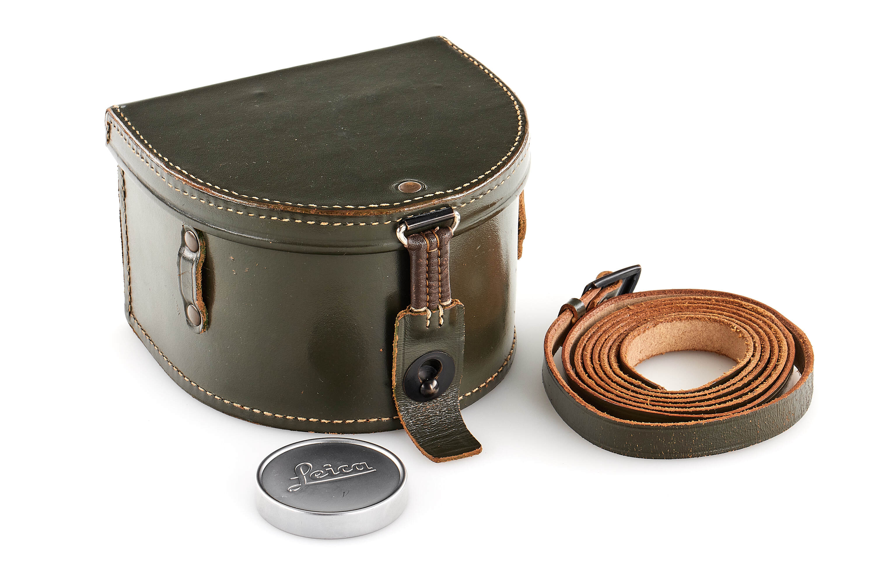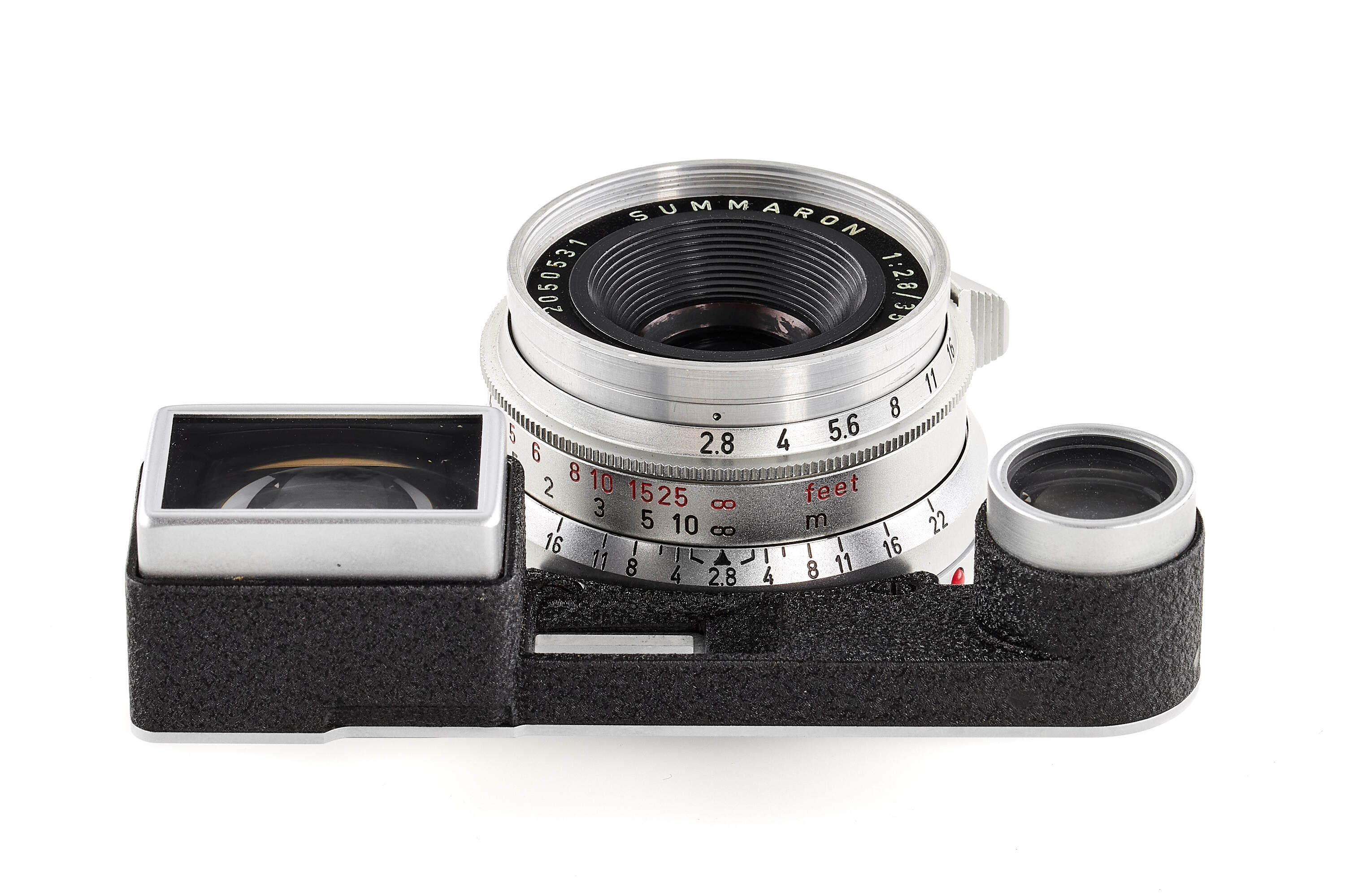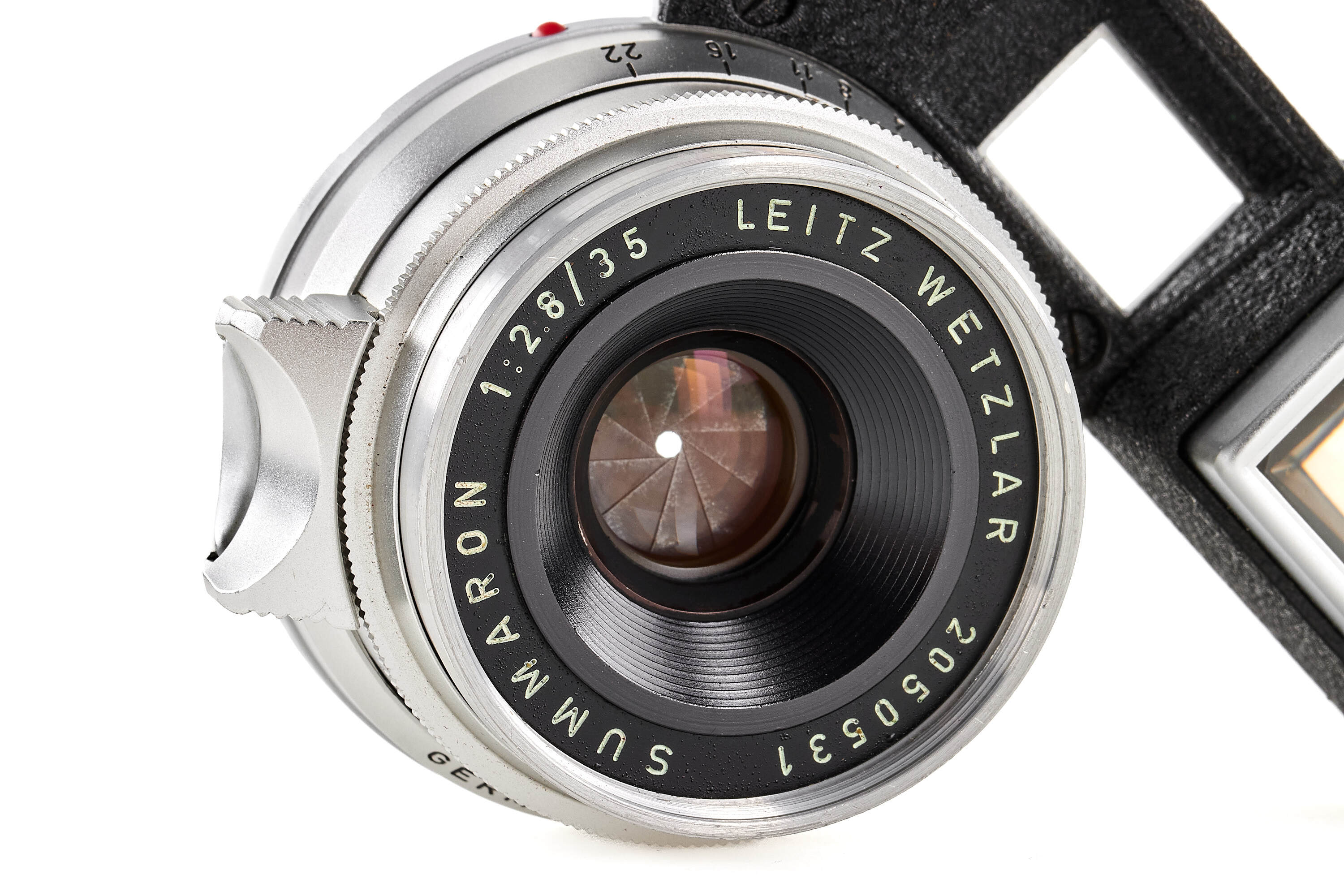 Very rare Summaron 2.8/35mm for the German Army engraved '6760-12-130-0901' on the side, in almost mint condition, version for Leica M3, with clean and clear optics, goggles showing a light haze, with front cap, original olive green keeper marked '14 564 M', with matching green strap, delivered to Koblenz on 07.09.1965.