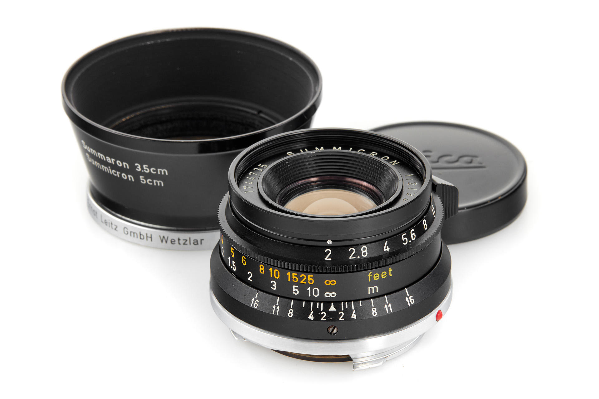 Sought-after black 8-elment Summicron in beautiful, near mint condition (only some paint loss on the infinity lock), very good optics (only a few hairline marks), incl. black-paint ITDOO hood and black paint front cap