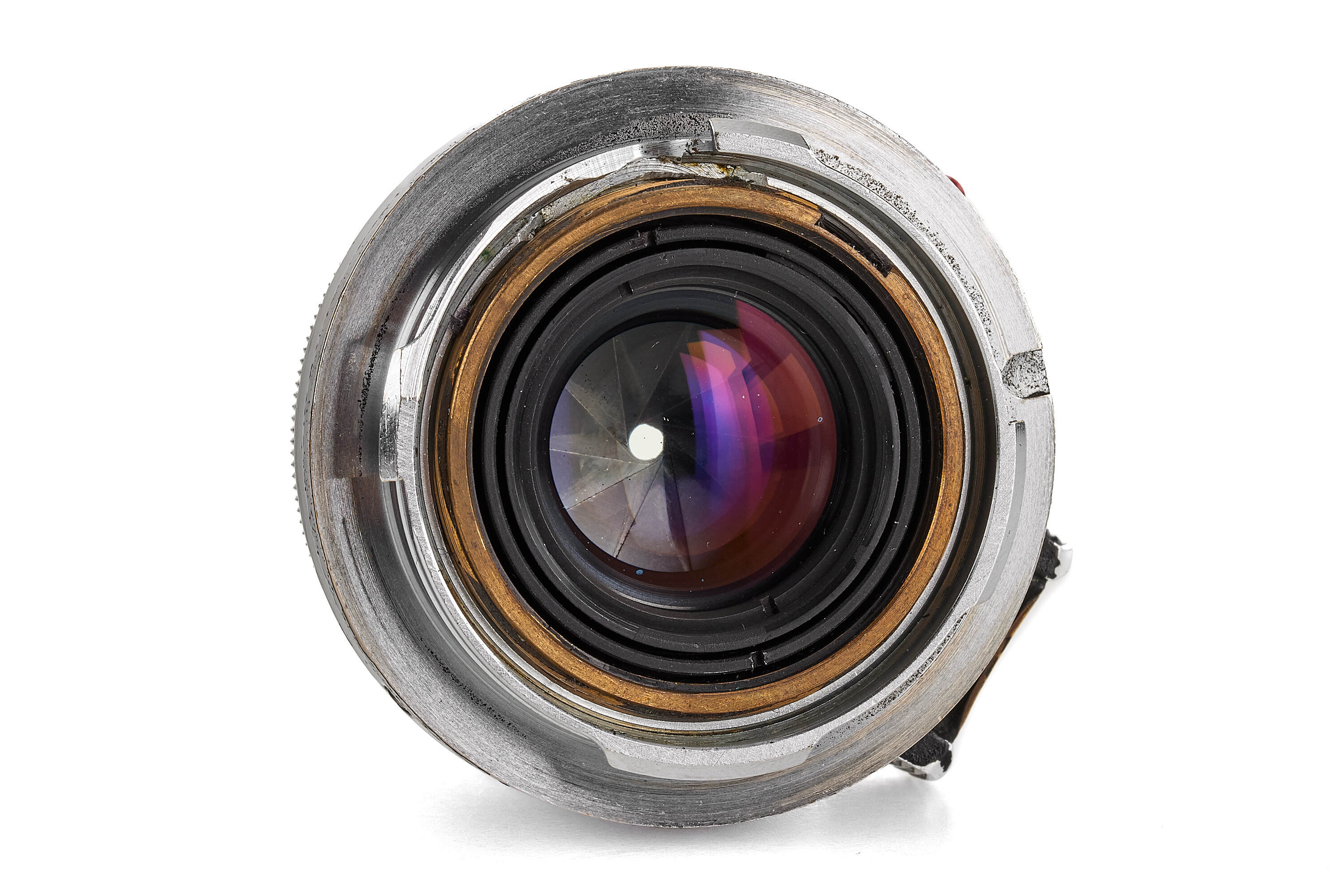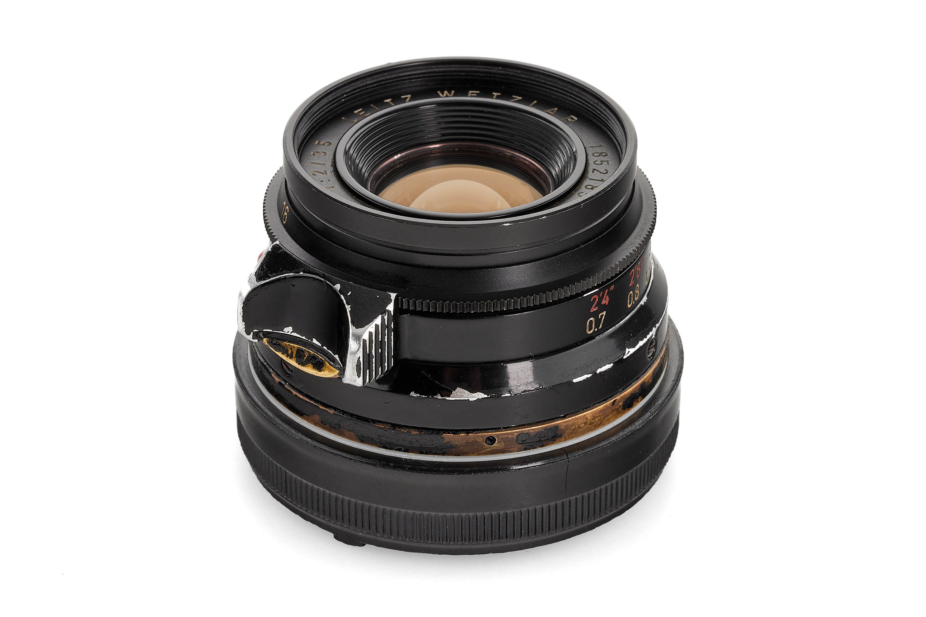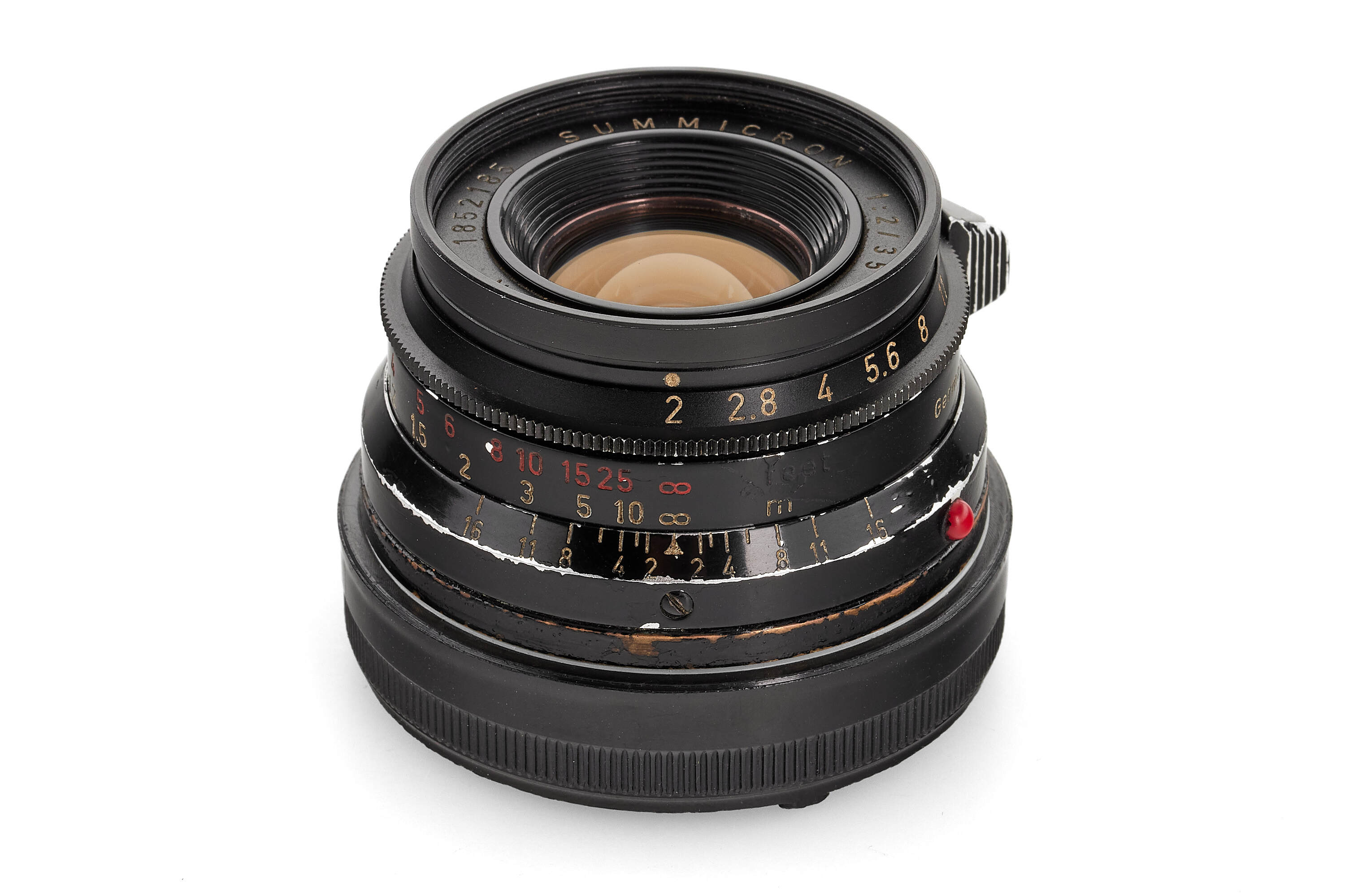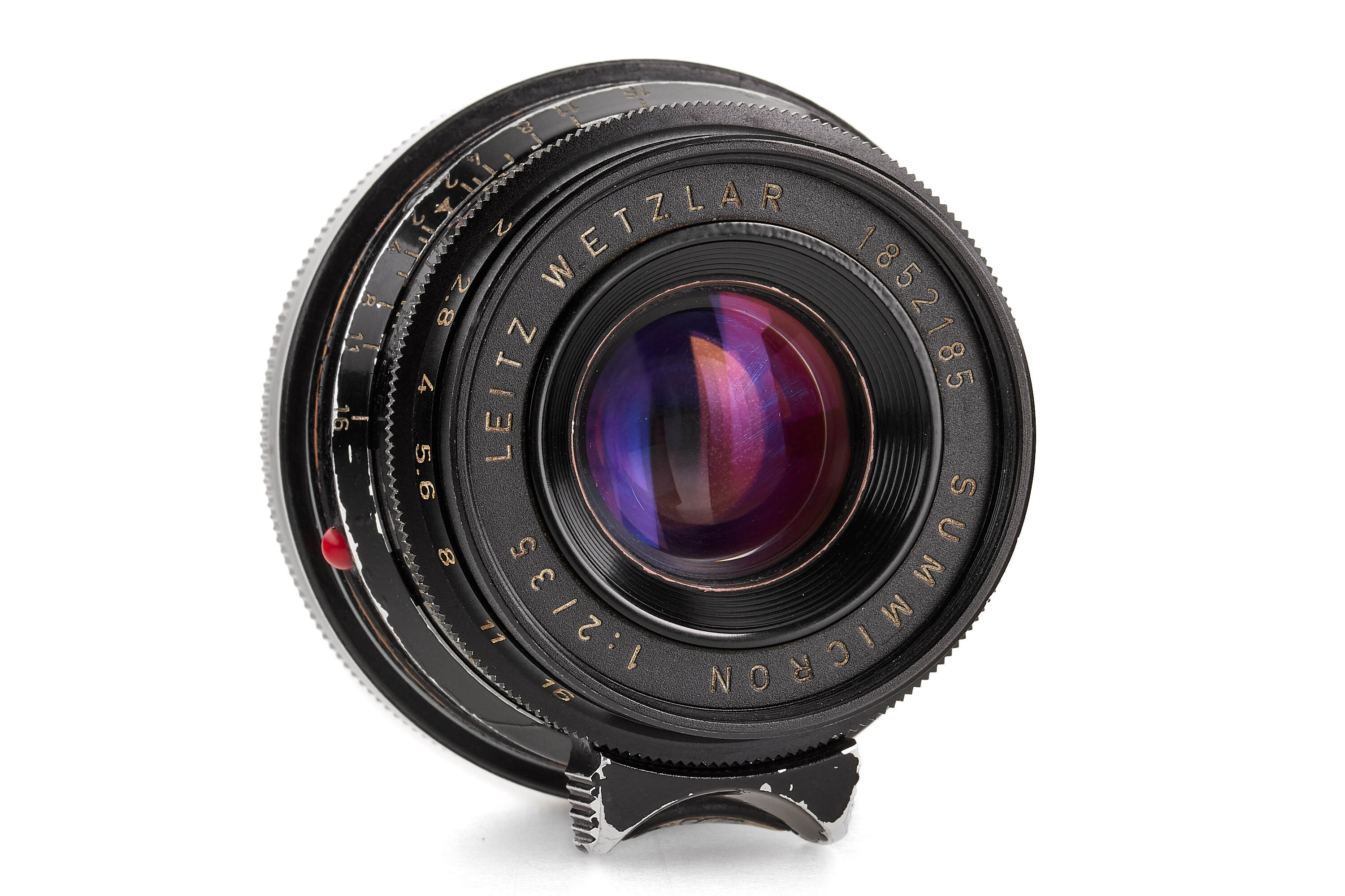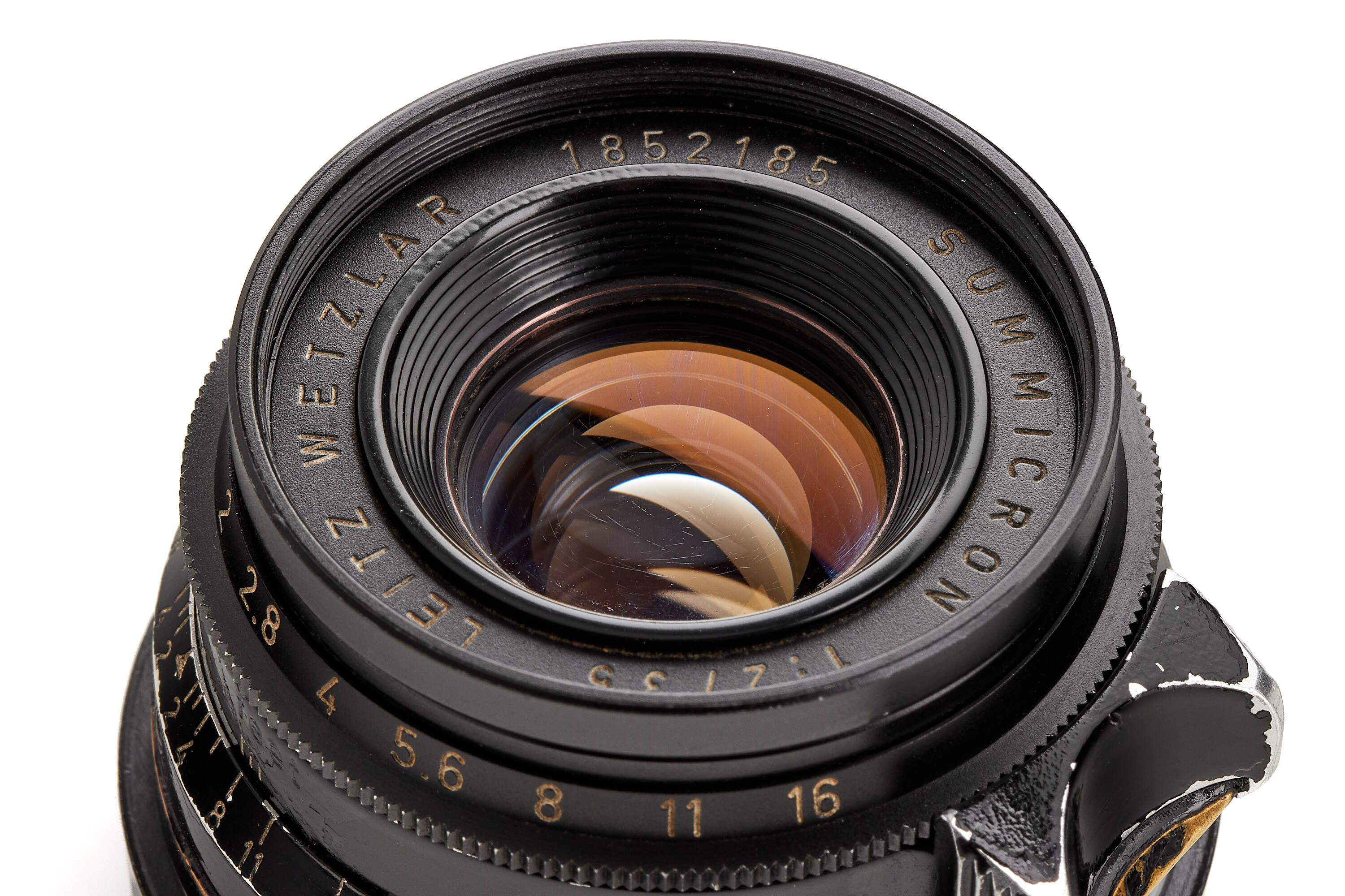 Sought-after, original black paint 8-element Summicron 35 mm, in good condition with attractive patina of use around the edges. The optics are clean, with only minimal cleaning marks visible. Delivered to Leitz Hamburg on January 14, 1963. With original black paint front cap and rear cap.