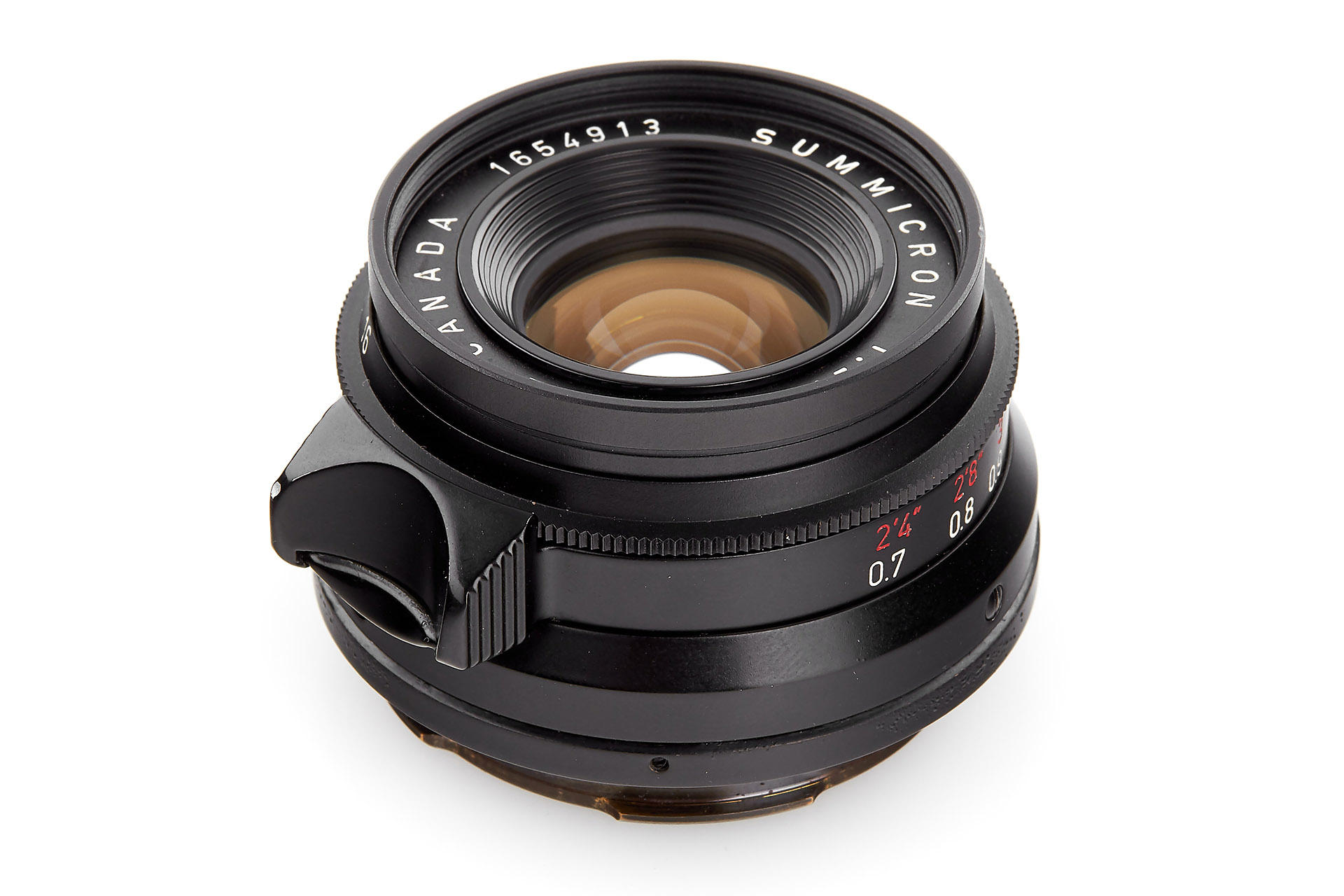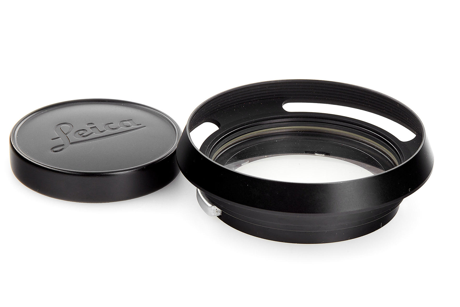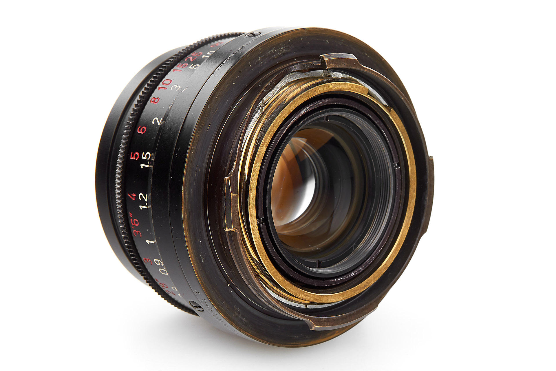 Very rare and early first type black paint 8-element Summicron with brass bayonet flange. In near mint condition with clean optics, black front cap, plastic keeper, unnumbered maker's box.