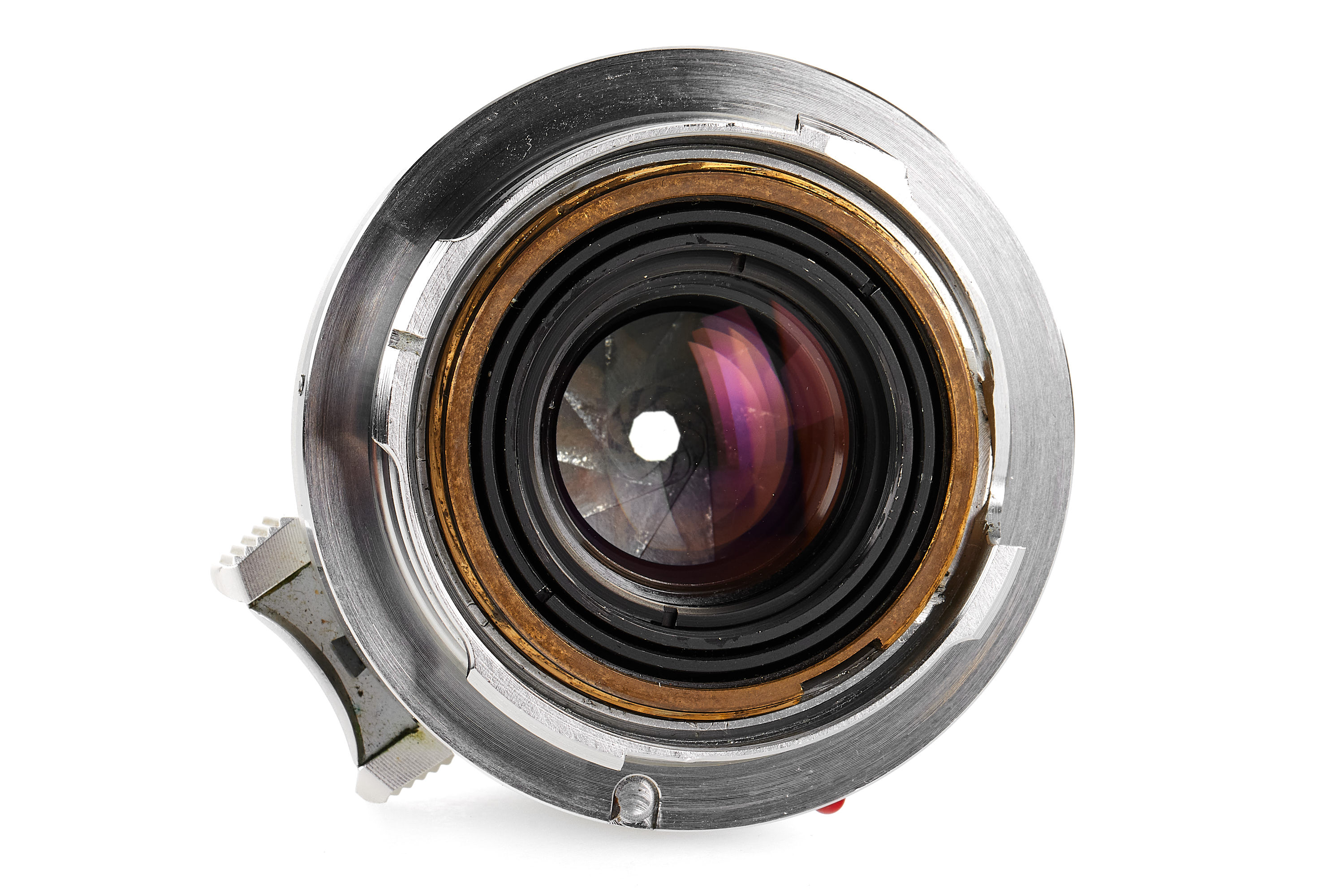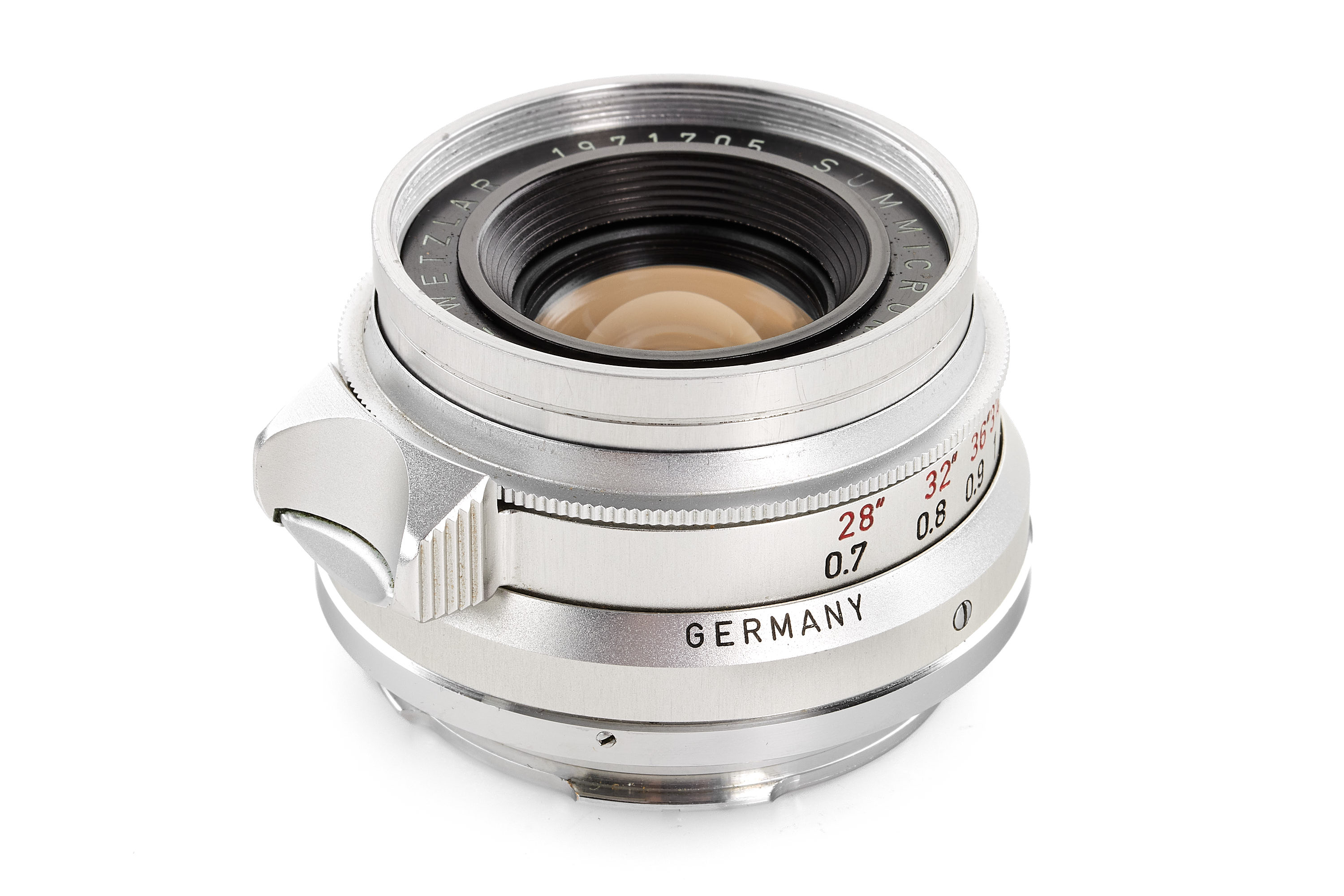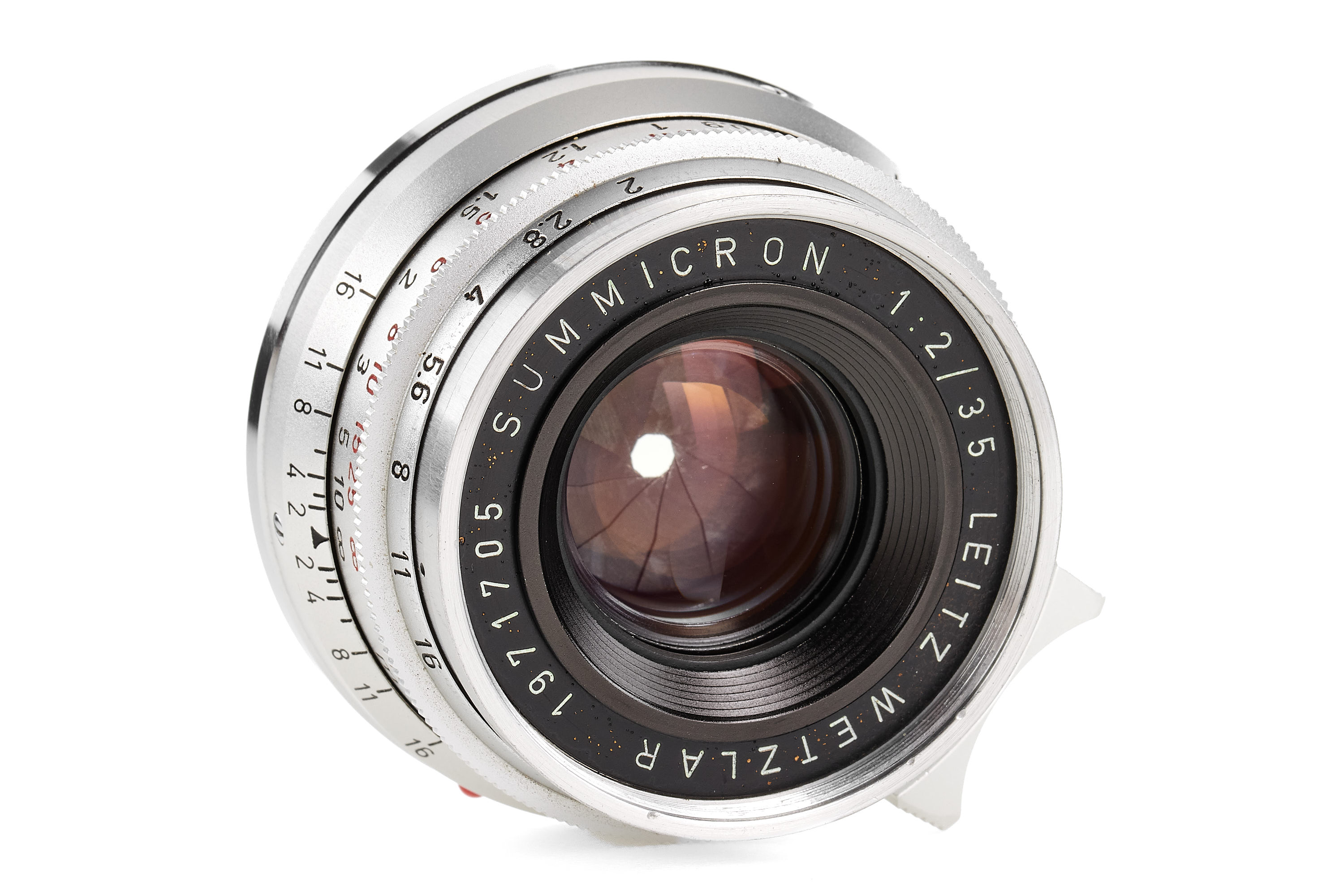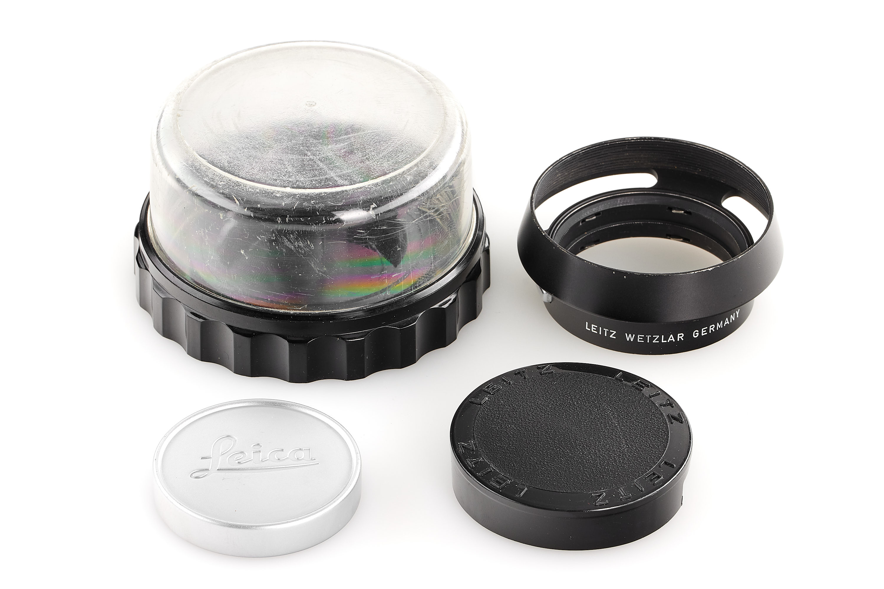 Beautiful sought-after 8-element Summicron 35mm in mint condition, very good optics only showing few light cleaning marks, with 12585H hood (with plastic cap), metal front lens cap and plastic keeper, delivered to Tiranty, Paris on 04.10.1963.