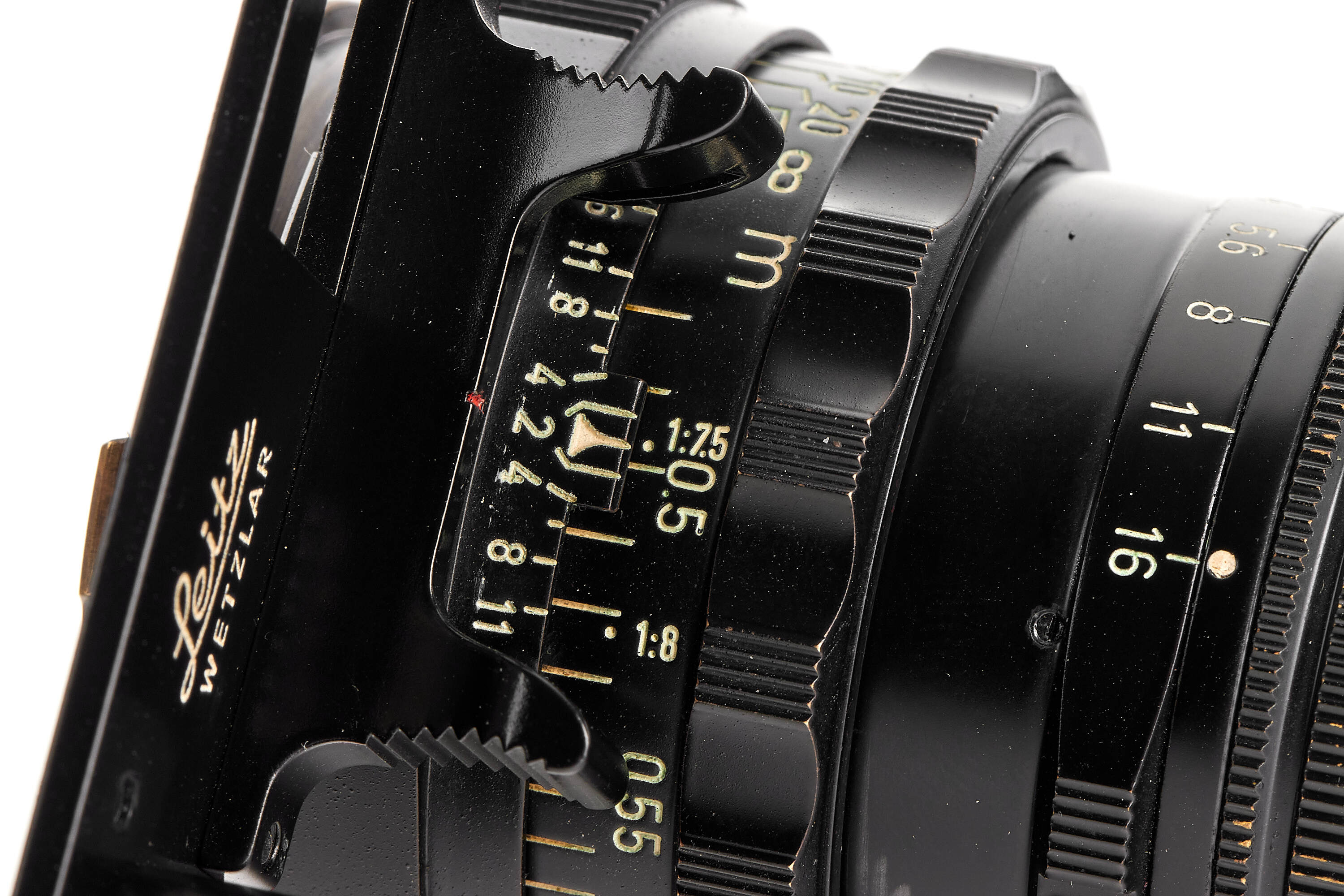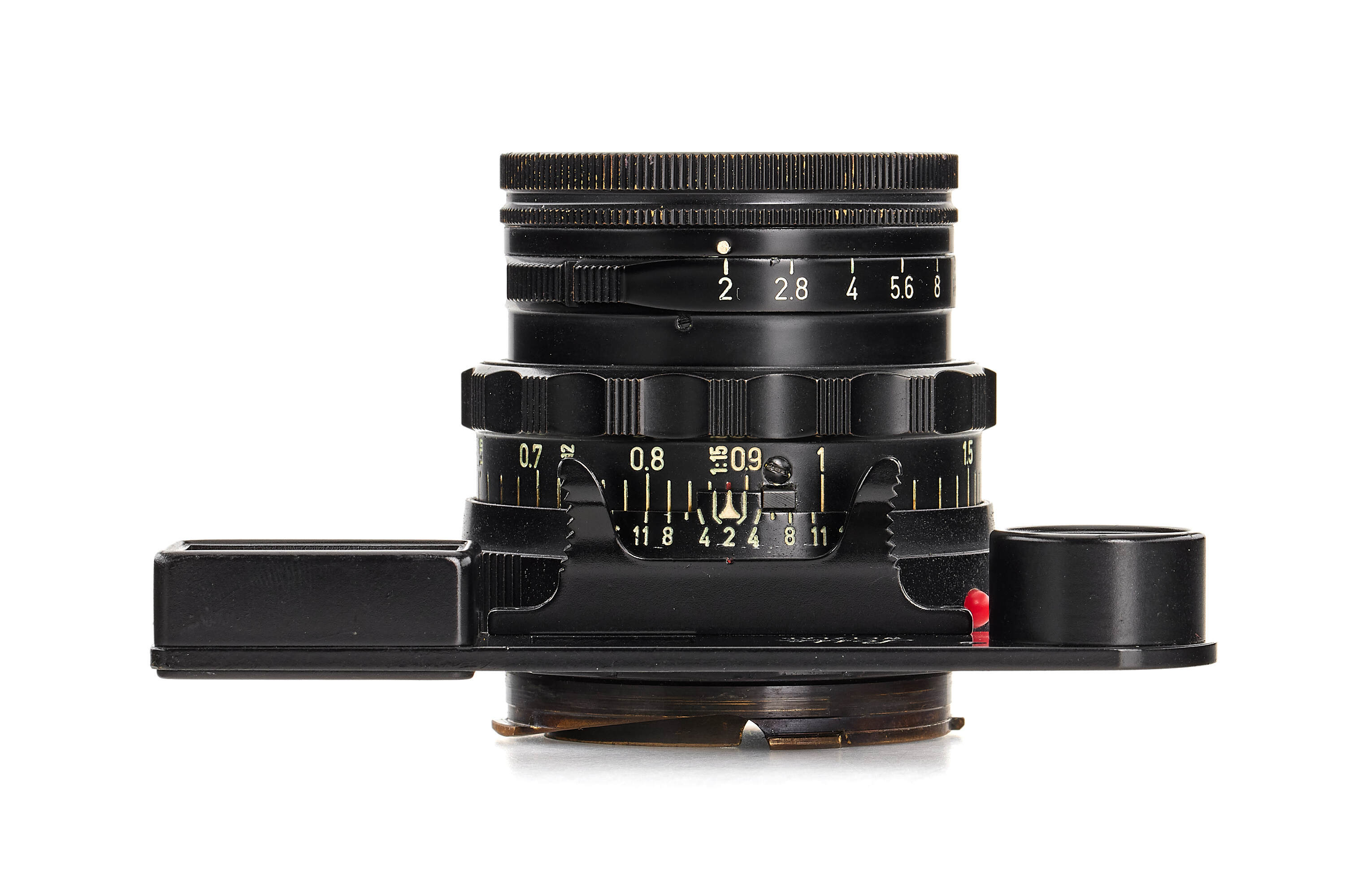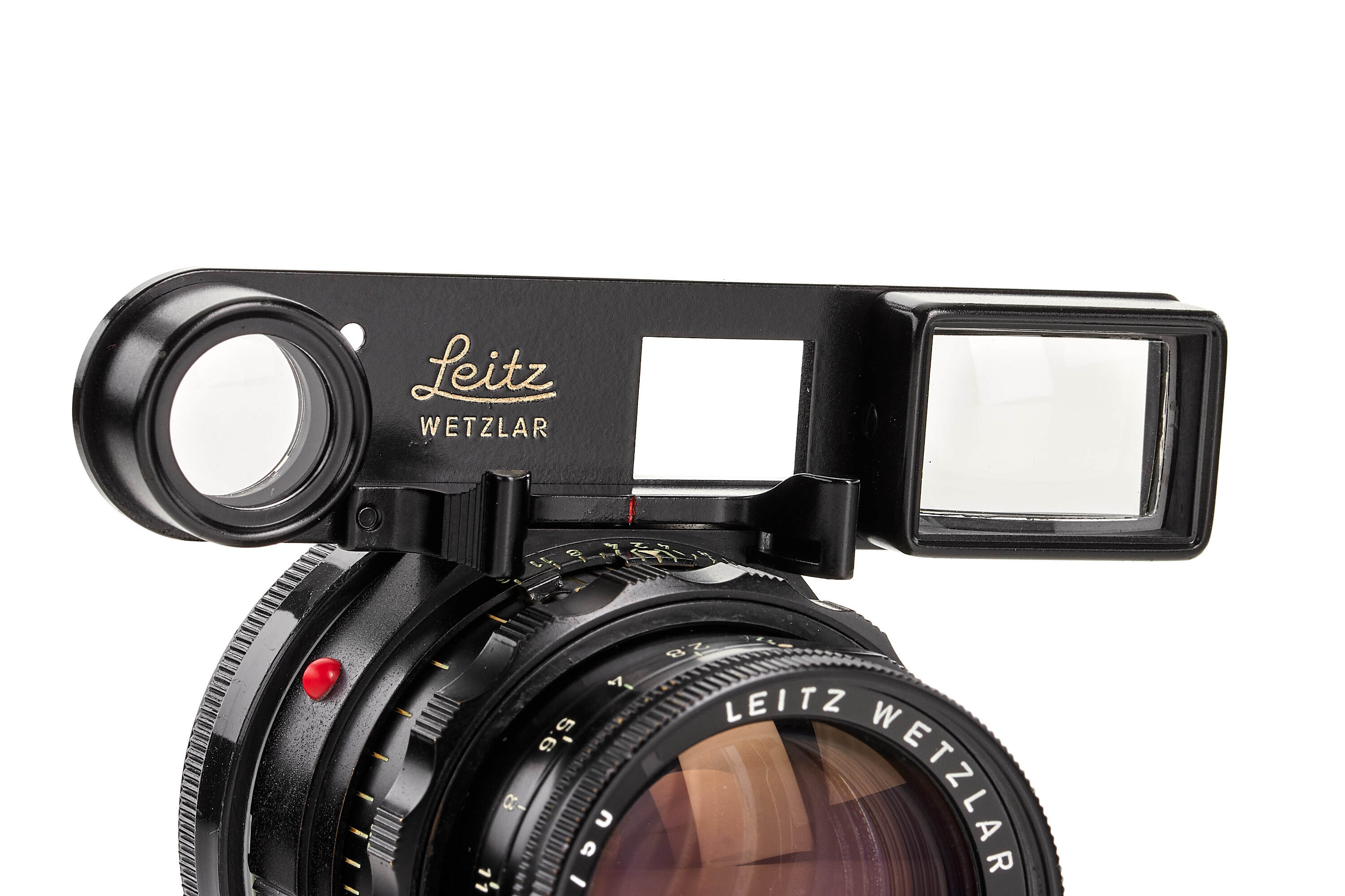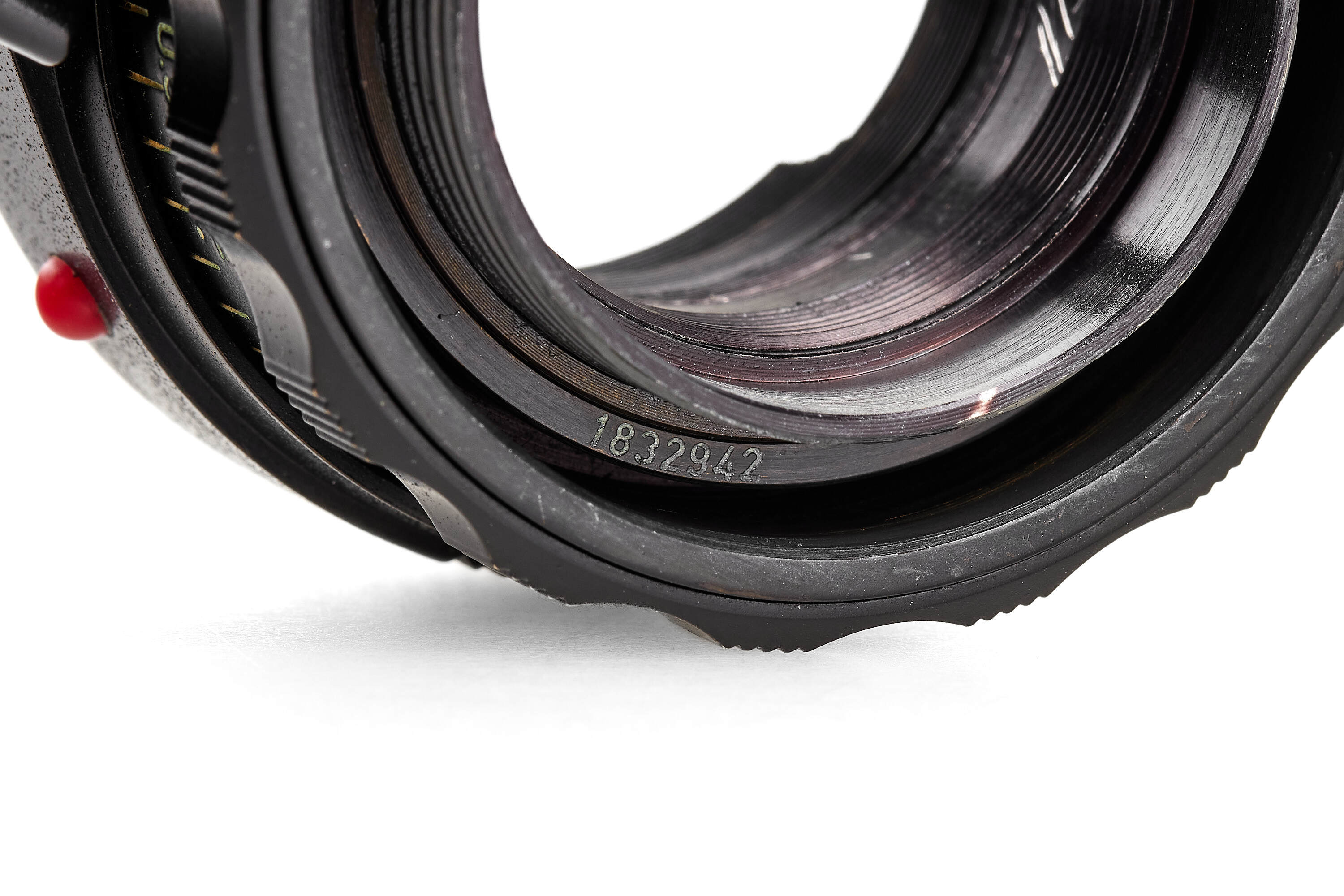 An extremely rare Dual-Range Summicron 50mm lens in original black paint finish. This version was produced in very limited numbers, likely only by special order. The example offered here is in beautiful, near-mint condition, with the focusing mount engraved with the matching serial number. The included goggles have been professionally converted from chrome to black paint. This exact lens is documented in Lars Netopil’s Prototype Leica, pages 436–437.