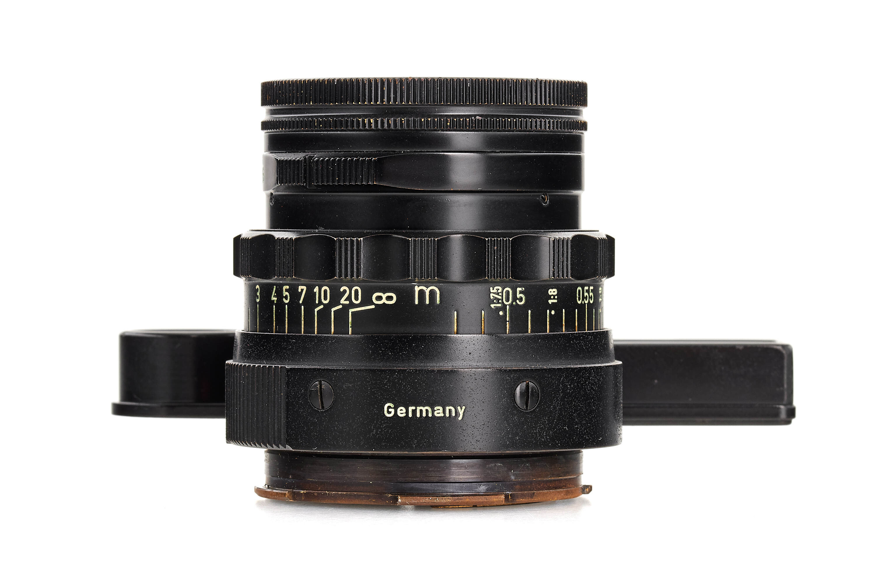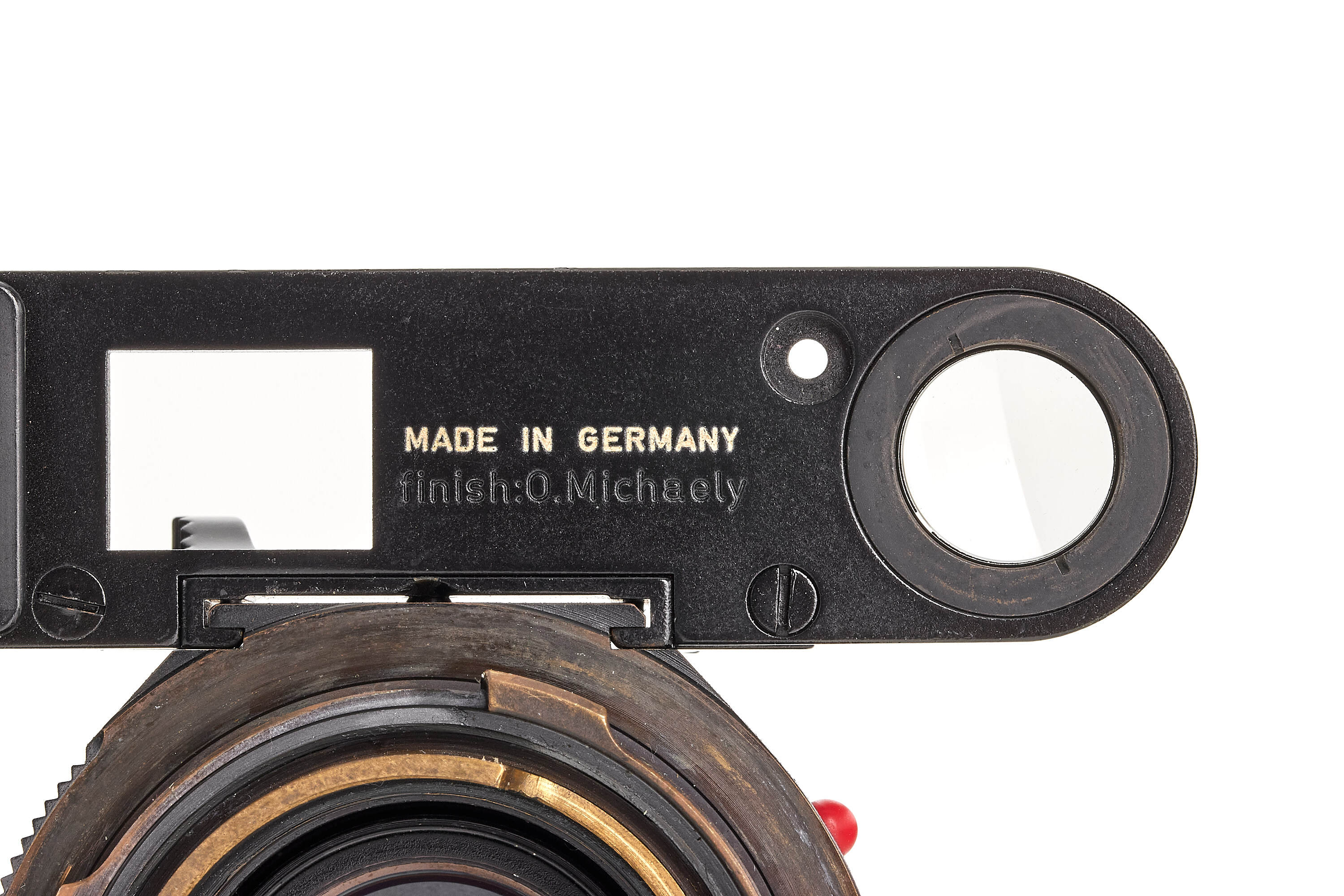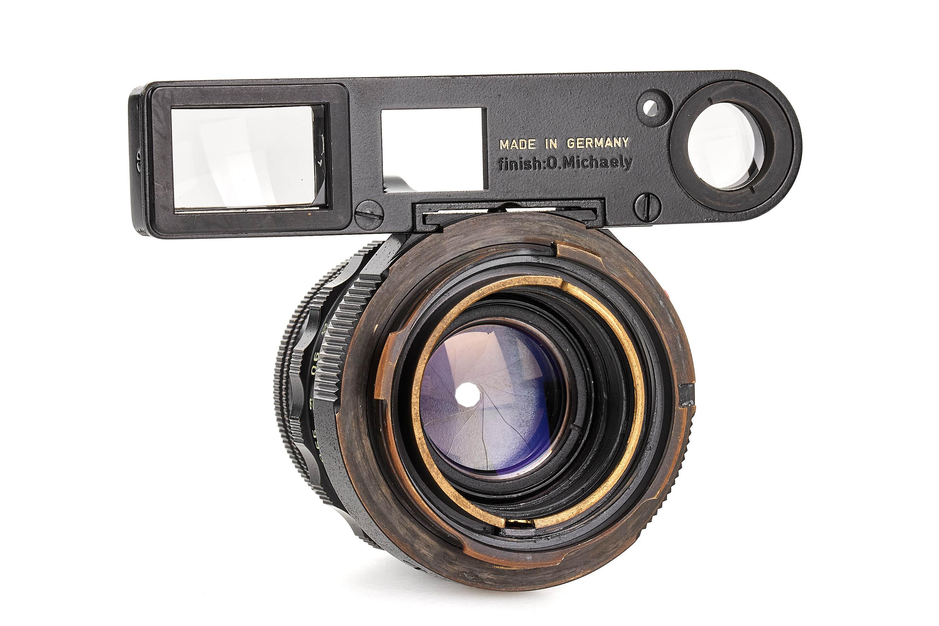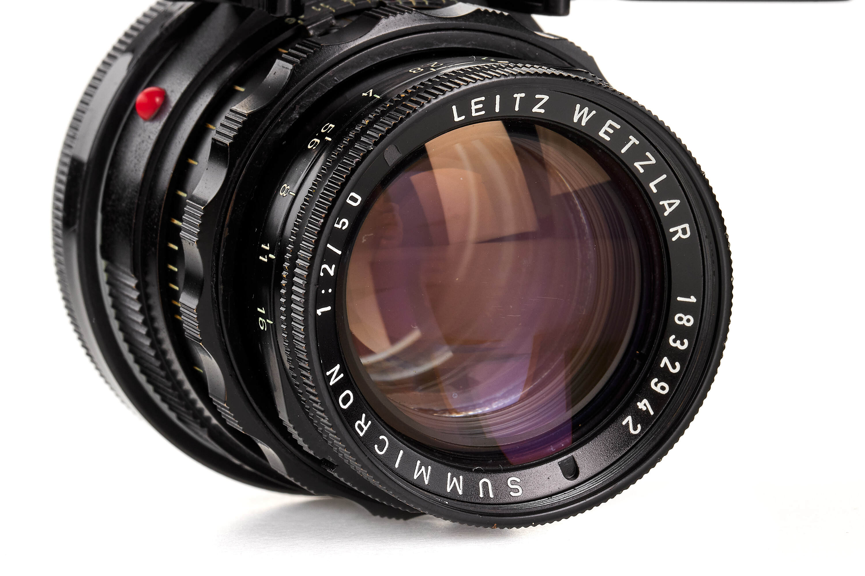 An extremely rare Dual-Range Summicron 50mm lens in original black paint finish. This version was produced in very limited numbers, likely only by special order. The example offered here is in beautiful, near-mint condition, with the focusing mount engraved with the matching serial number. The included goggles have been professionally converted from chrome to black paint. This exact lens is documented in Lars Netopil’s Prototype Leica, pages 436–437.