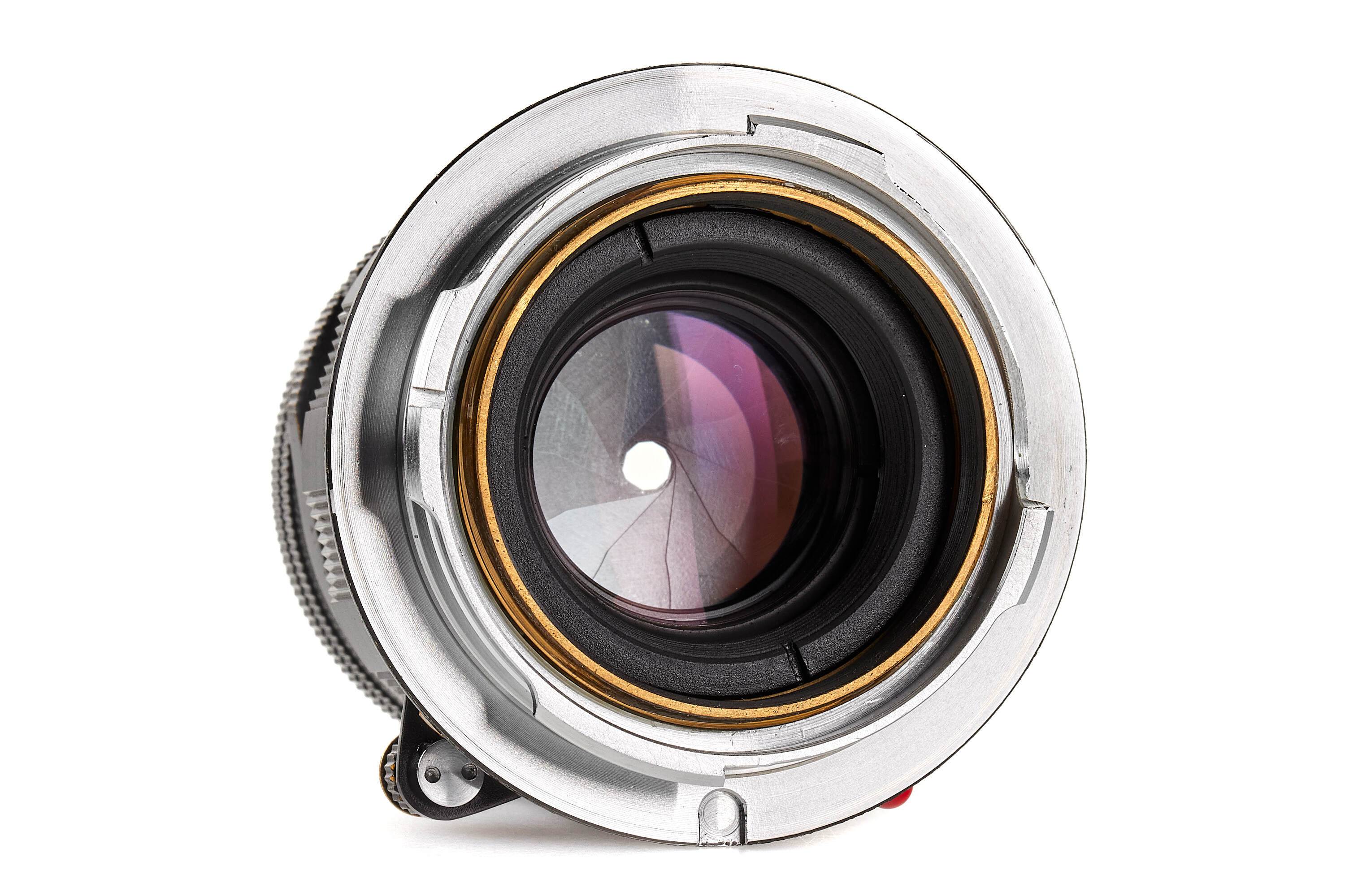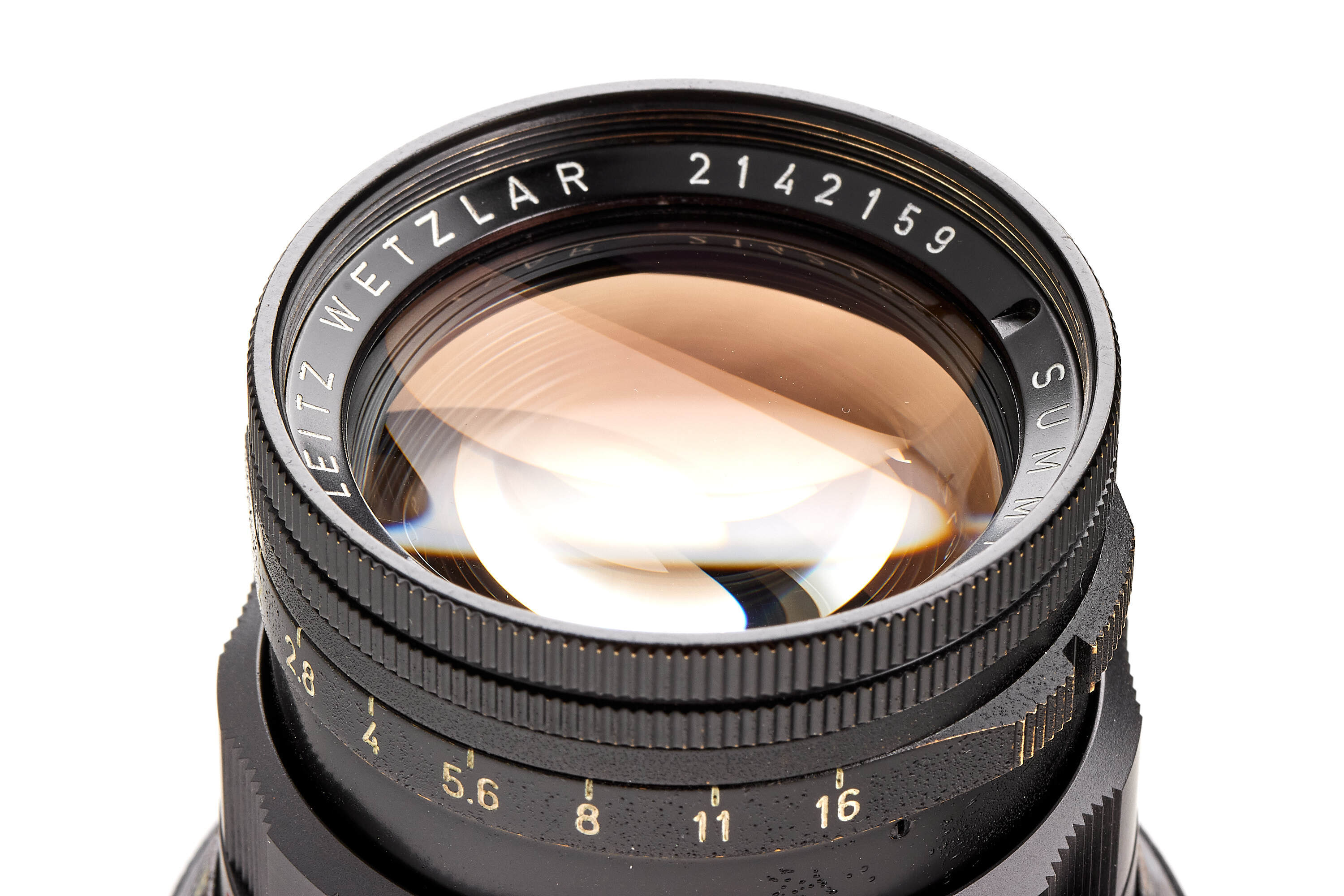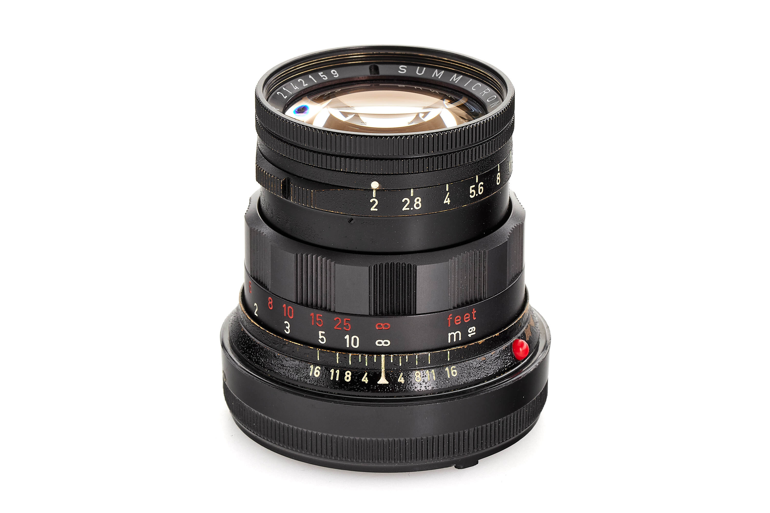 A beautiful black paint Summicron 50mm with amazing minimal patina and small bubbles appearing in the paint, with very good optics, including a matching brass / black paint cap (also showing small bubbles), black paint ITDOO hood, rear cap and plastic keeper.