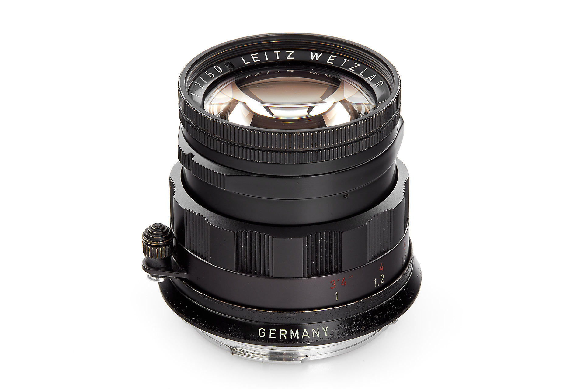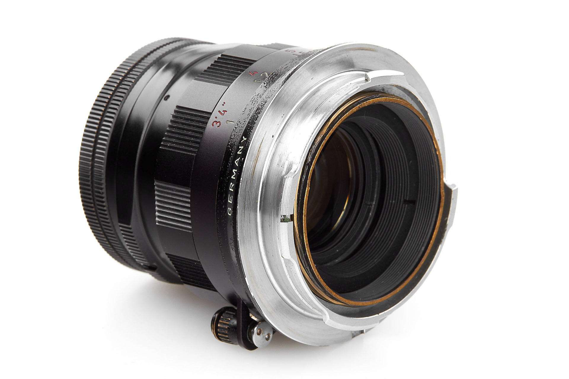 original and very rare late version with double scale, anodized focusing ring and chrome lens mount, in beautiful condition, with brass black paint front cap and plastic keeper