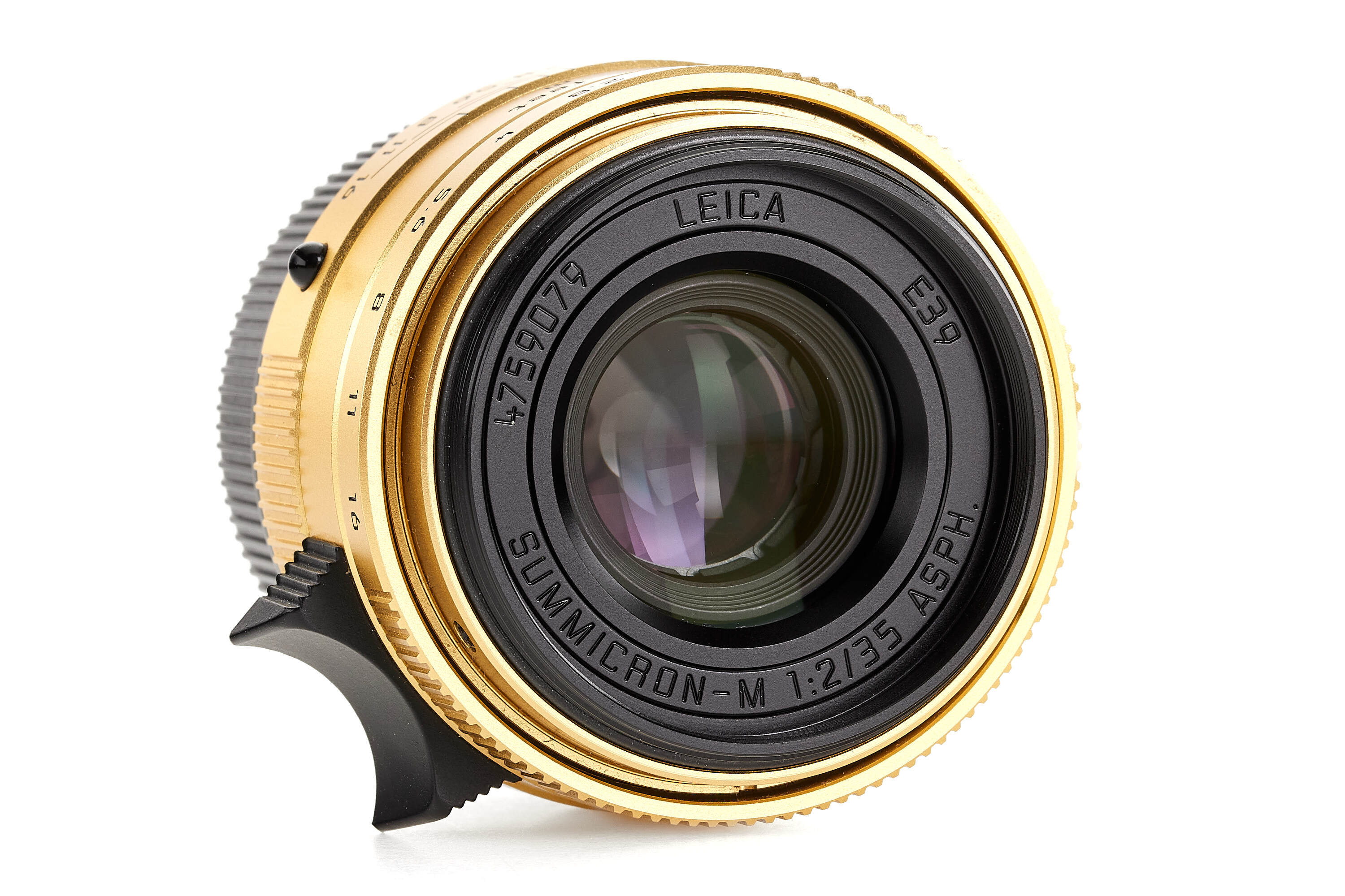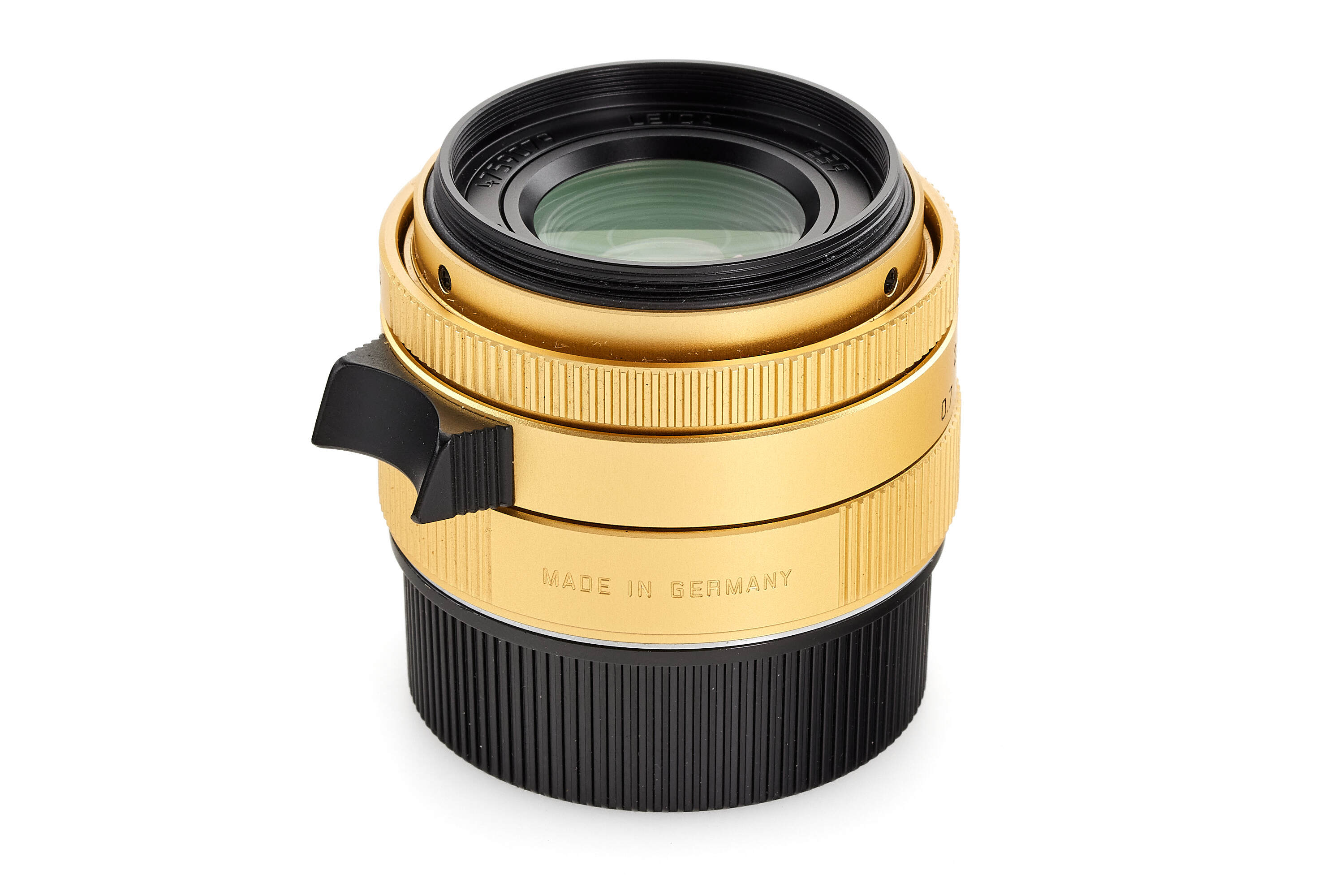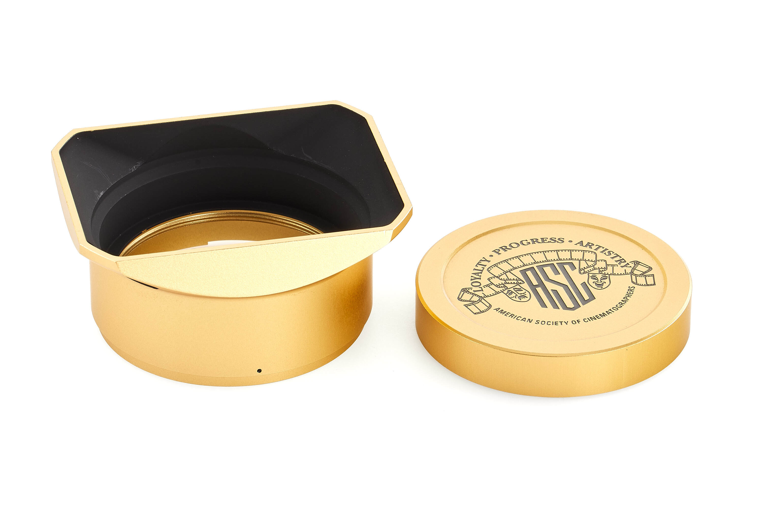 Beautiful rare lens in special black/gold-colored anodized version, originally delivered together with the Leica M10-P 'ASC 100 Edition' celebrating the 100th anniversary of the American Society of Cinematography, limited to 300 pieces, in absolutely mint condition, clean and clear optics, with matching hood, front cap with special engraving, rubber front cap, rear cap and presentation box.