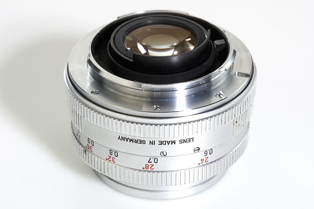 from a small group of pre-series lenses without type- or makers engravings, the front ring only engraved 1:2/502000782, produced for testing before introduction of the Leicaflex, less than 50 of these lenses were completed, in original and very nice condition, clear lenses, caps, 12564K hood, a similar lens is shown in Lager II page 261