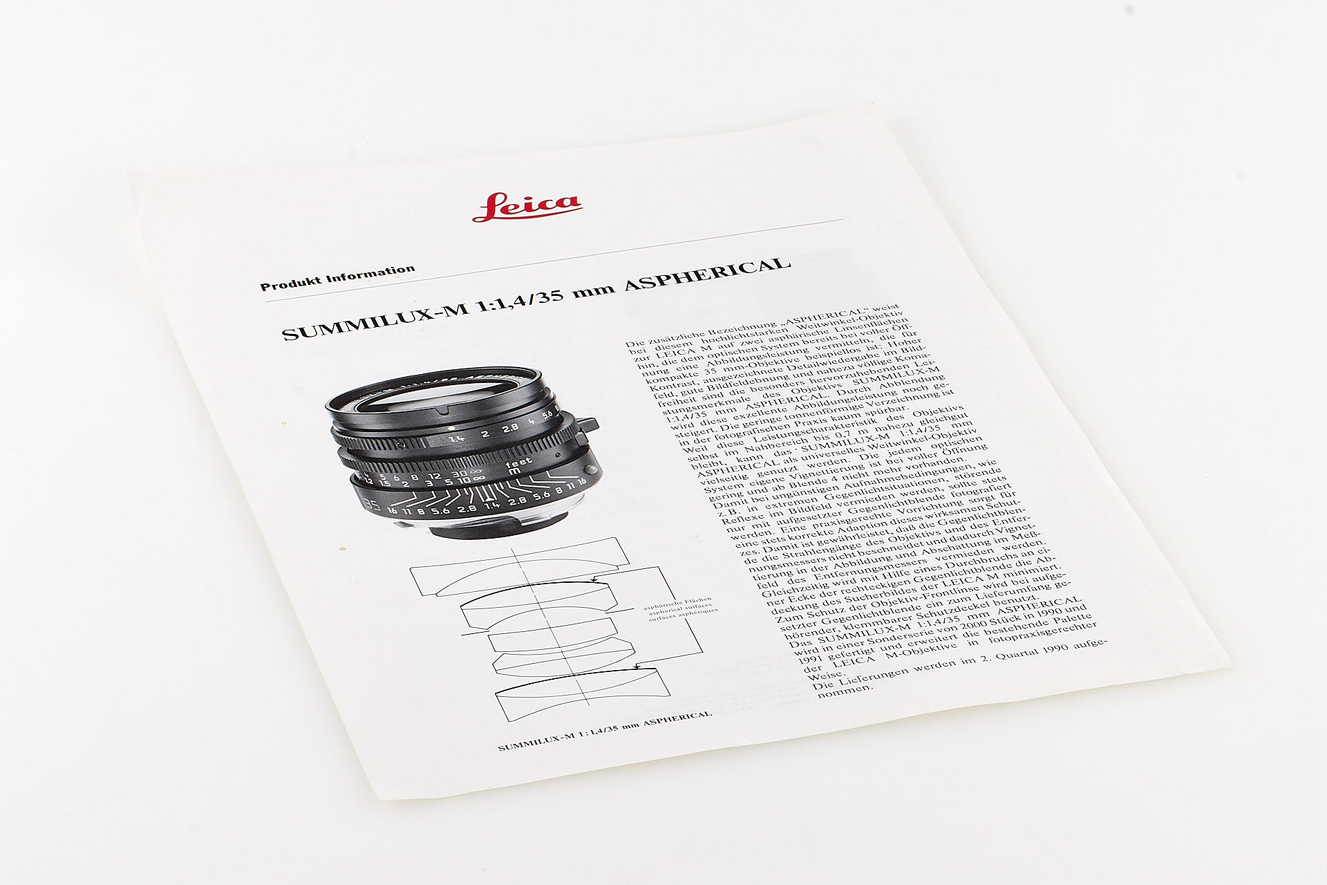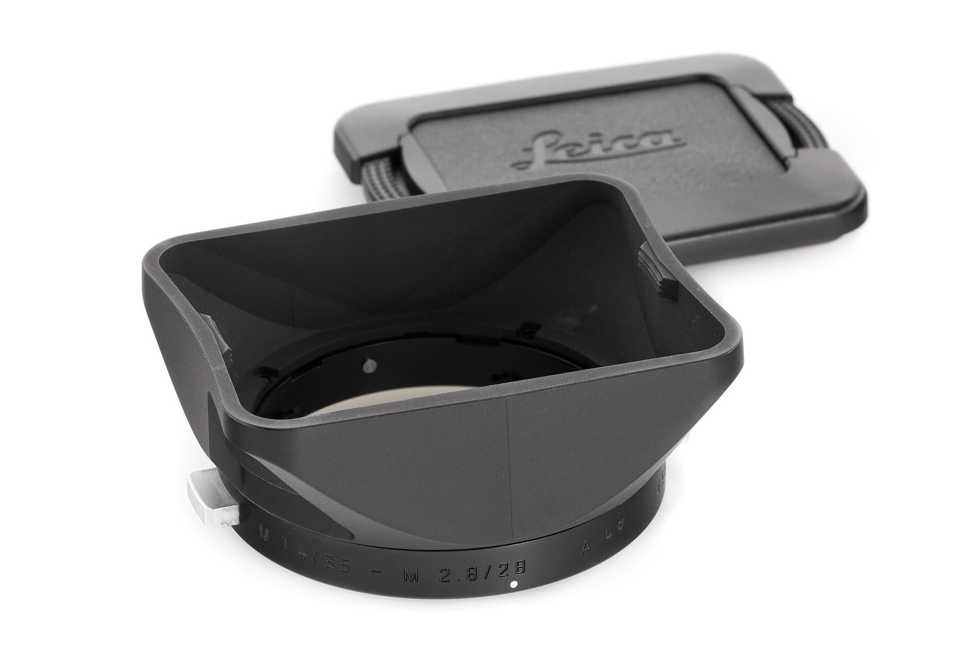 rare hood for the sought-after aspherical Summilux 35mm, the second, upgraded version with upgraded catches (not scratching the lens' rim), in mint, unused condition, with proper cap 14013, including a German product information brochure for the lens