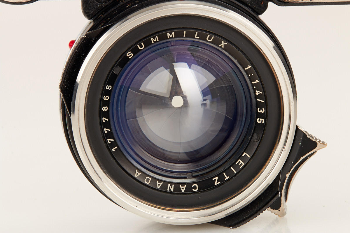 black Summilux for M3 with chrome front ring in very fine condition, only the focusing handle, infinity lock button and goggles with some more wear (crisp aperture stops, clear lenses with a few tiny cleaning marks on front lens element, rear cap)