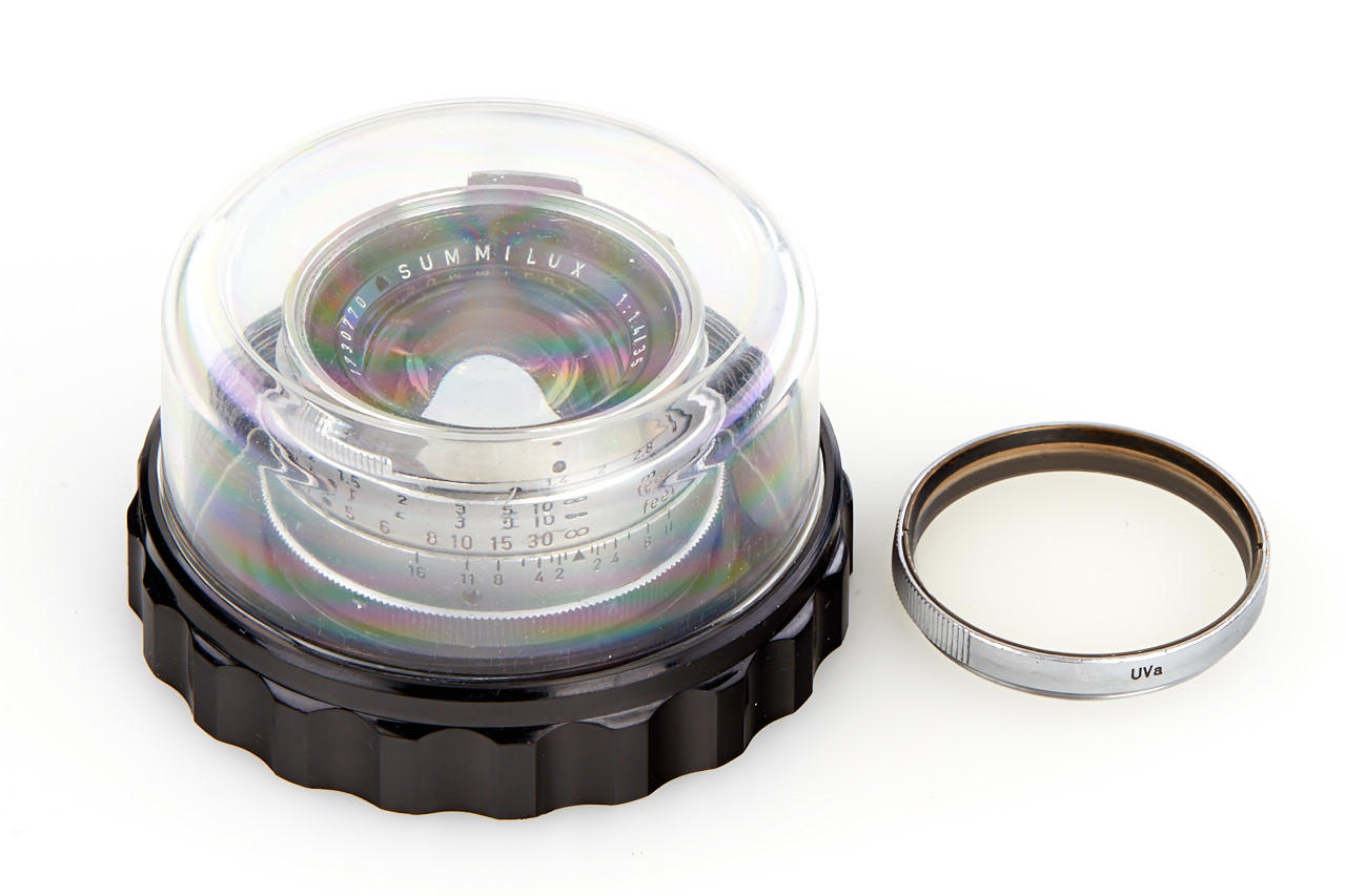 rare and sought-after chrome steel rim M2 lens in very good condition, almost perfect optics, with plastic keeper and UVa filter