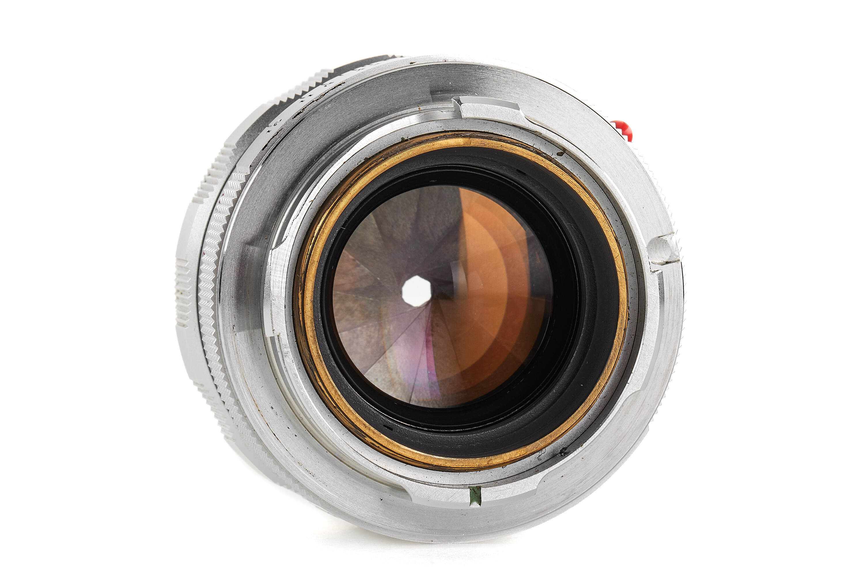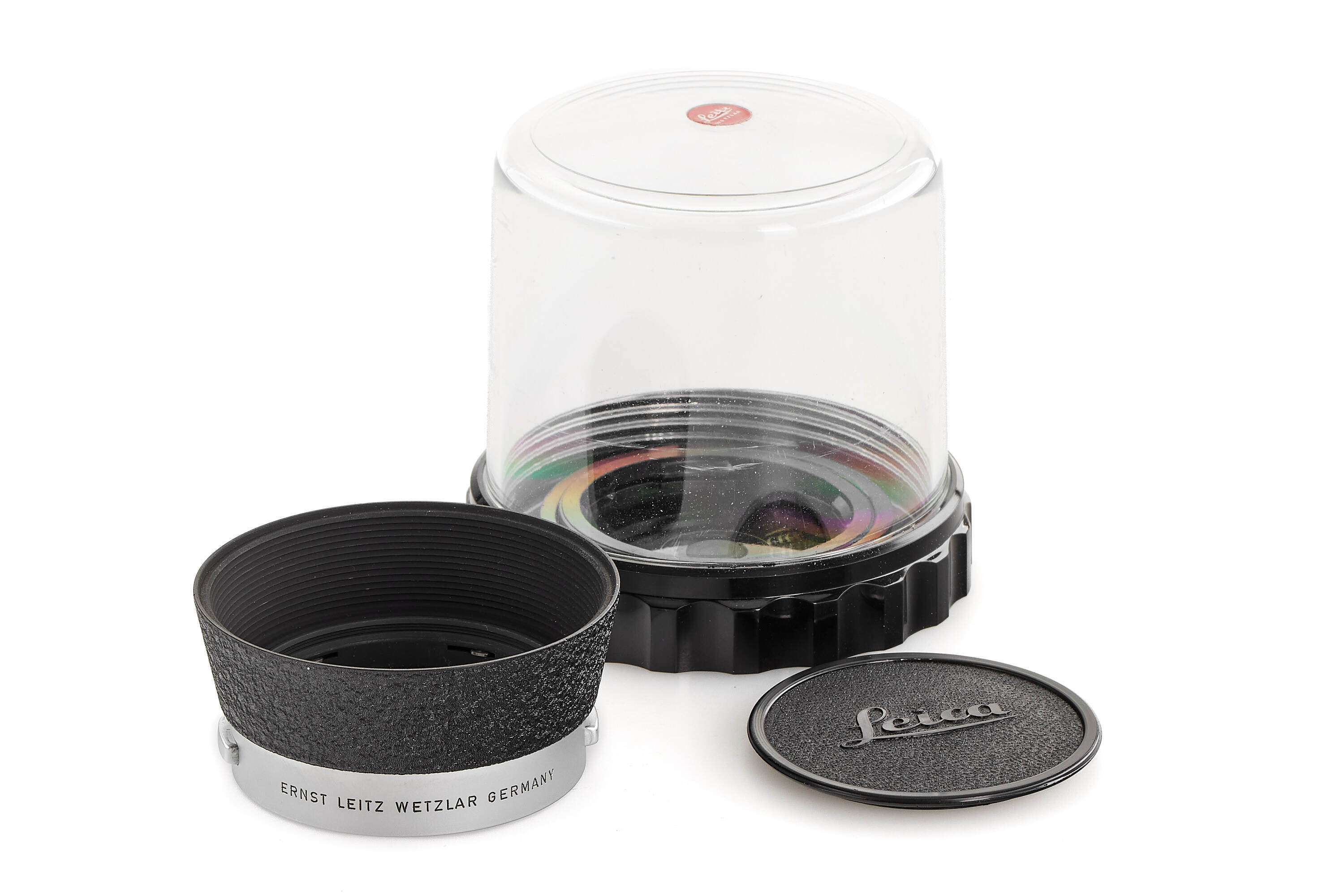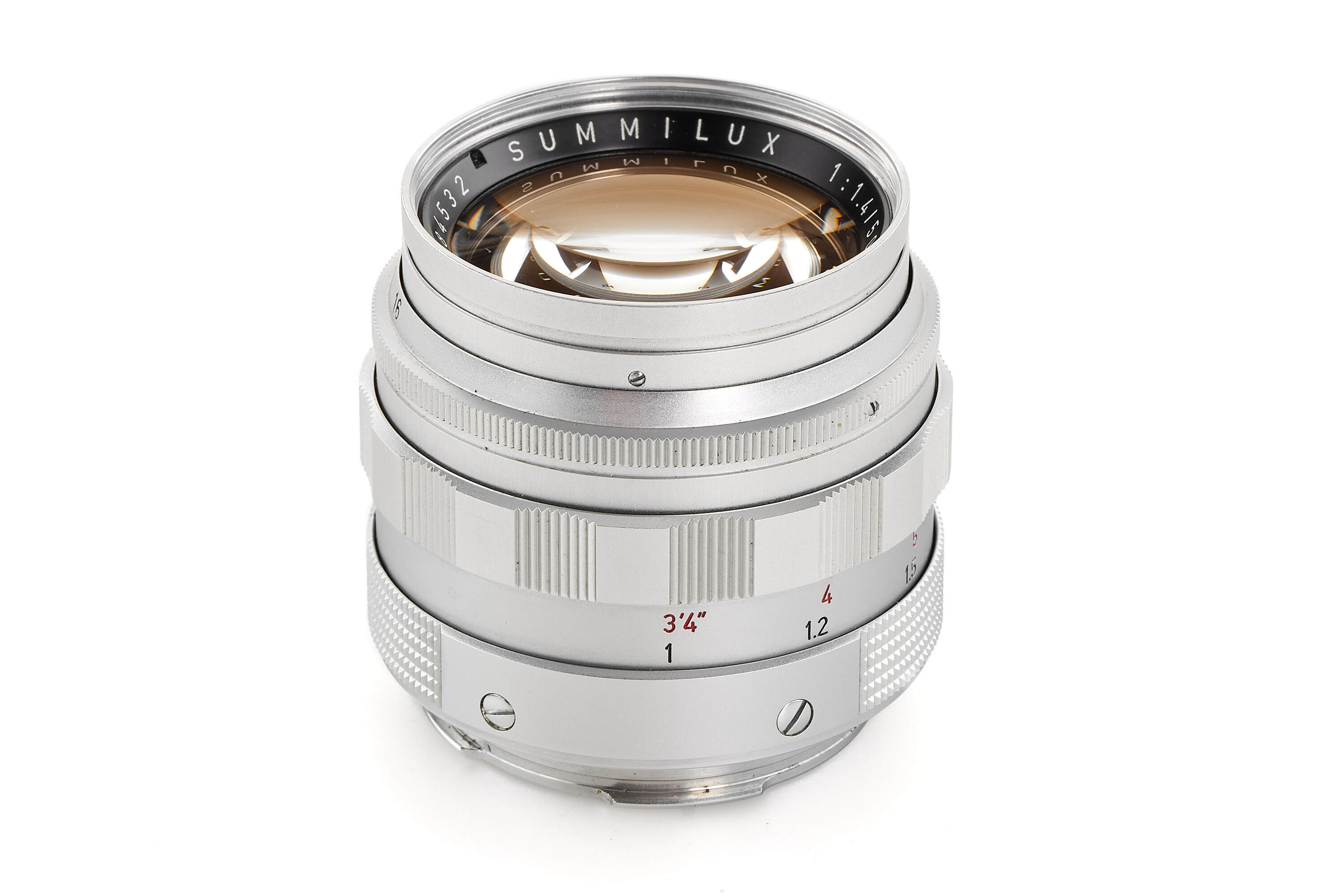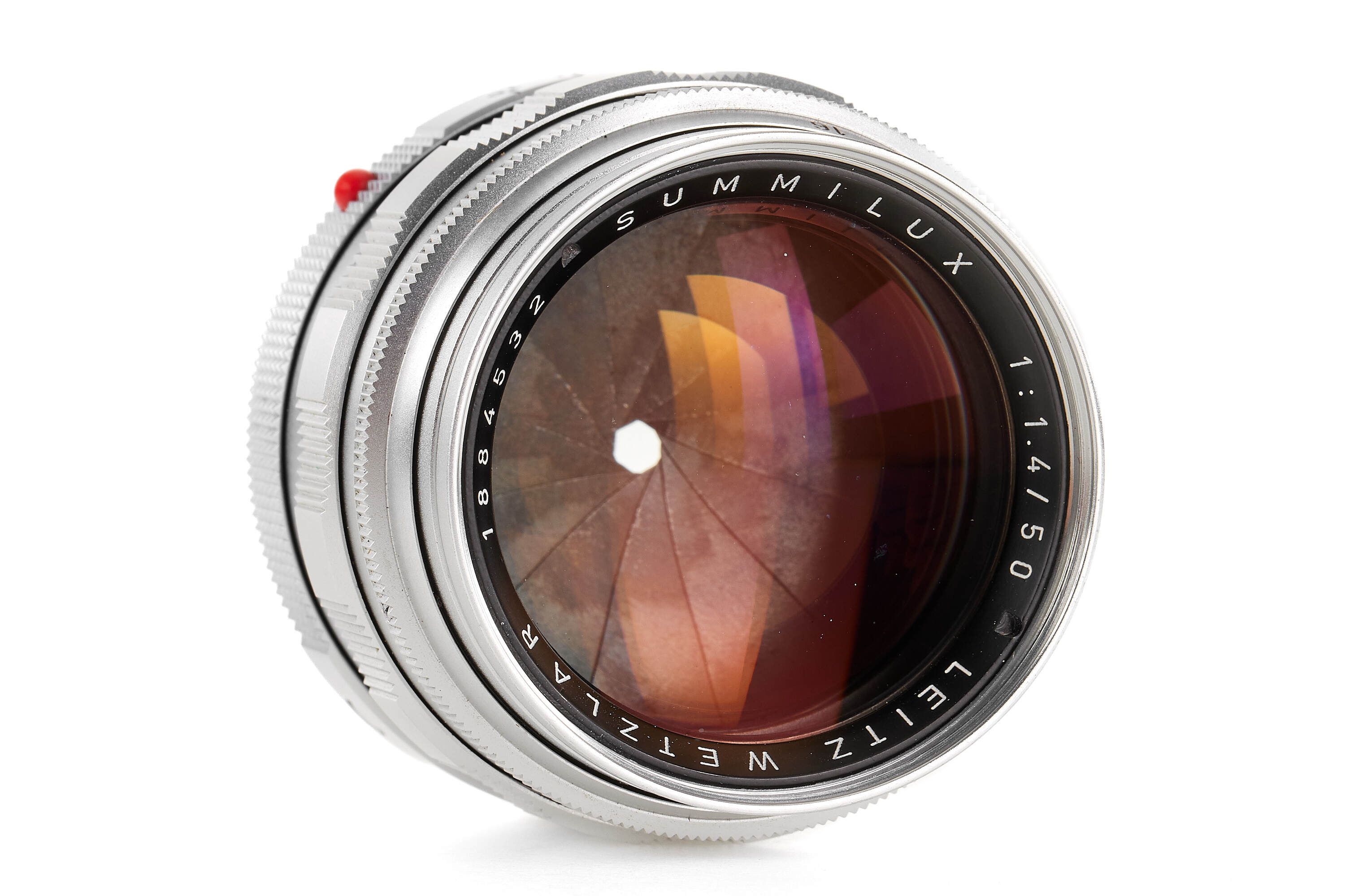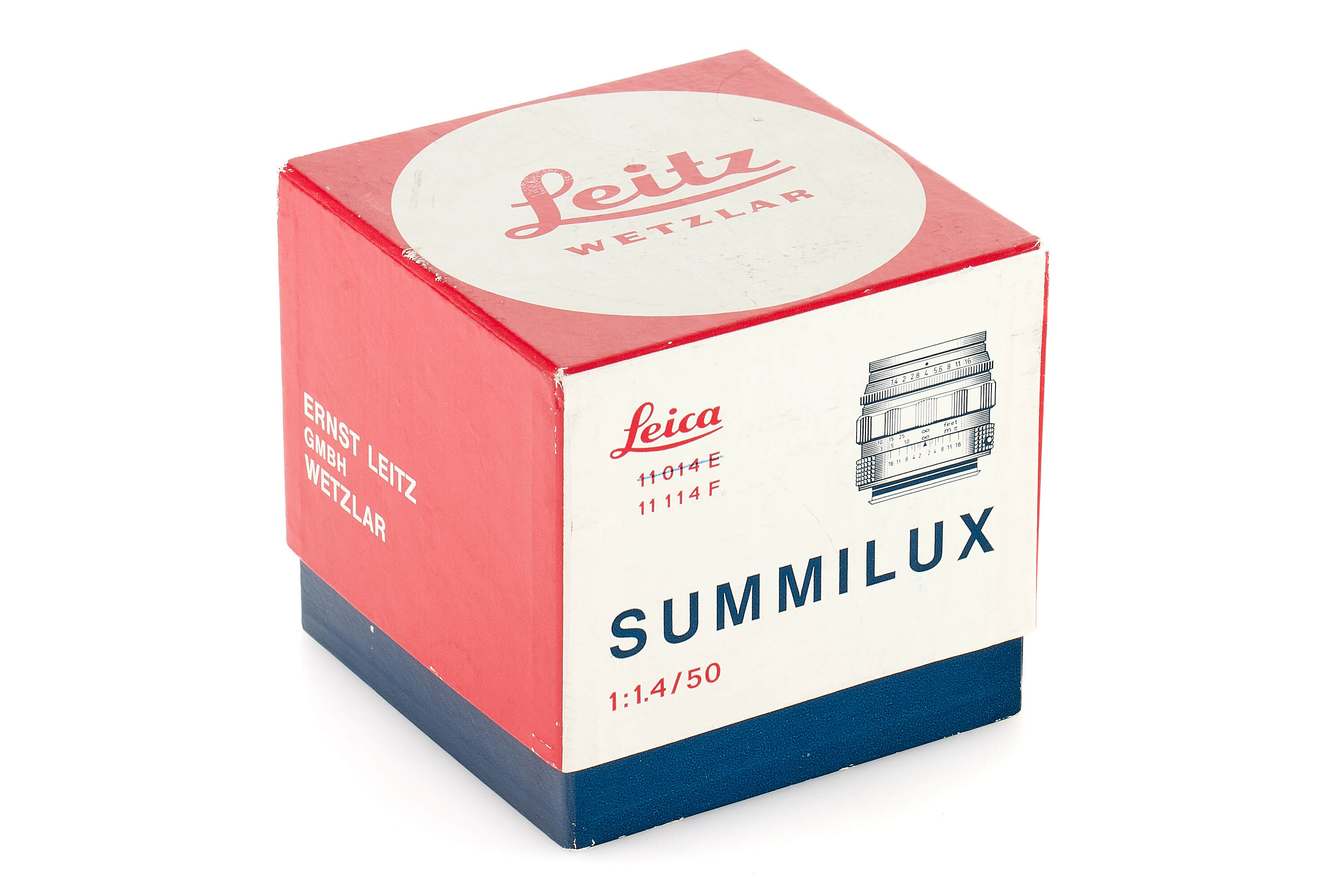 Beautiful quite early M-mount Summilux 50mm in mint condition, clean and clear optics, with front cap, hood 12521G, plastic keeper and maker's box.