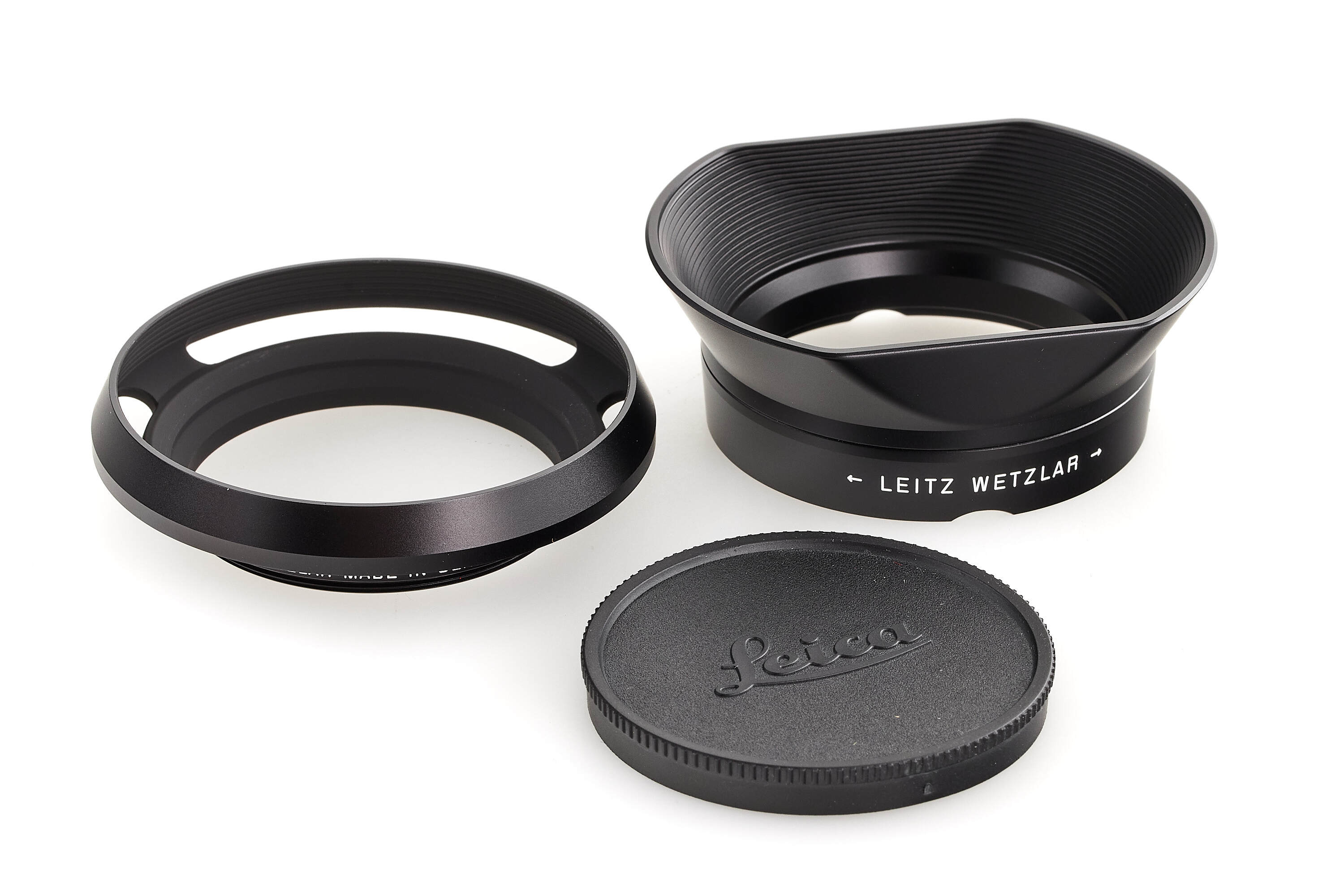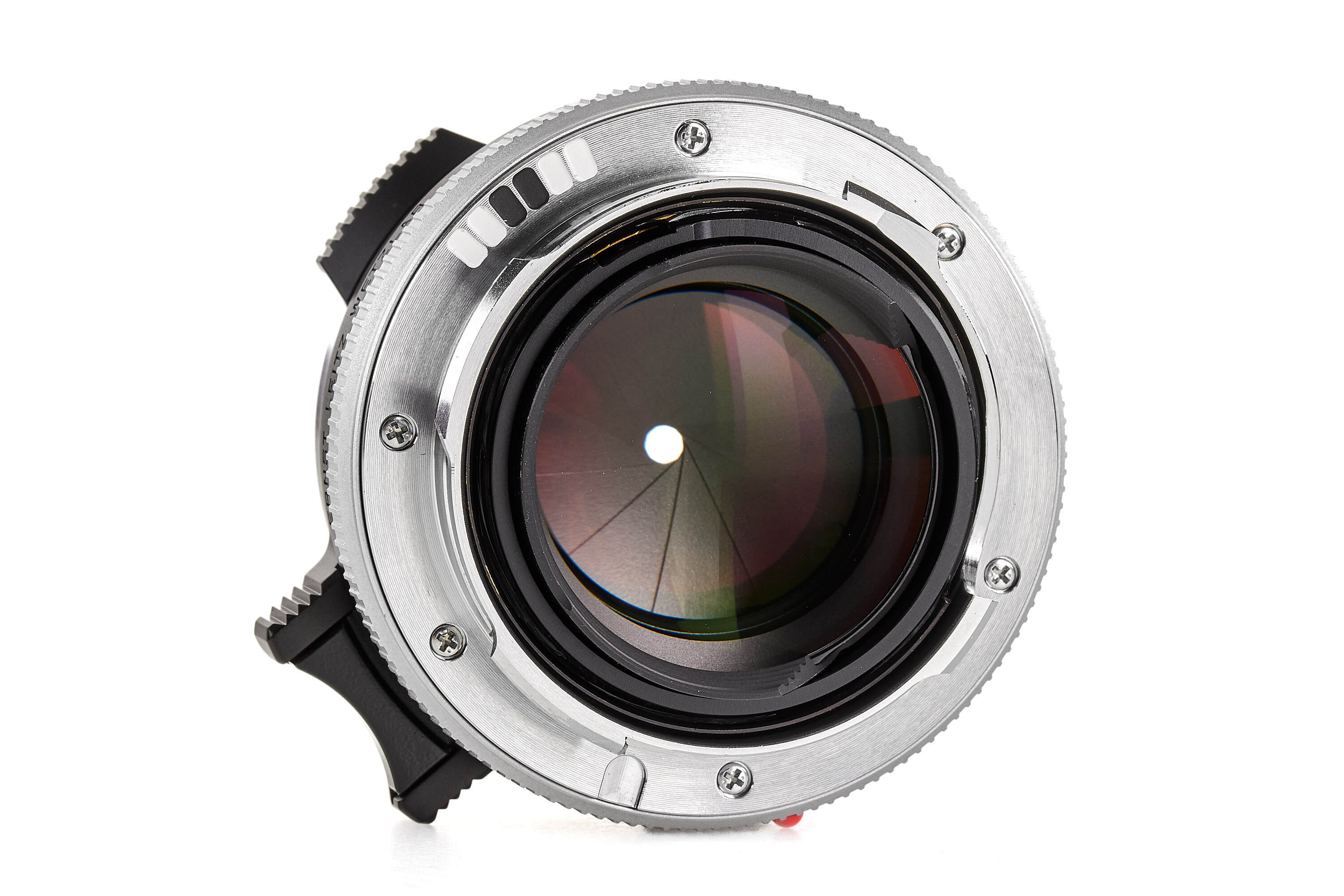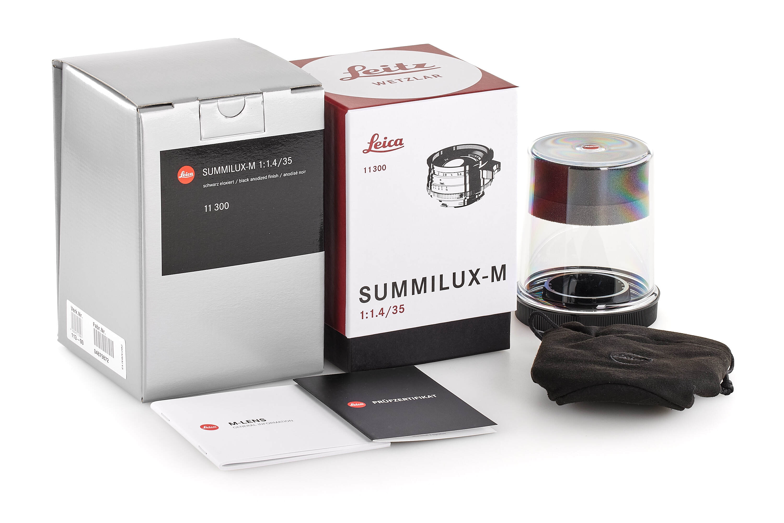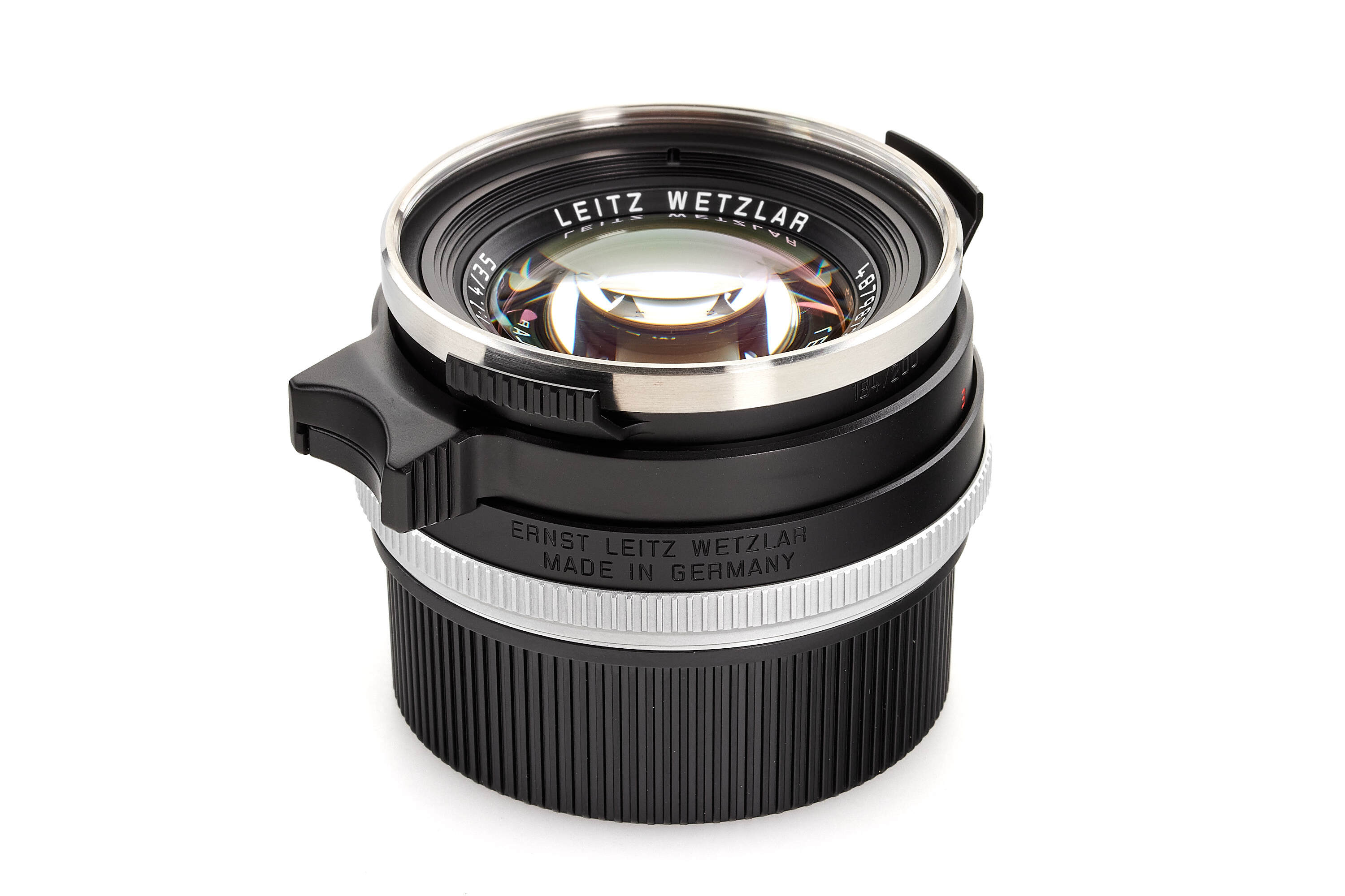 Beautiful re-issue of the sought-after so-called 'Steel Rim' early Summilux 35mm from 1961, in black anodized finish and, like the original, silver stainless steel rim, black painted brass infinity lock button and 'Leitz Wetzlar' engravings, limited to 200 numbered lenses, no.4879872 with special number no.184/200, complete with accessories, papers and boxes, in perfect, unused condition.