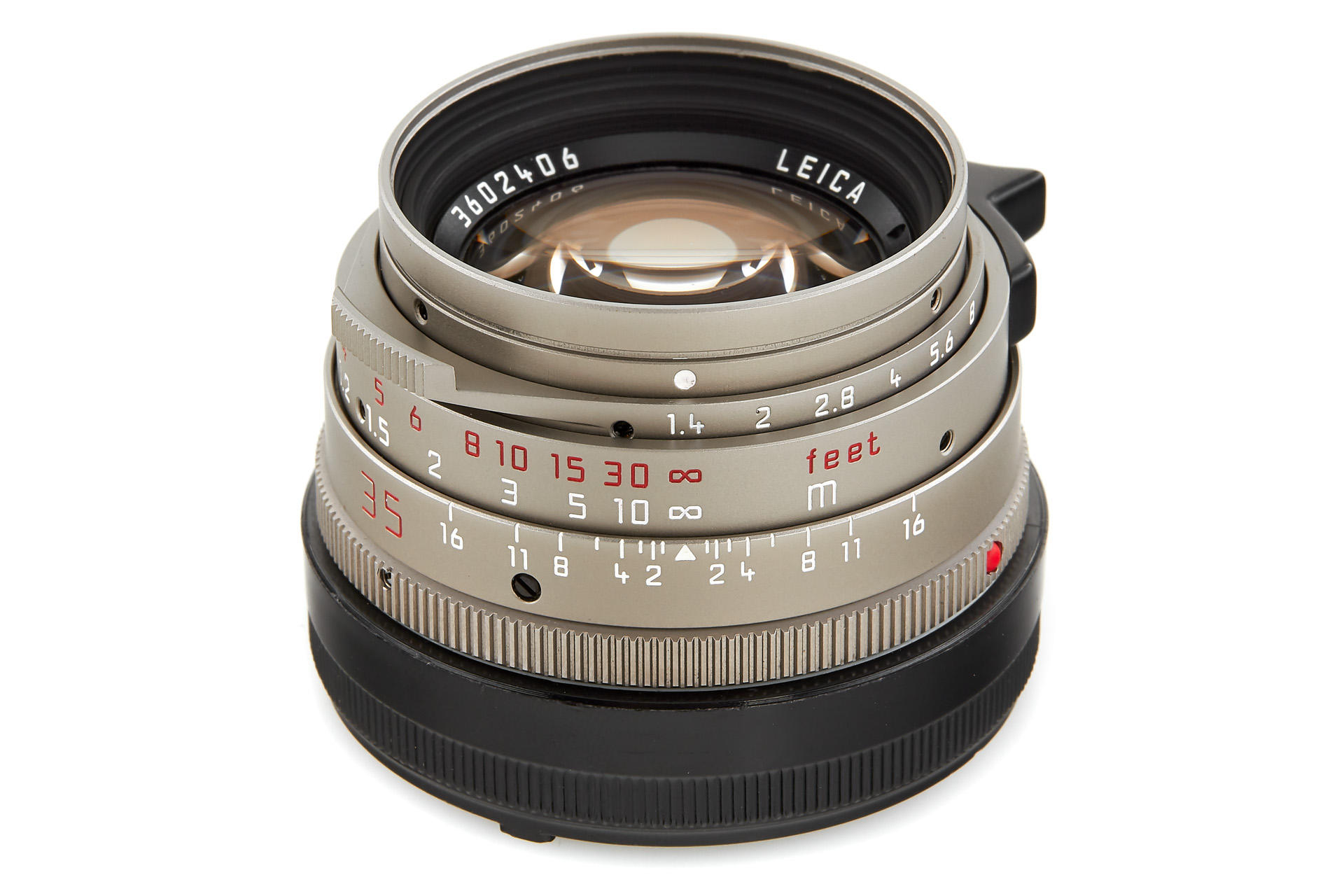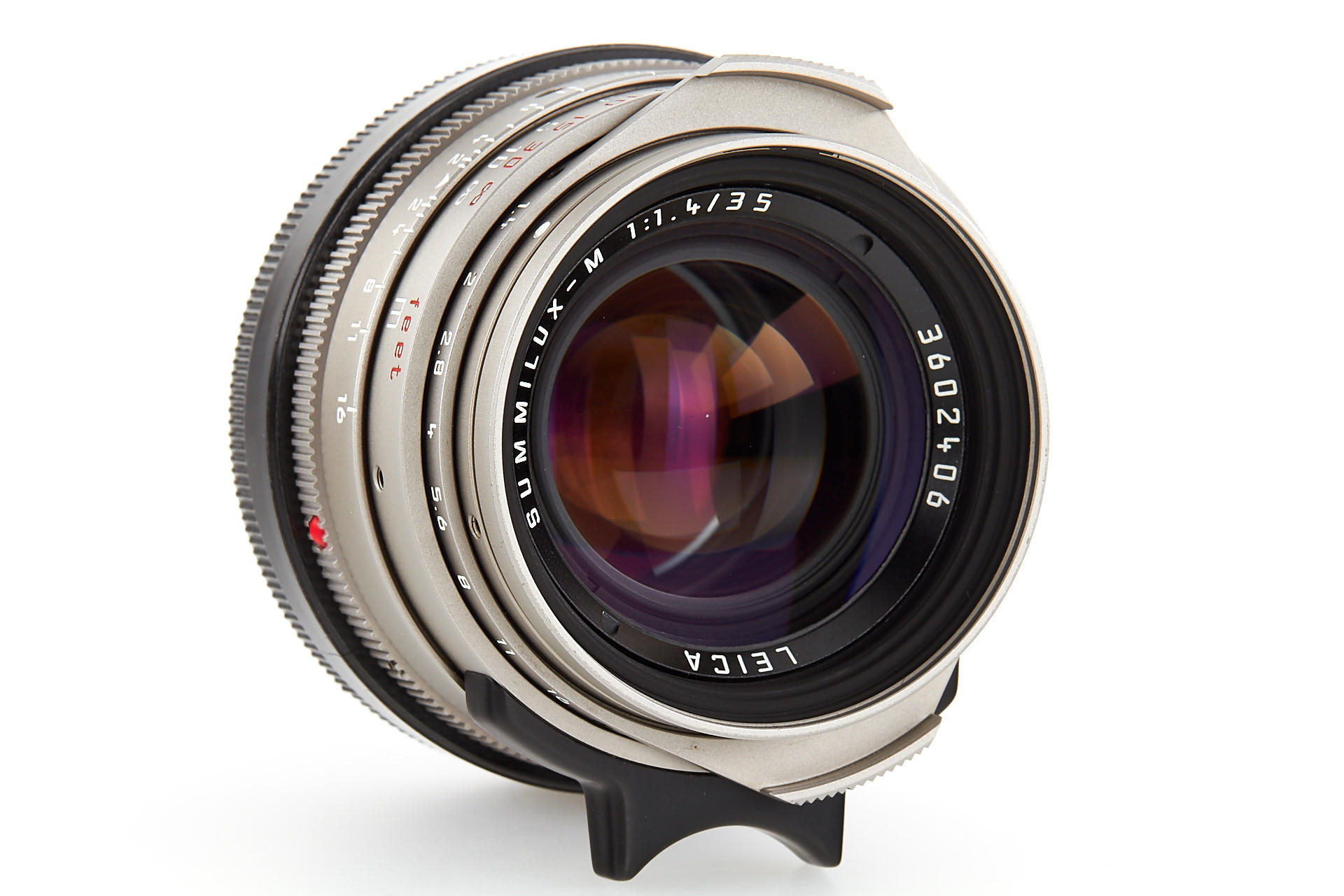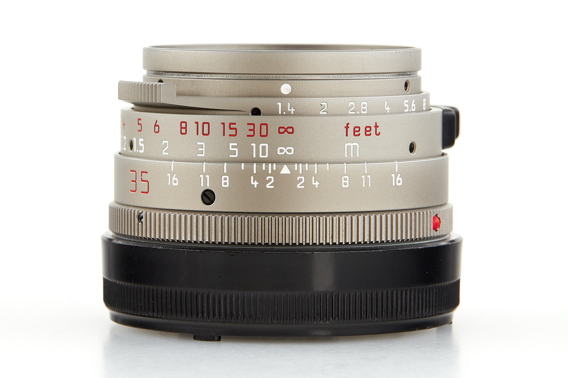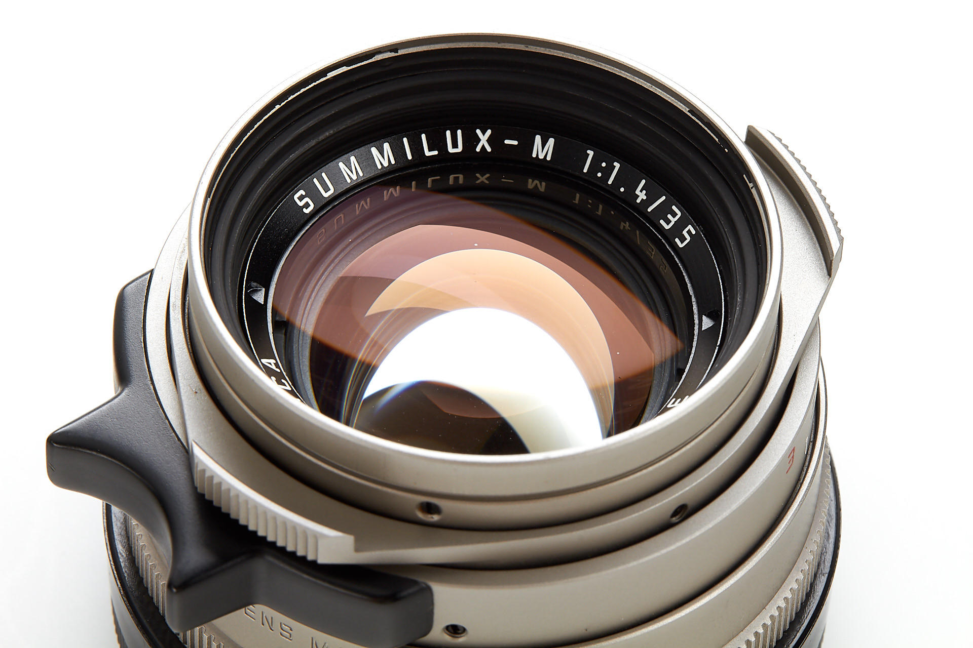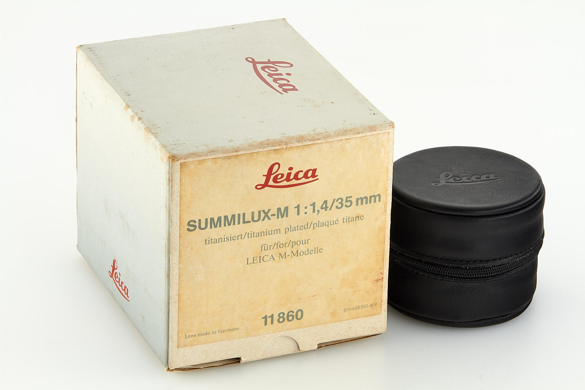 quite rare pre-Aspherical Titanium Summilux-M 1.4/35mm in near-mint condition, clean lenses, with caps (chrome front cap), leather keeper, matching maker's box