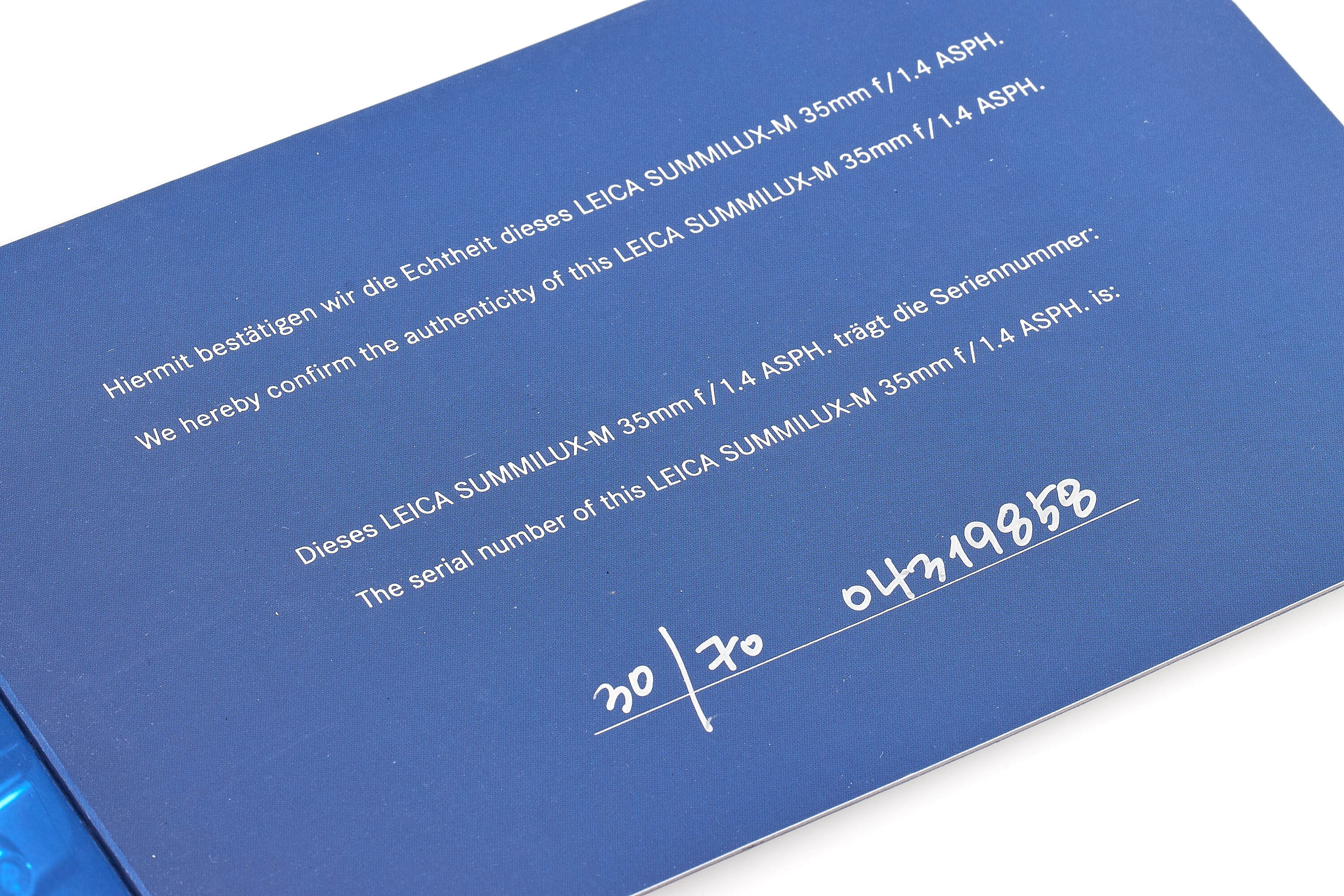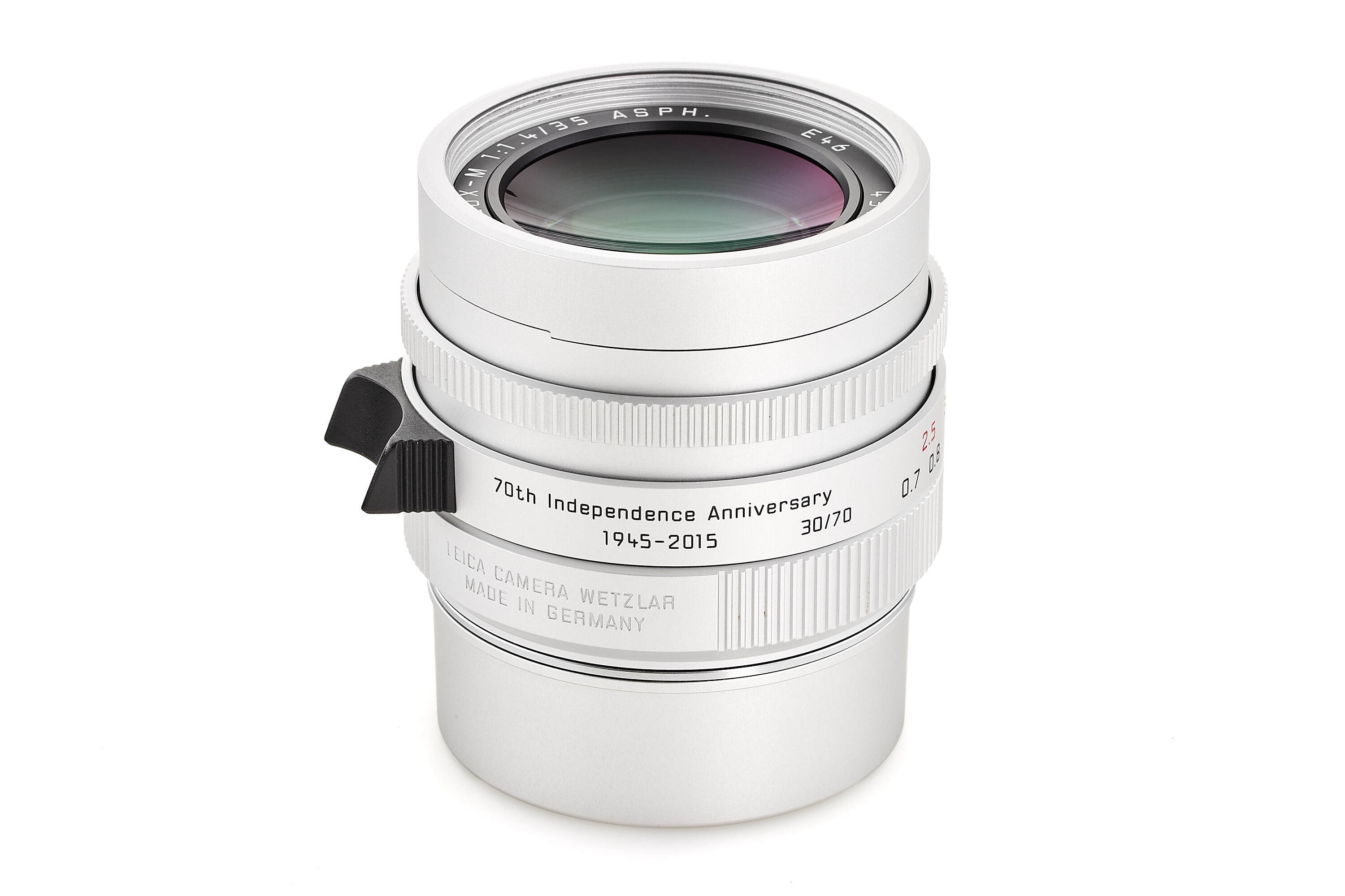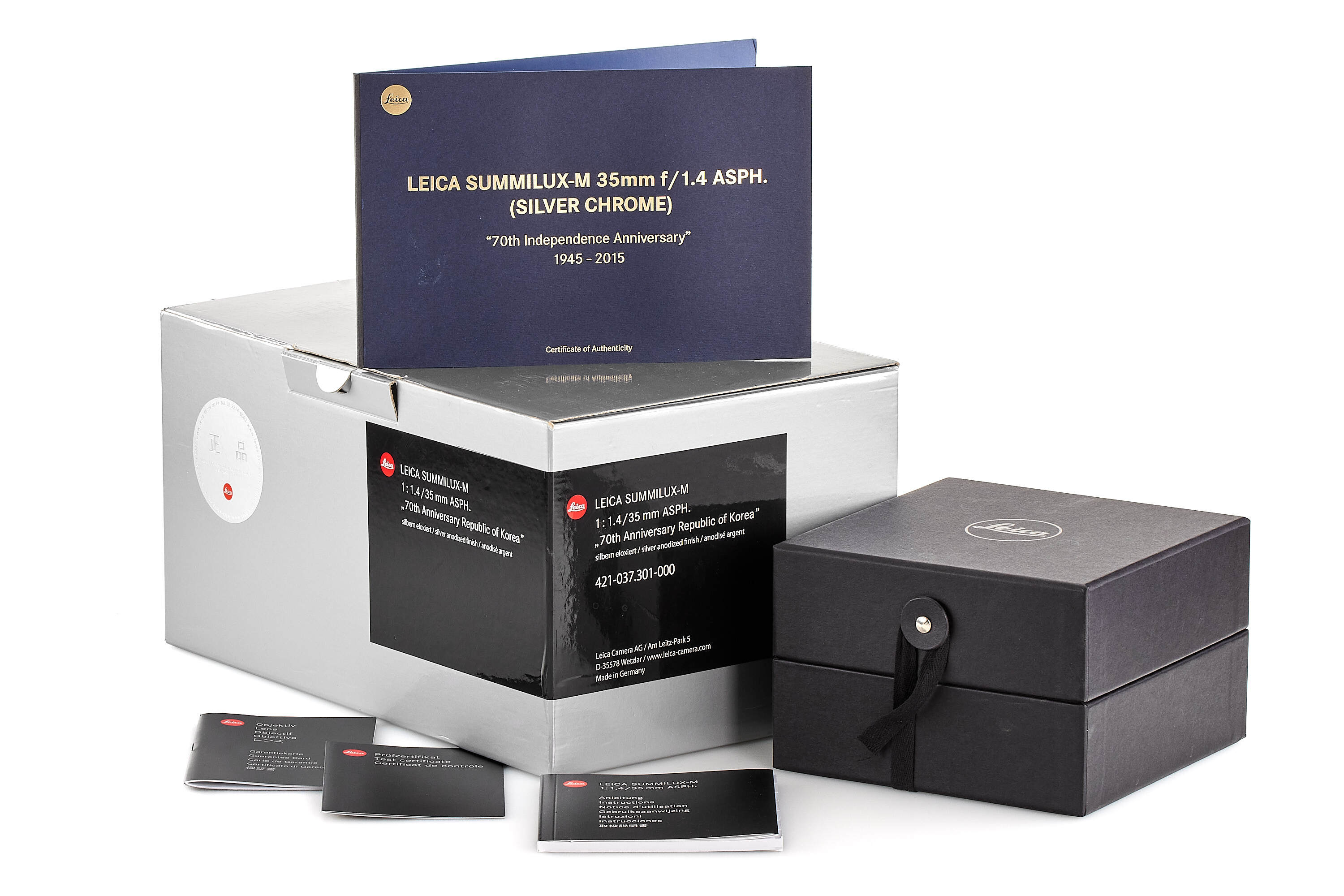 Beautiful chrome Summilux 35mm Asph. from the limited edition of 70 lenses issued to commemorate 70th anniversary of Korea independence, lens no.4319858 in absolutely mint condition, complete with all accessories, original packaging, papers, keeper and certificate.