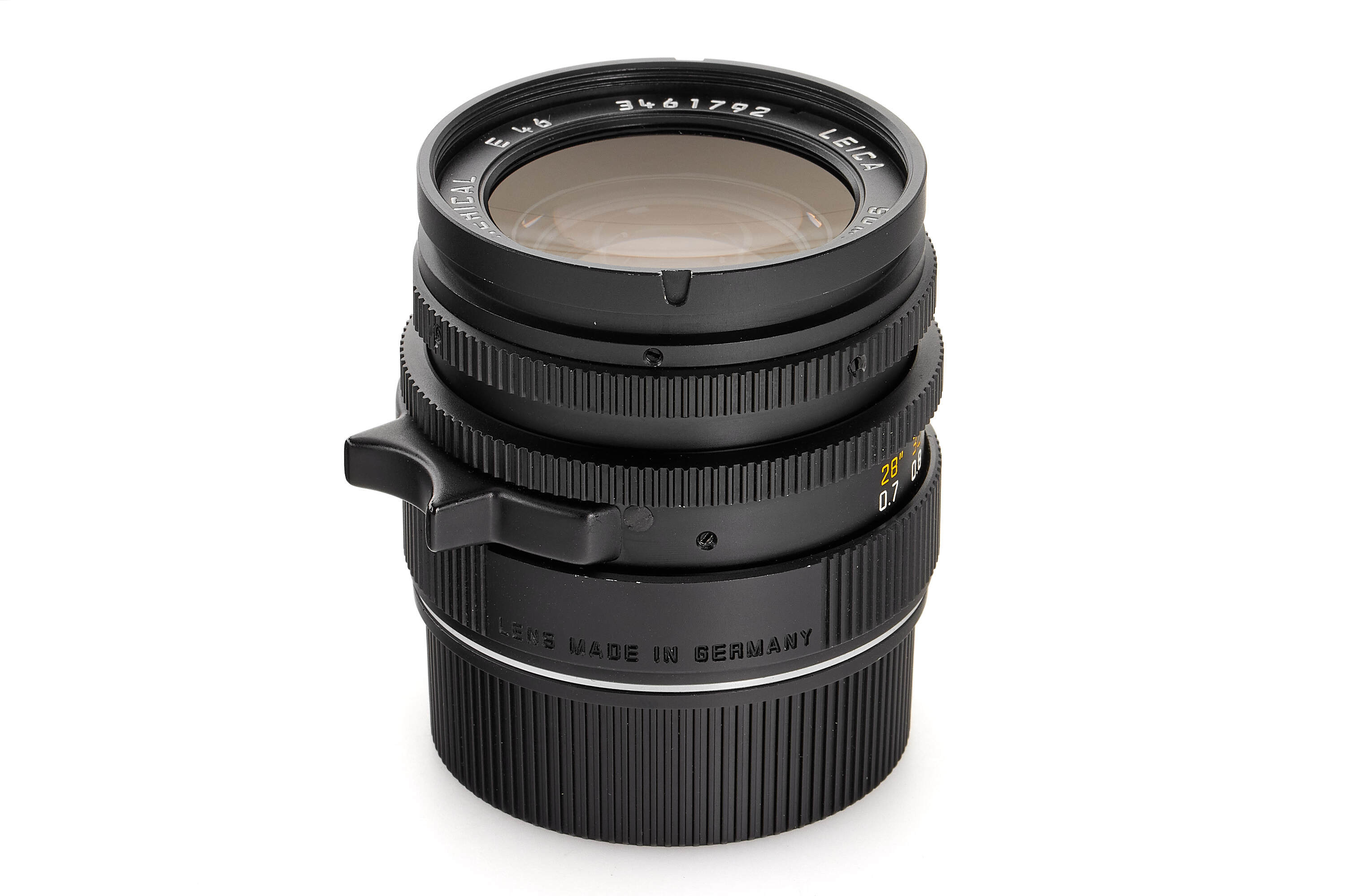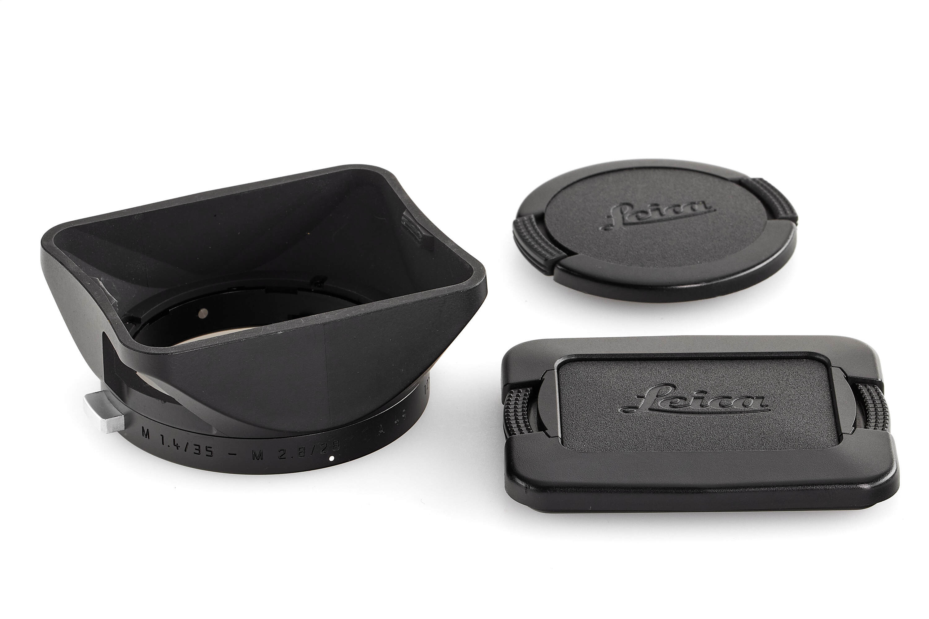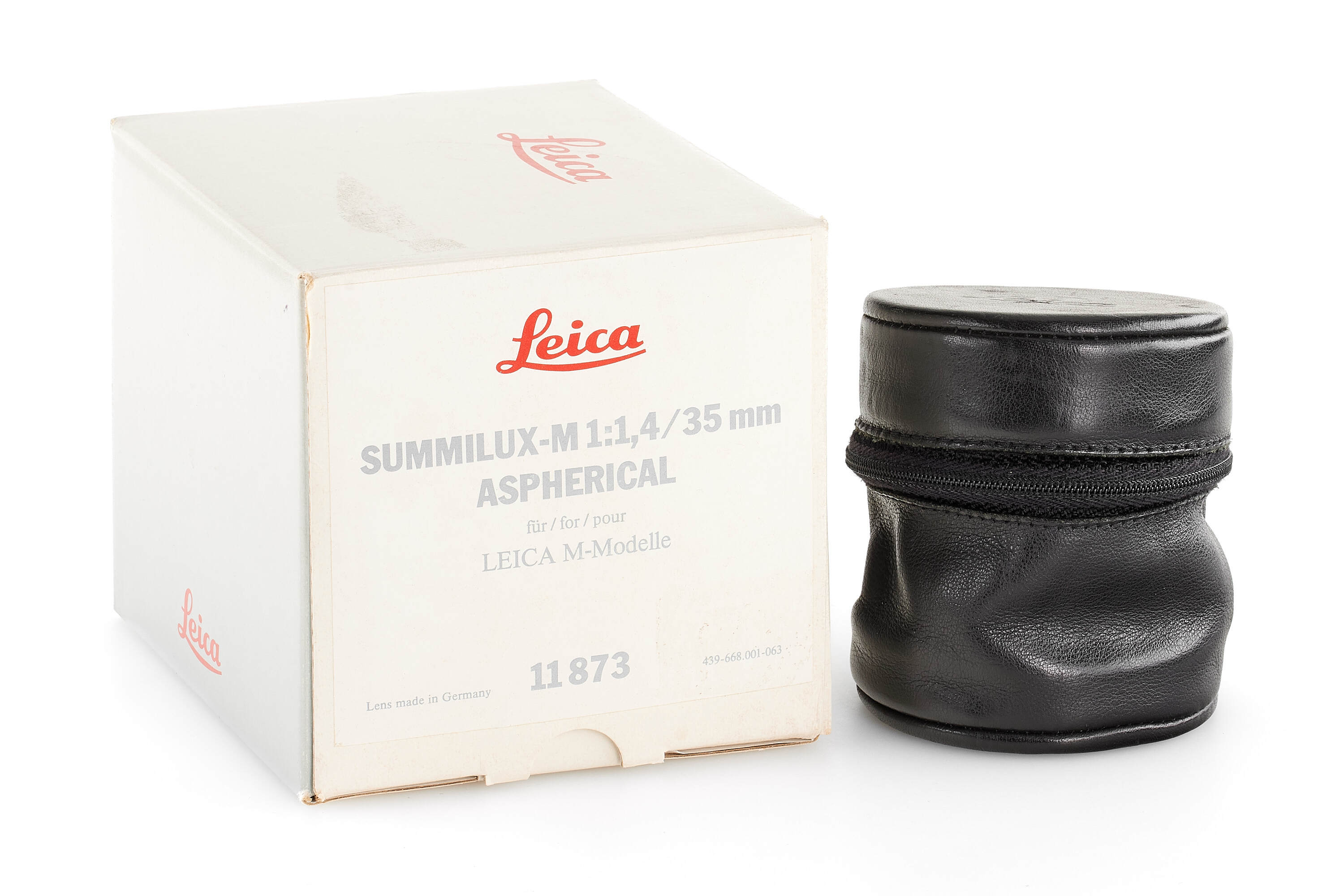 Very rare sought-after first version with 2 aspherical surfaces, only about 2000 units produced, in almost mint condition, clean and clear optics, recognizable by the 'Aspherical' engraved on the front ring (later 'Asph.'), with both caps, hood 12587 (with cap), leather pouch (cond. B/A) and original maker's box.