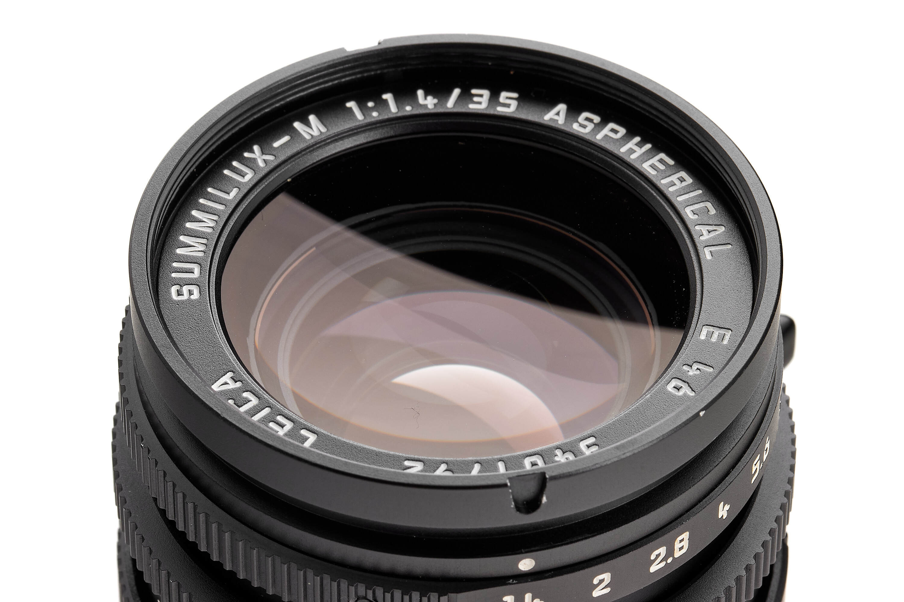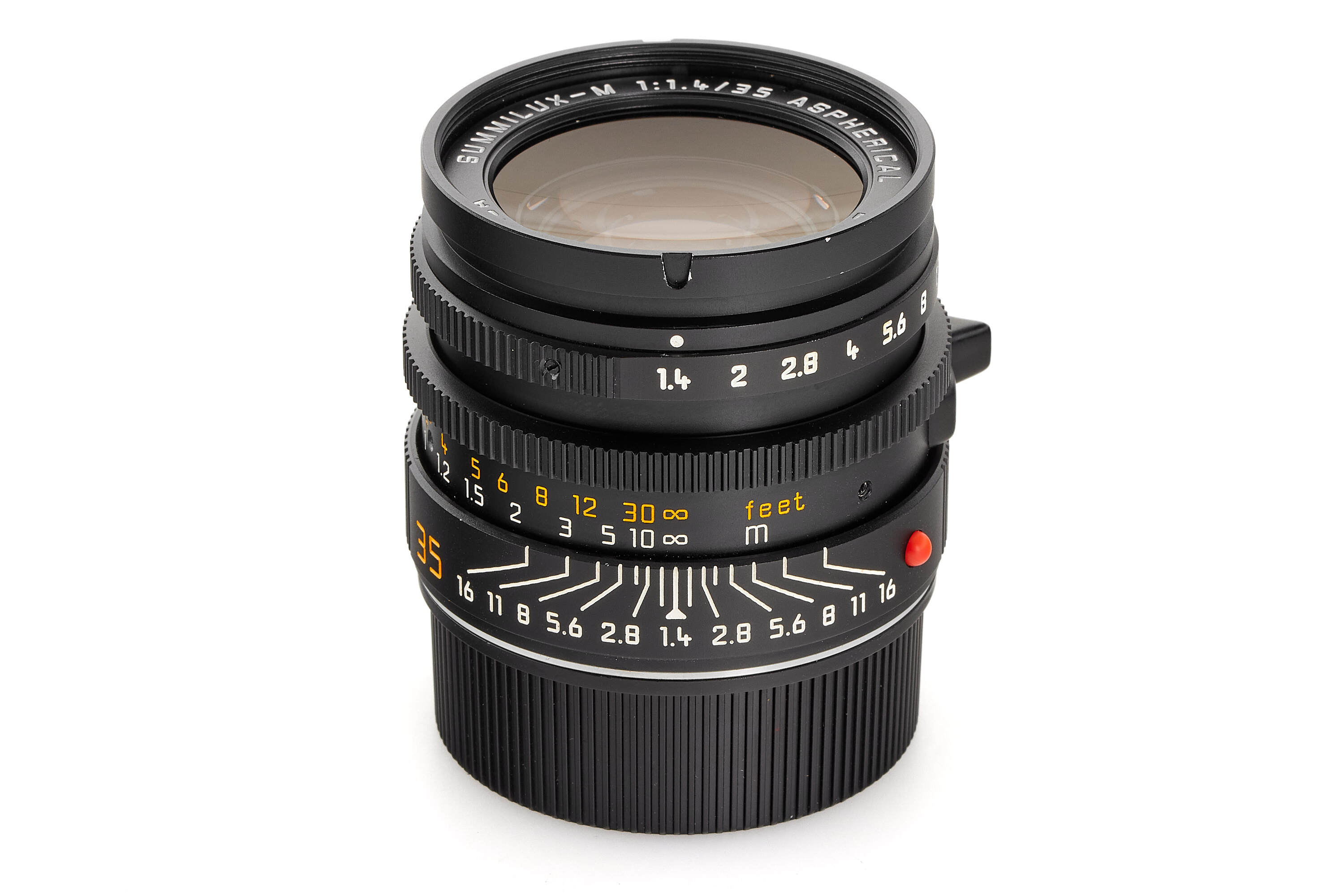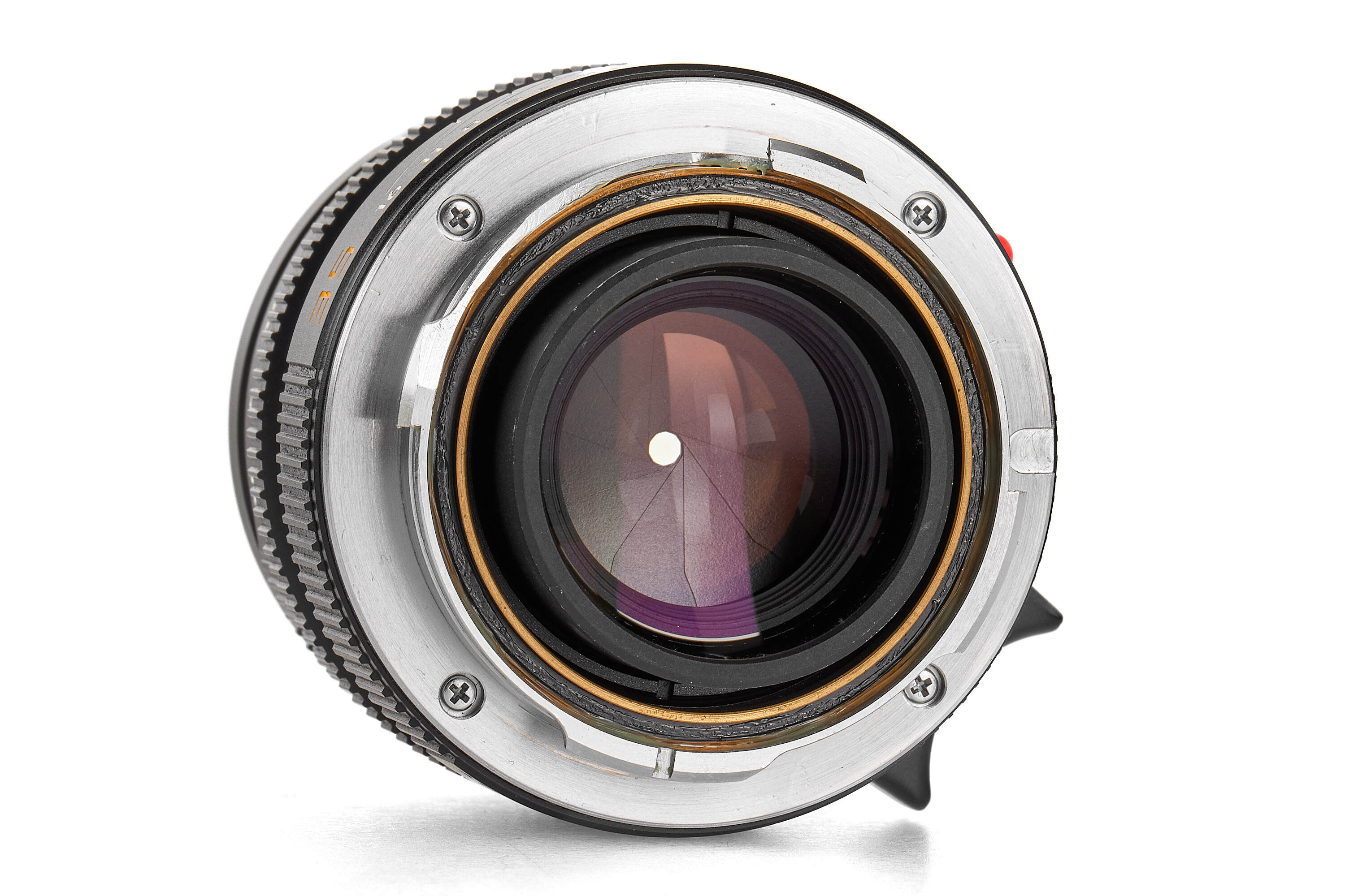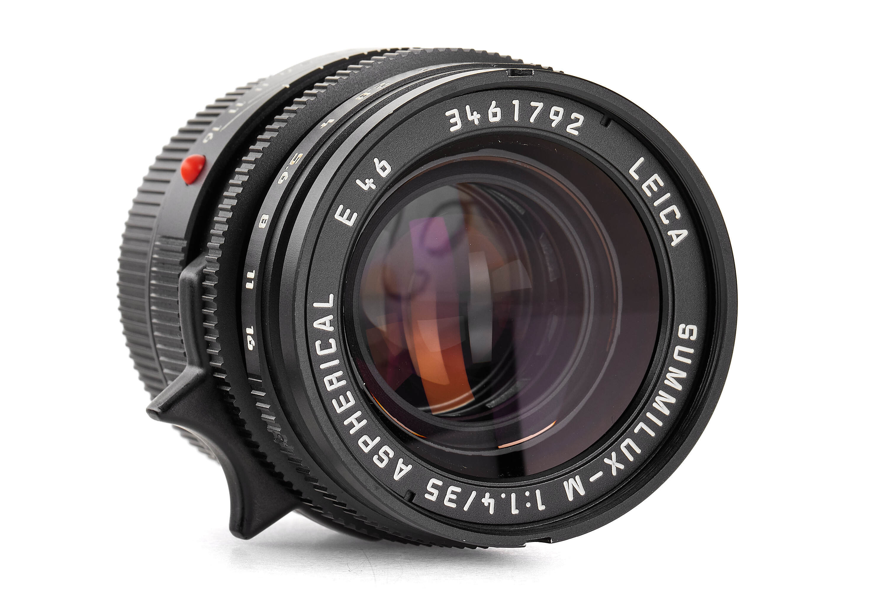 Very rare sought-after first version with 2 aspherical surfaces, only about 2000 units produced, in almost mint condition, clean and clear optics, recognizable by the 'Aspherical' engraved on the front ring (later 'Asph.'), with both caps, hood 12587 (with cap), leather pouch (cond. B/A) and original maker's box.